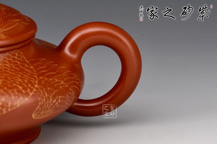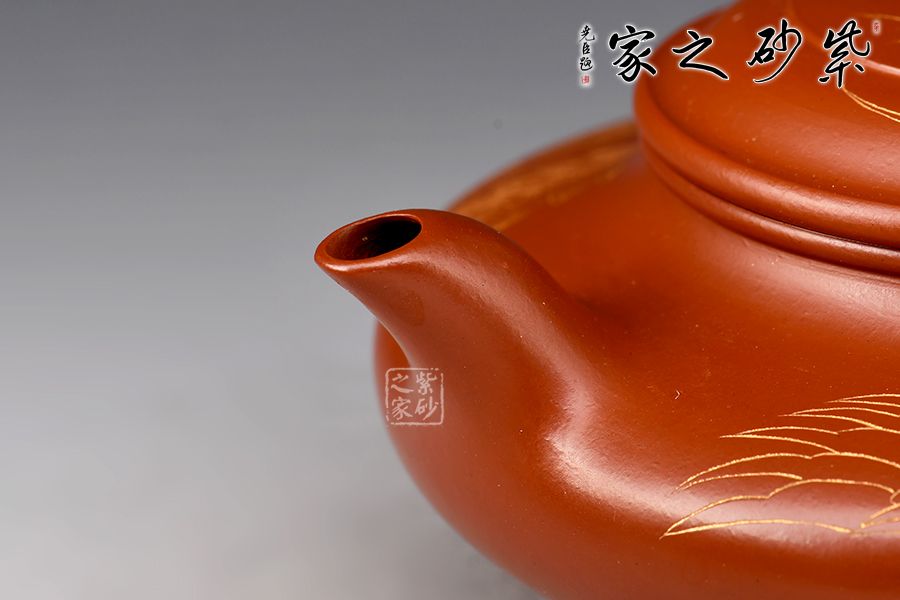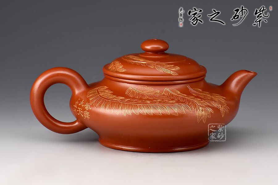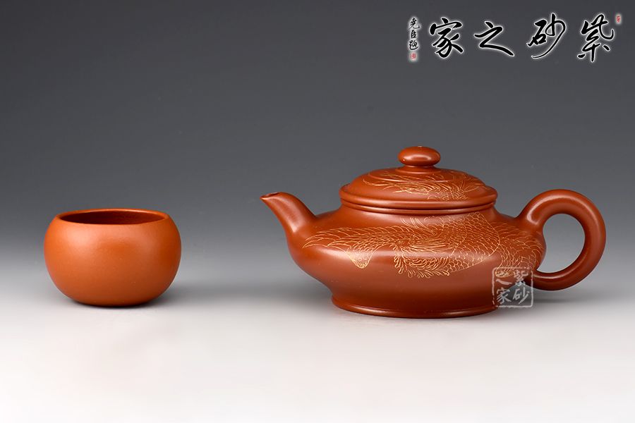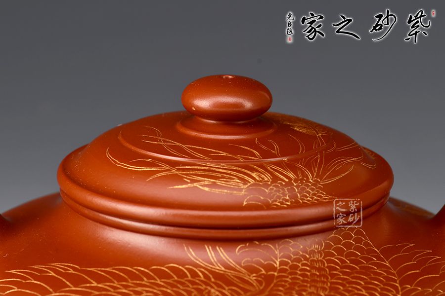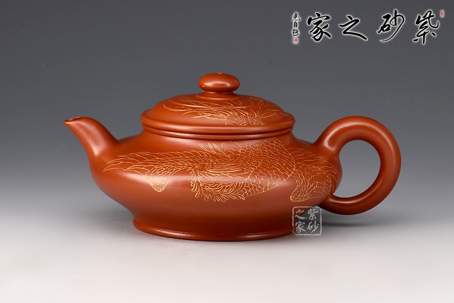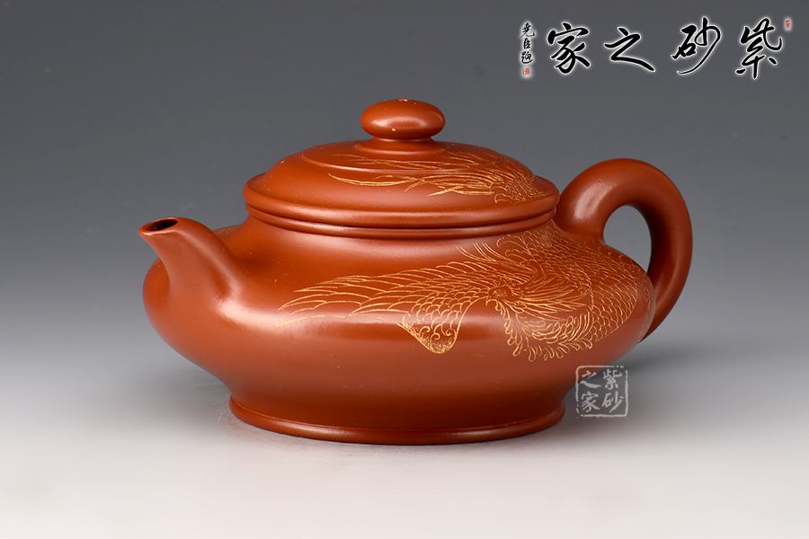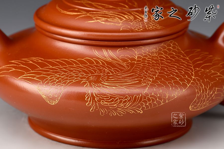 此件虛扁為作者選用大紅袍,全手工精制而成,泥色明亮,觸之細(xì)膩,手感及泡養(yǎng)效果皆佳。虛扁的全手制作難度很大,力要勻,又不能塌,足見作者扎實(shí)的制壺功底。壺身扁而蘊(yùn)力,合而中虛,大口蓋投茶便利,彎流、圈把形態(tài)纖巧,比例協(xié)調(diào)。整壺線面屈曲和諧,形雖扁而氣卻昂,實(shí)用精工小品,適合把玩泡養(yǎng)。此外,壺身刻繪鳳凰,神韻靈動,栩栩如生