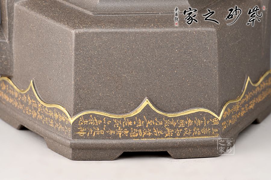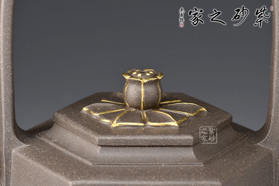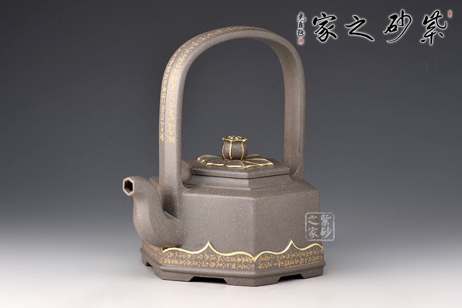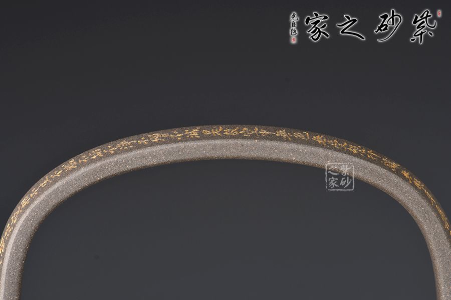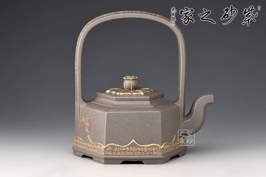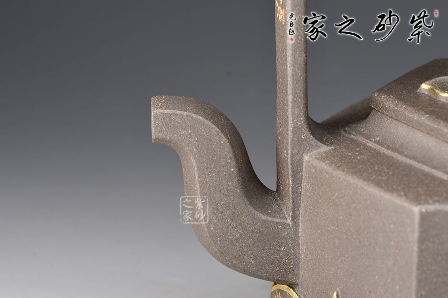 提梁這一特定元素,氣勢(shì)磅礴,凝重古樸,猶如拔地而起的山之脊梁,讓整體造型顯示出大氣挺拔的質(zhì)感,滿身滿景都是化不開的造型語言。不僅如此,壺底描金加以裝飾,華麗富貴。