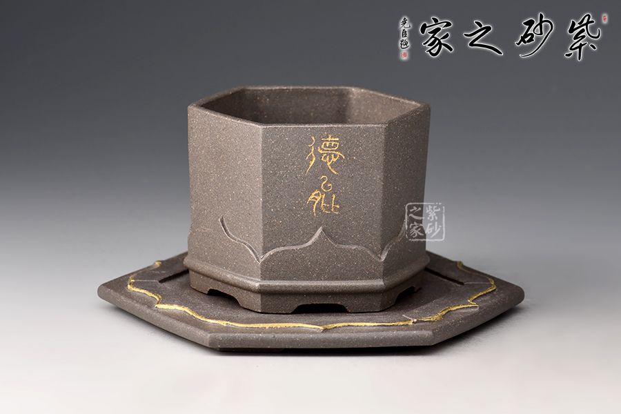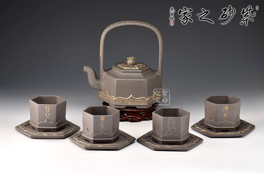 此壺為套組,一壺,四杯,四杯墊,同工同料。壺身雖成六方之態(tài),然而六方中隱約顯出圓擴(kuò)之感,透現(xiàn)出特定的張力,鈕、蓋與壺肩層層沿襲一致的呼應(yīng),節(jié)奏與韻律感油然而生。