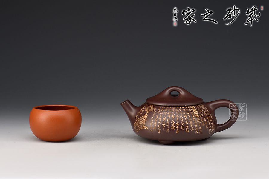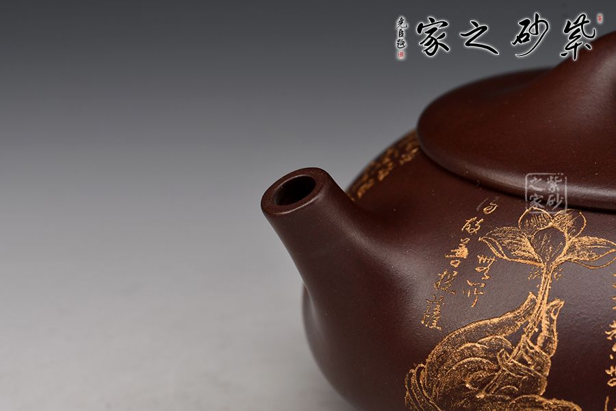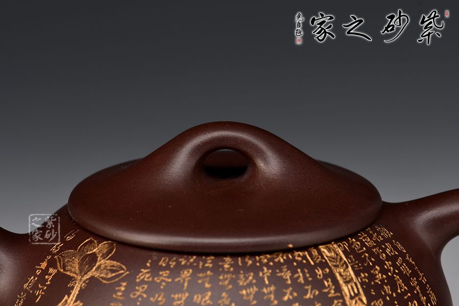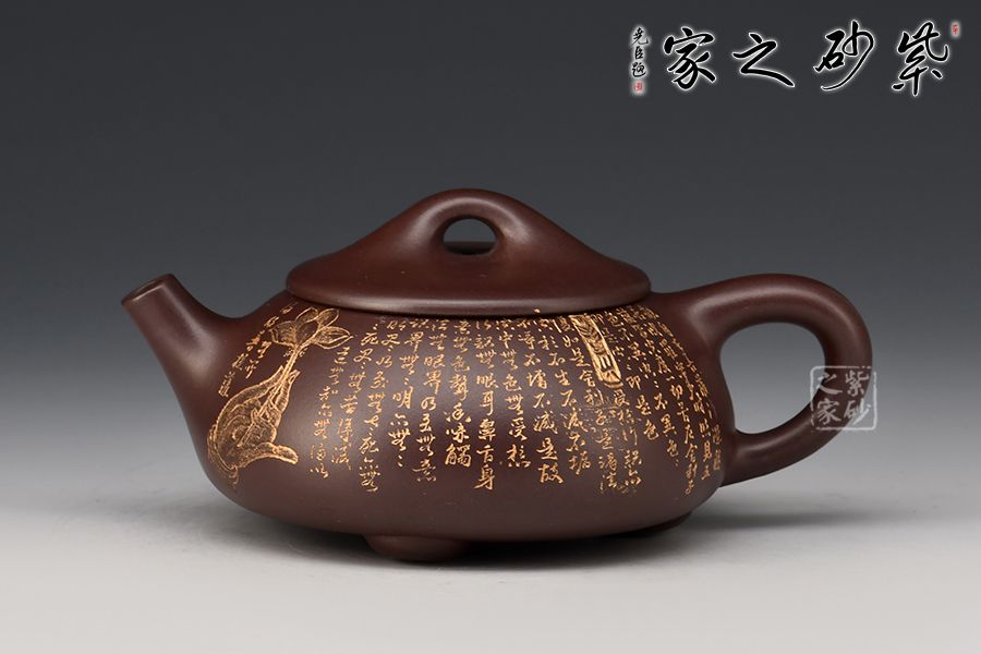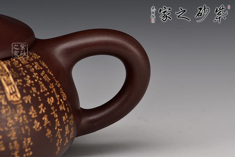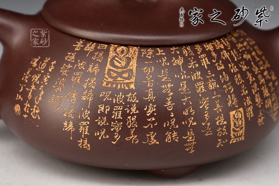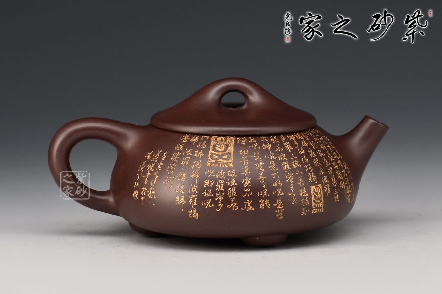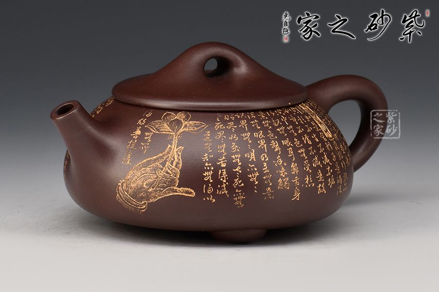 此石瓢壺繼承了傳統(tǒng)的精粹,整個(gè)壺身呈“金字塔形,豐潤飽滿,由于重心下垂使用很穩(wěn)當(dāng),更具有極大的觀賞性,壺嘴的特色在于短小有力,為直筒形,使出水更加有力量順暢,壺鈕采用常見的拱橋造型,使整款壺在簡單中多了一份活力。壺身刻滿心經(jīng),下以三圓足支起全身,使壺顯得挺括有神,沉靜而深意雋永,老師作品升值潛力極大,喜歡的藏友不要錯(cuò)過!