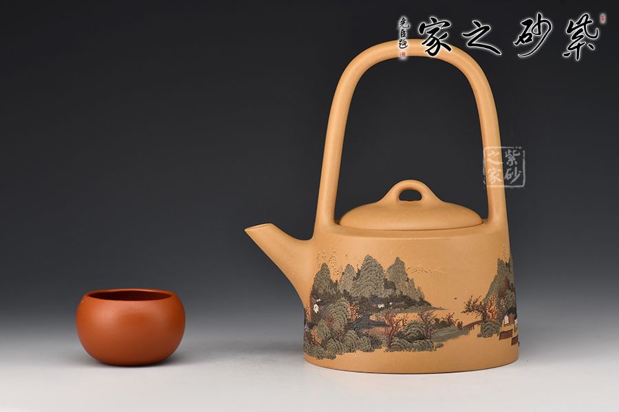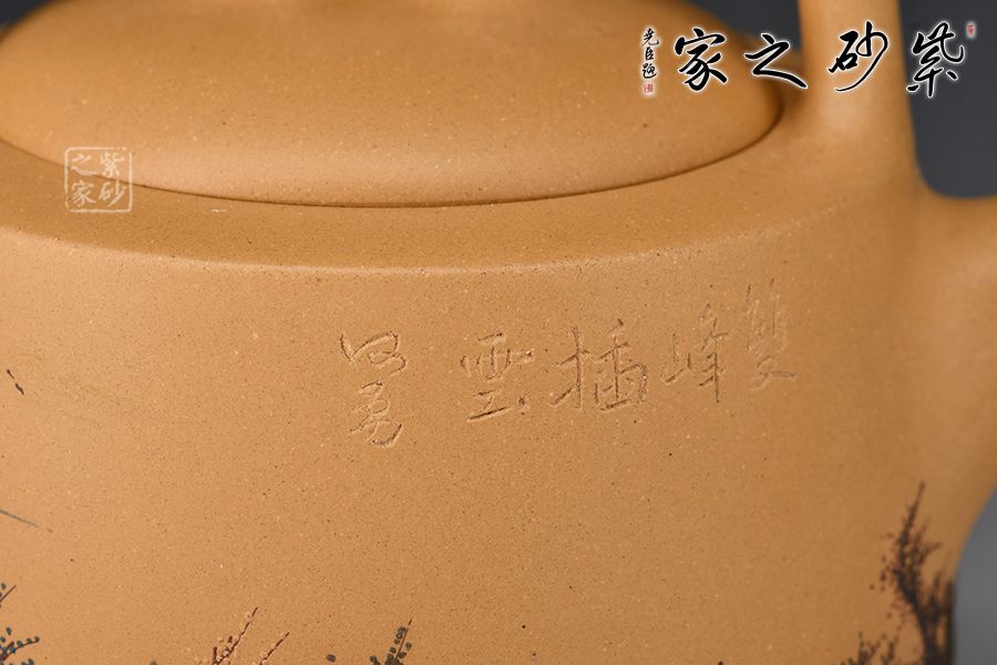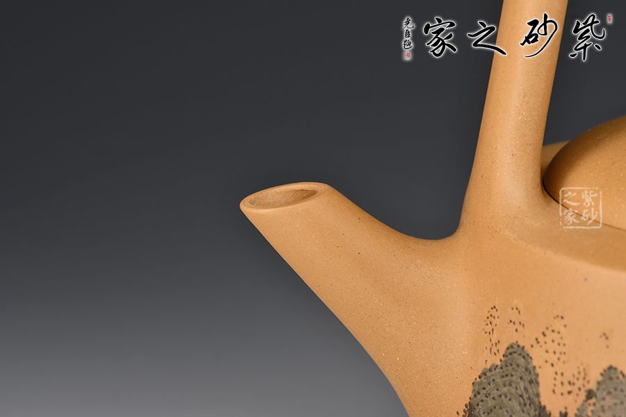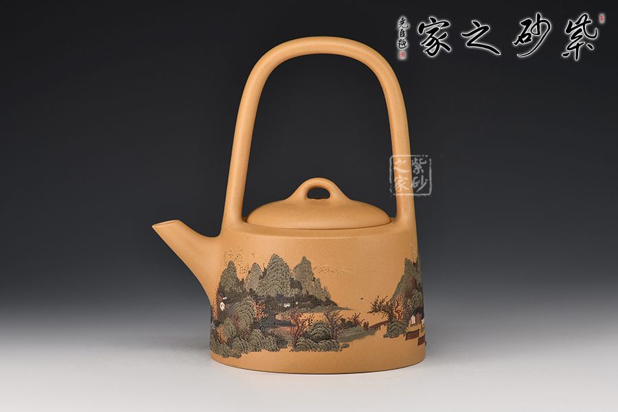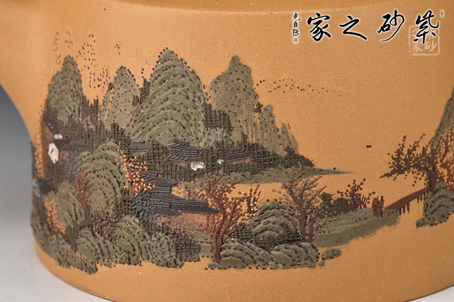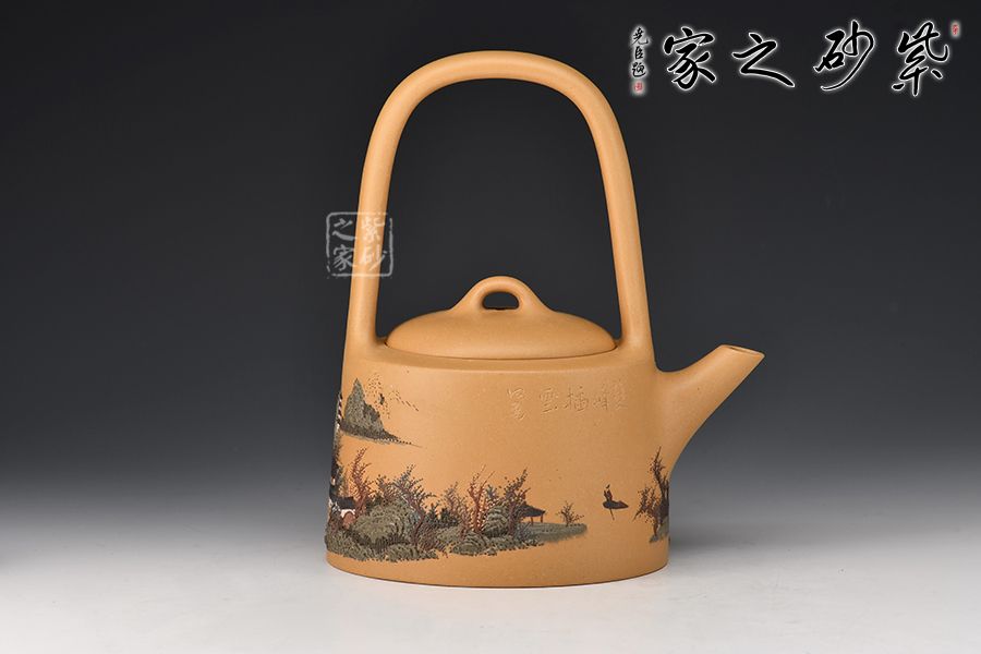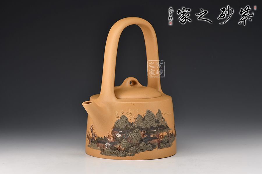 壺身呈圓柱形,圓中寓直,直中寓曲,耐人尋味。壺面刻繪山水人家頗具古意,實(shí)用與美觀一體。提梁硬朗而不失柔潤,與壺身的銜接舒坦自然,壺嘴直而俏,挺俏大方。整體色調(diào)對(duì)比強(qiáng)烈,視覺效果強(qiáng)烈。