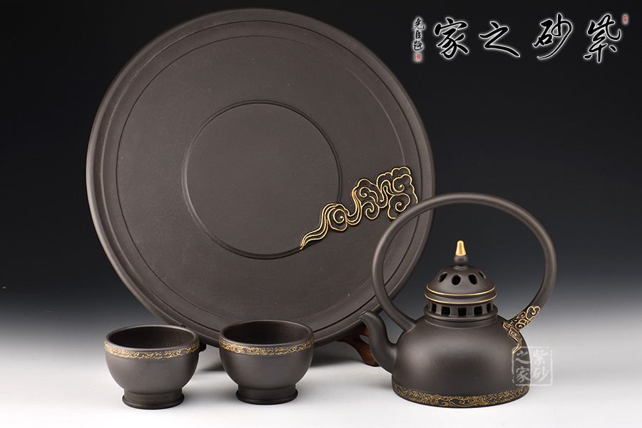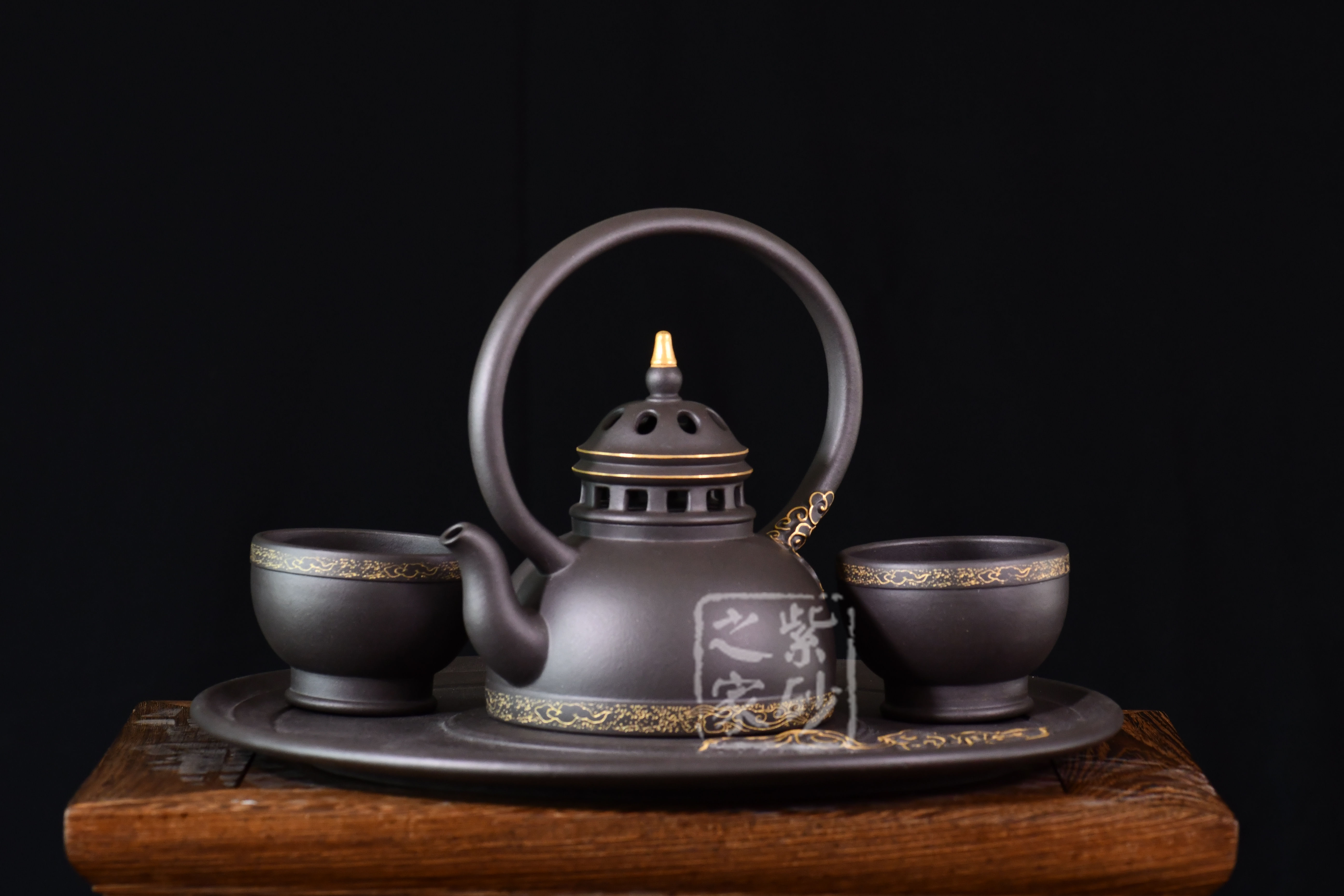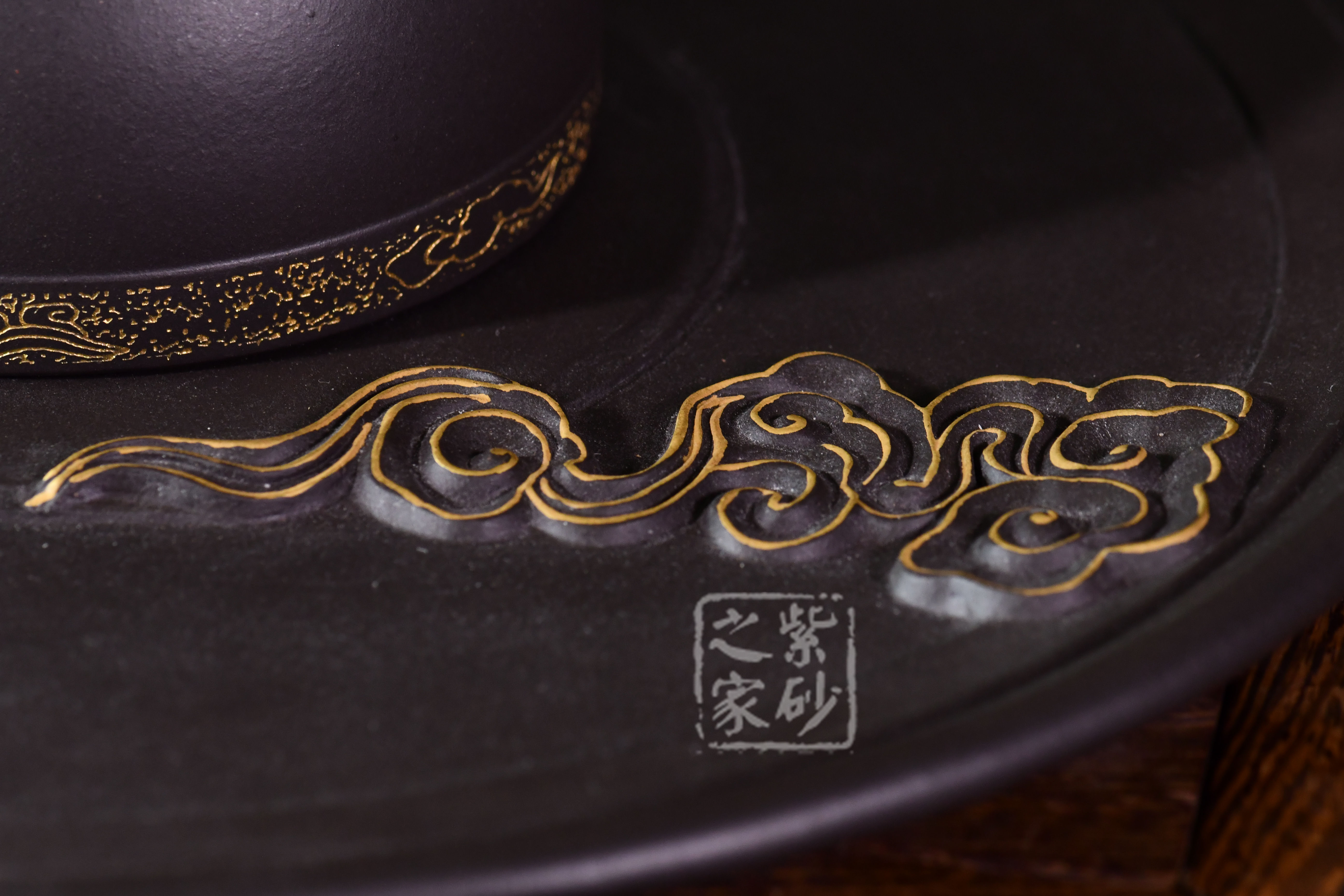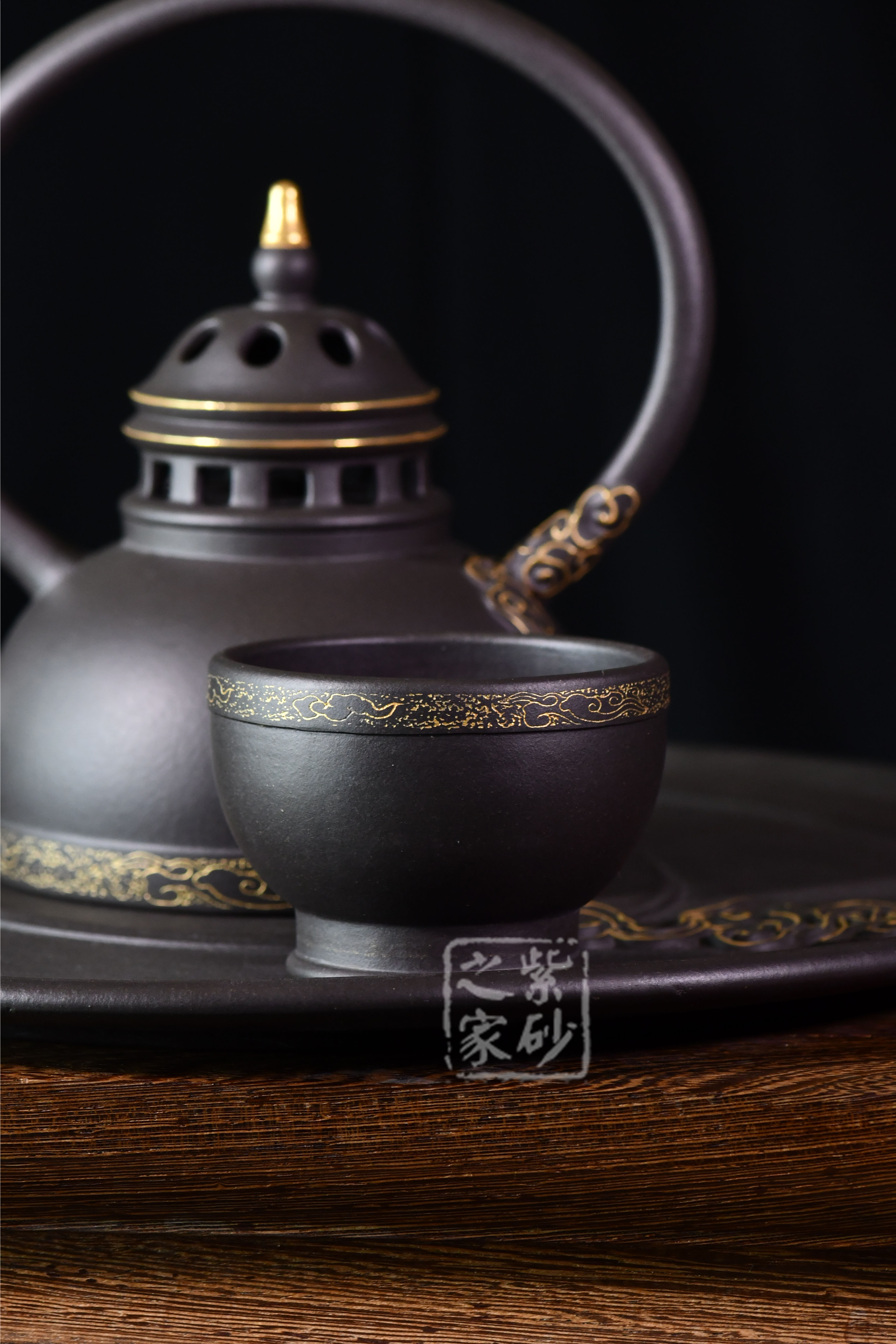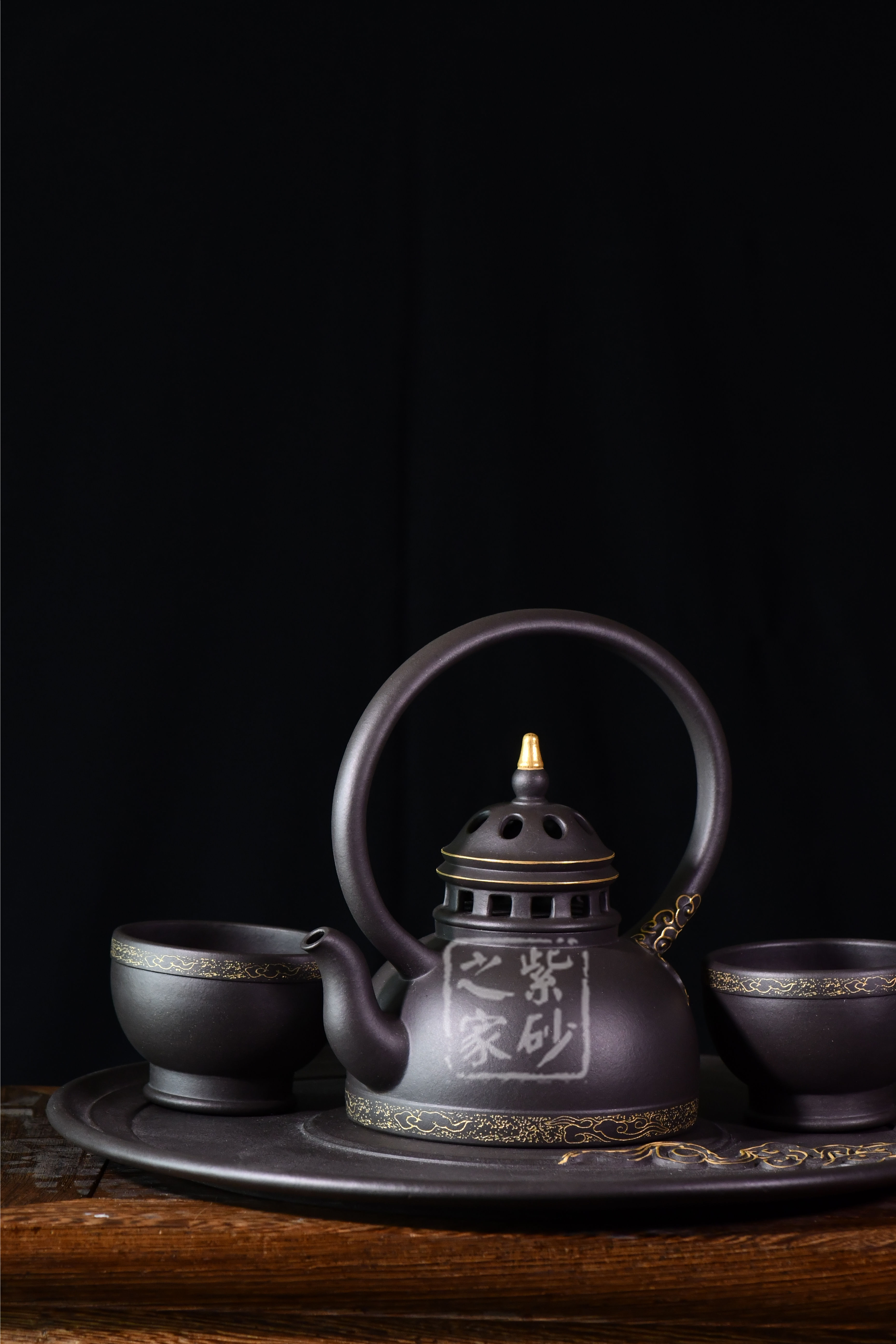 《鎏韻》套組,一壺二杯一盤,選用黑泥全手工精制而成,430cc大品容量,適合2—3人品茗。壺身飽滿圓潤,線條流暢。三彎嘴出水爽利,提梁設(shè)計(jì)獨(dú)特,展現(xiàn)出虛實(shí)有度,突出空間之美,描金裝飾,靈動不失貴氣,茶室高端雅器必選。