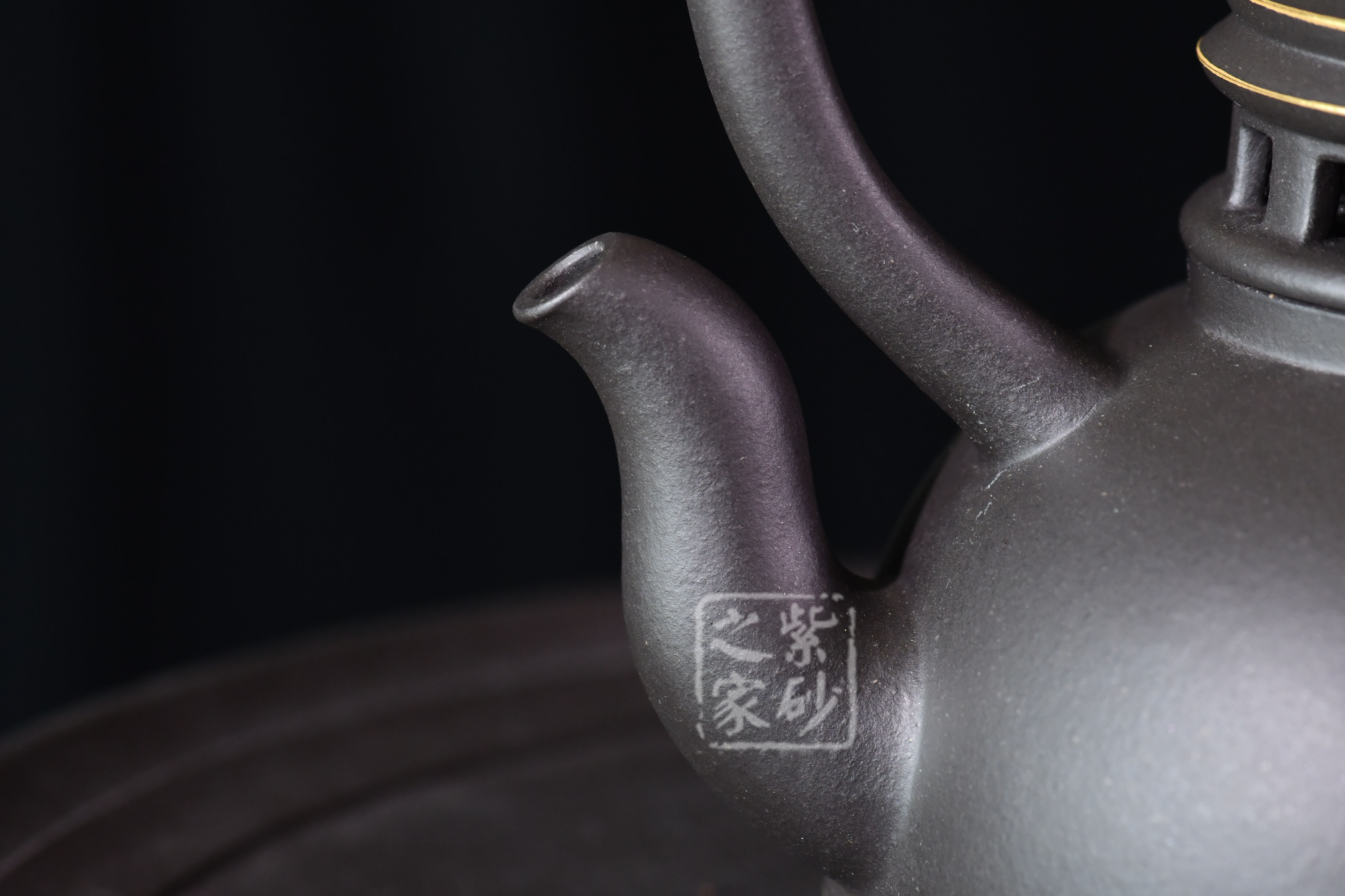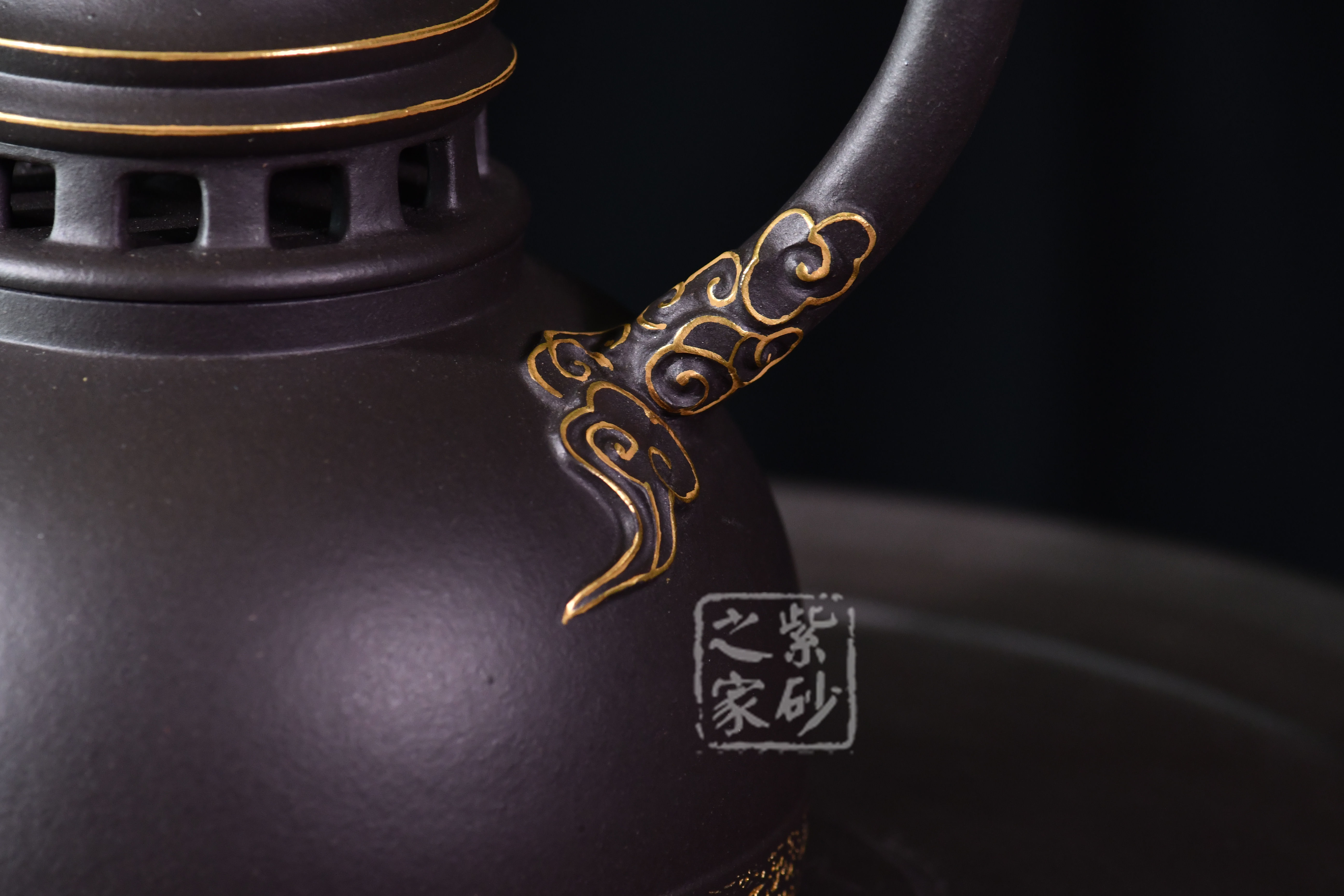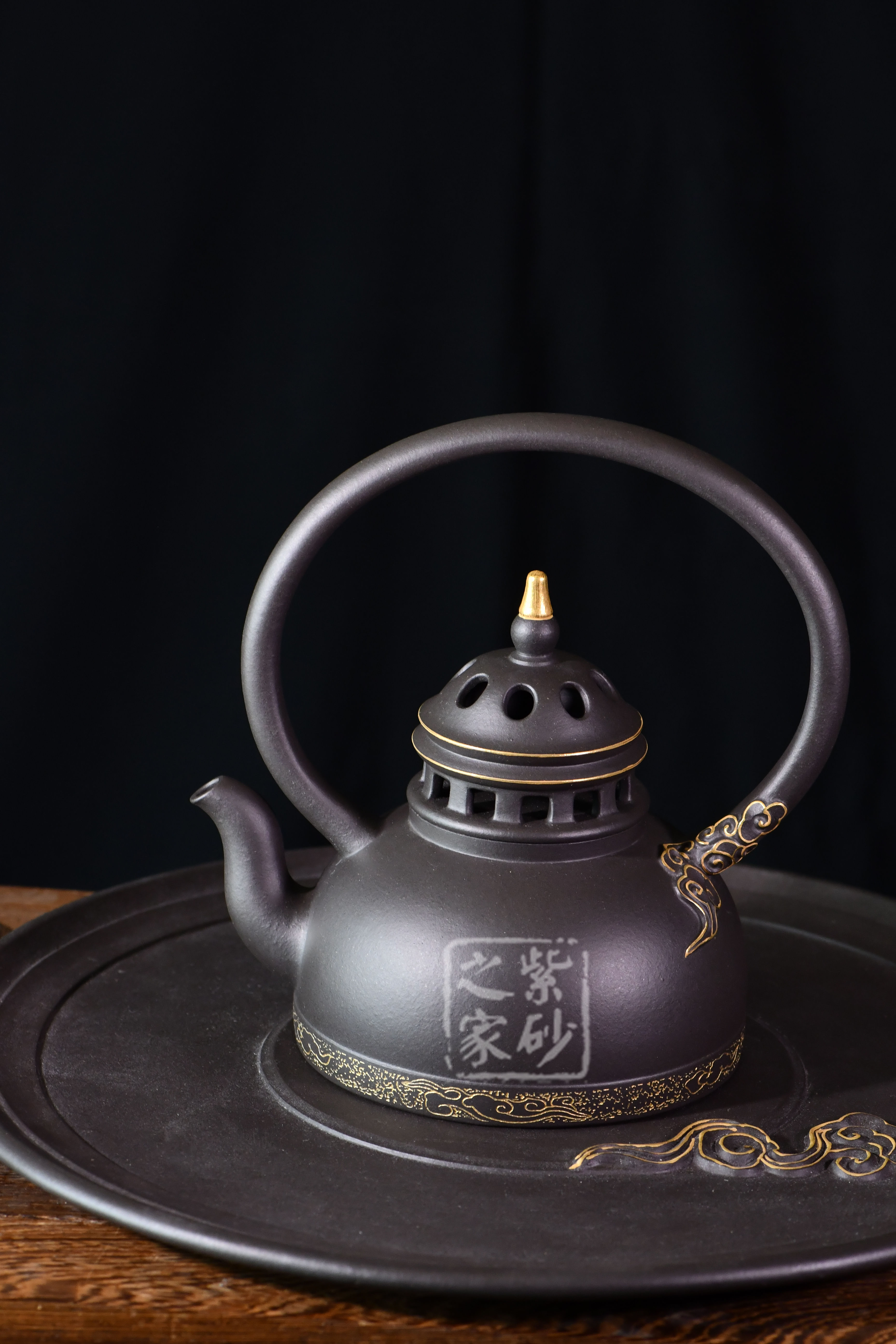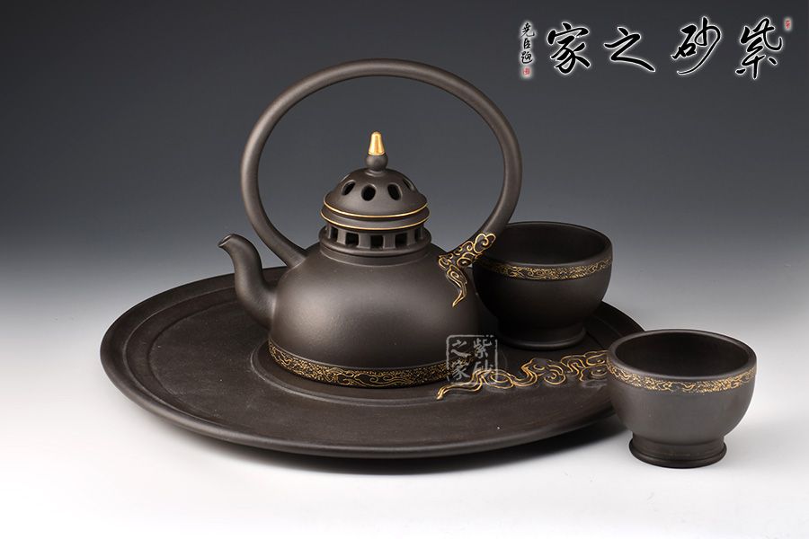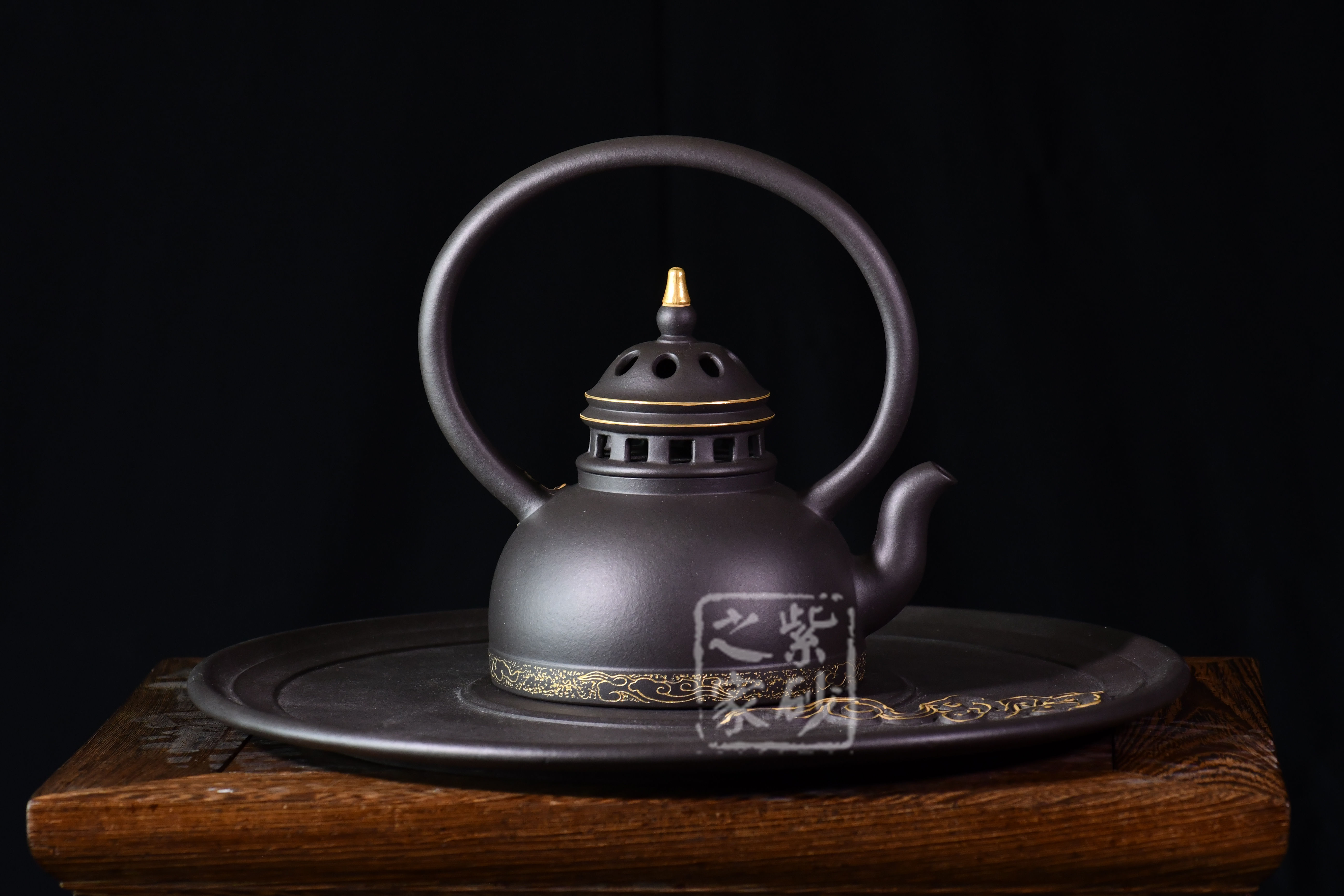 《鎏韻》套組,一壺二杯一盤,選用黑泥全手工精制而成,430cc大品容量,適合2—3人品茗。壺身飽滿圓潤,線條流暢。三彎嘴出水爽利,提梁設(shè)計(jì)獨(dú)特,展現(xiàn)出虛實(shí)有度,突出空間之美,描金裝飾,靈動不失貴氣,茶室高端雅器必選。
