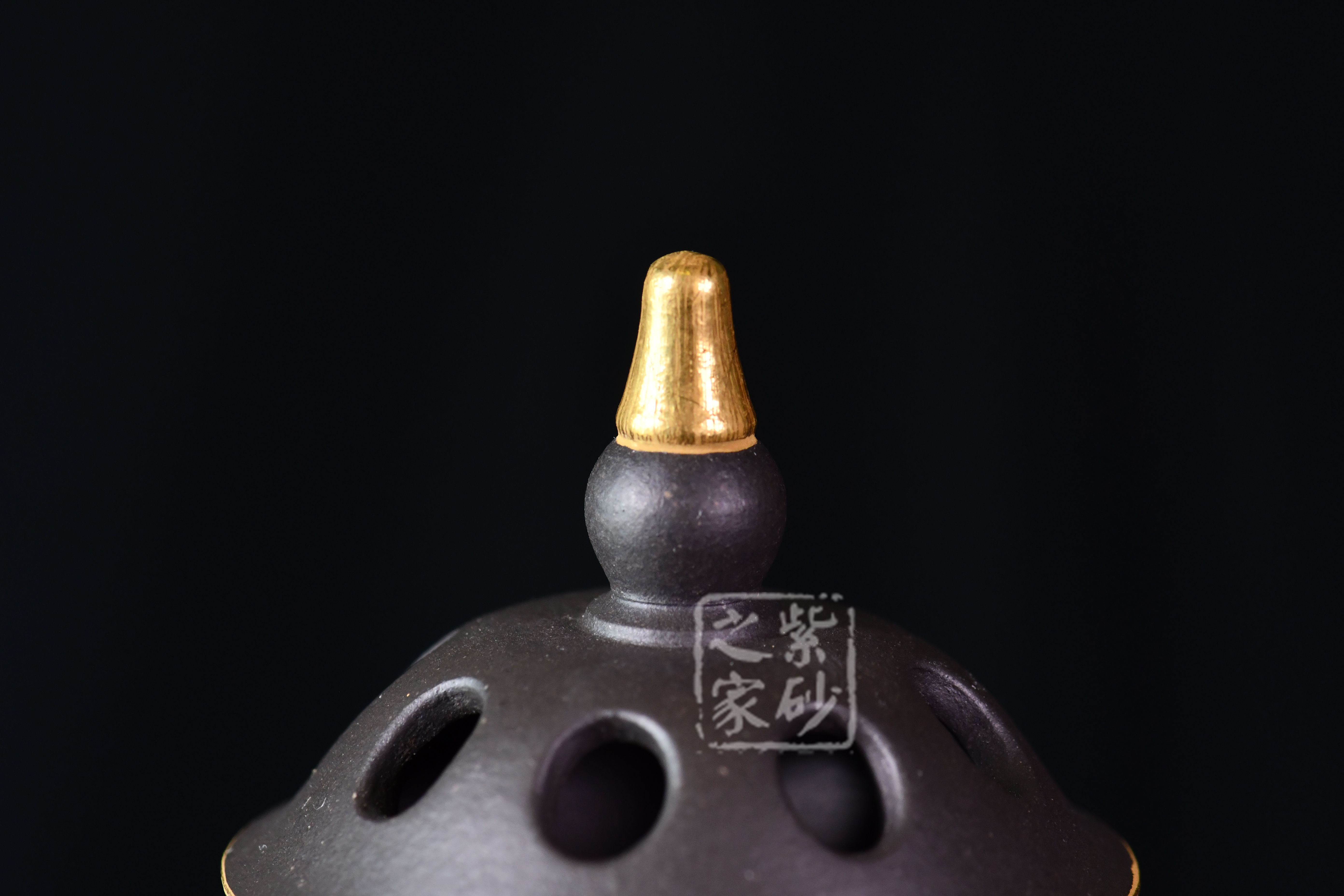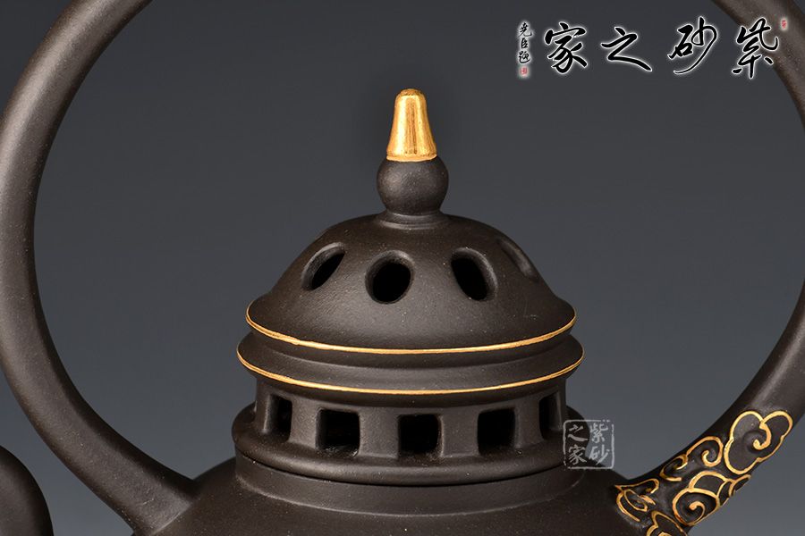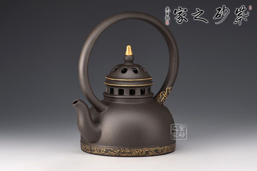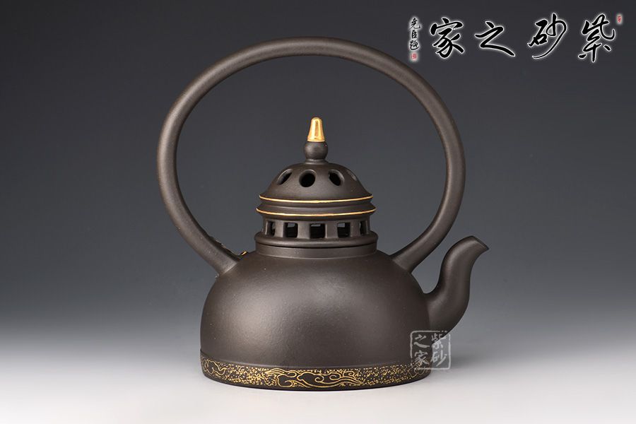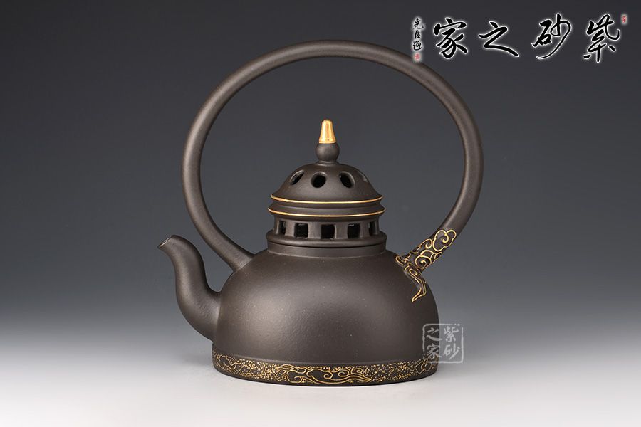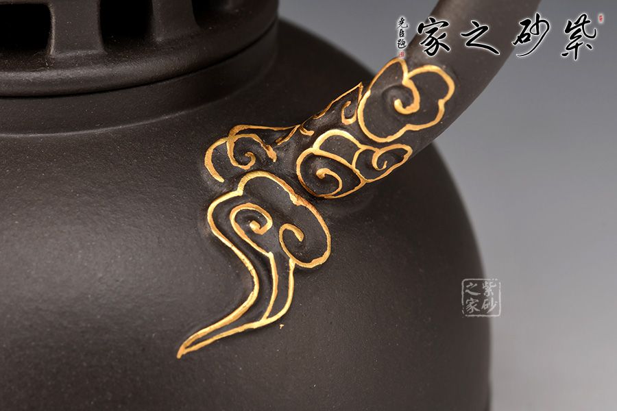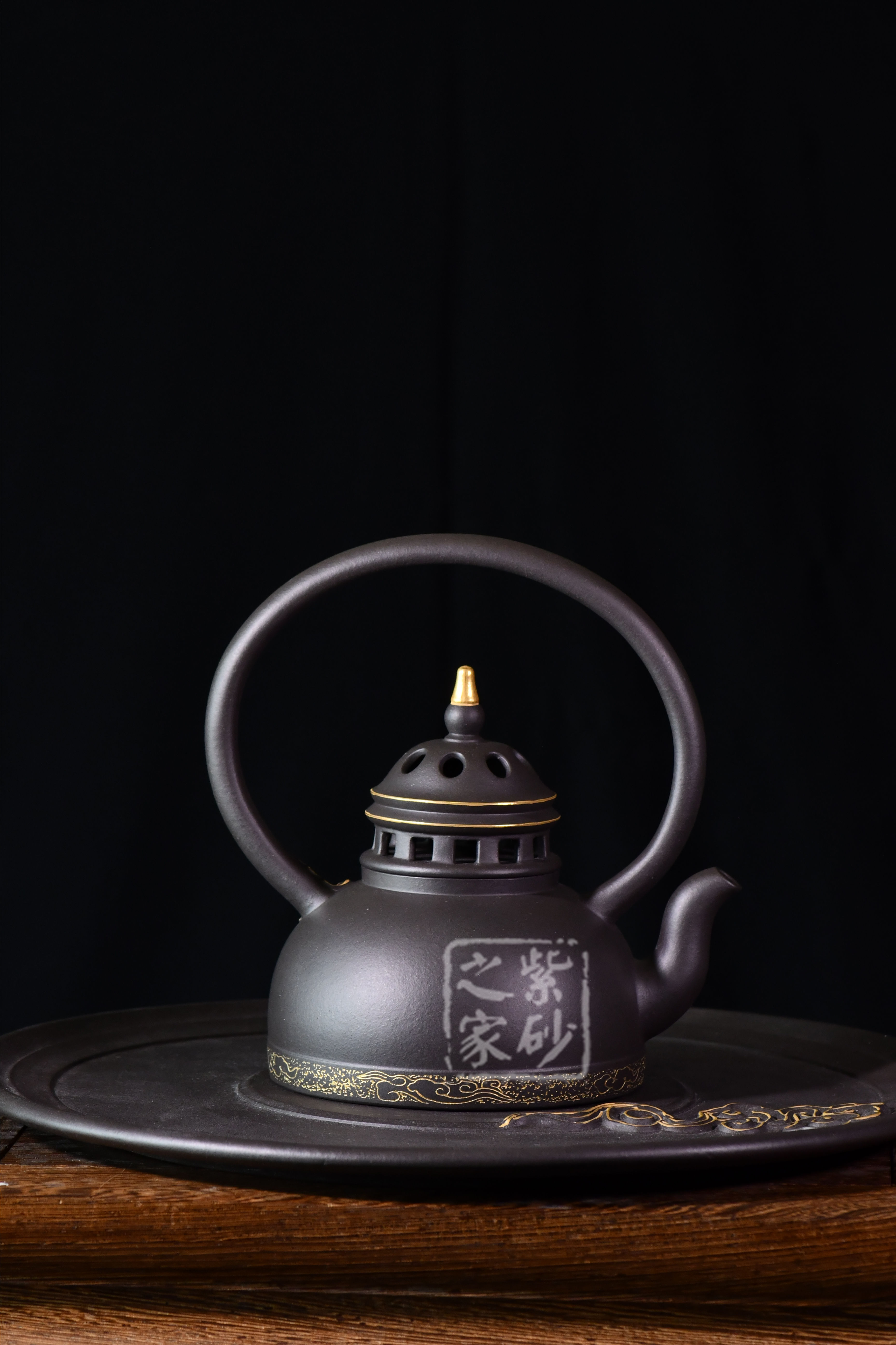 《鎏韻》套組,一壺二杯一盤,選用黑泥全手工精制而成,430cc大品容量,適合2—3人品茗。壺身飽滿圓潤,線條流暢。三彎嘴出水爽利,提梁設(shè)計(jì)獨(dú)特,展現(xiàn)出虛實(shí)有度,突出空間之美,描金裝飾,靈動不失貴氣,茶室高端雅器必選。