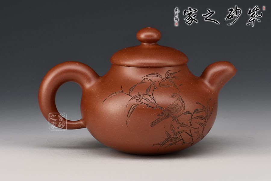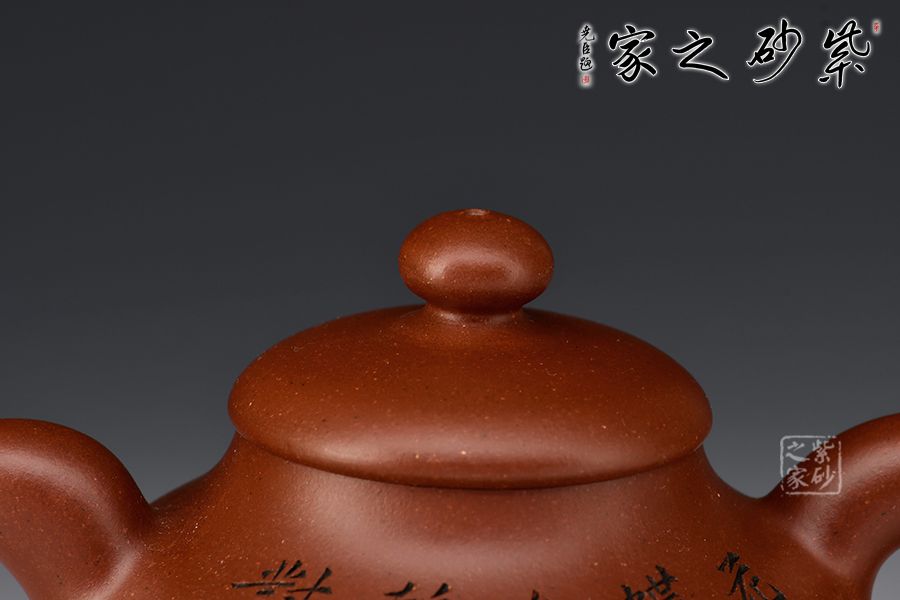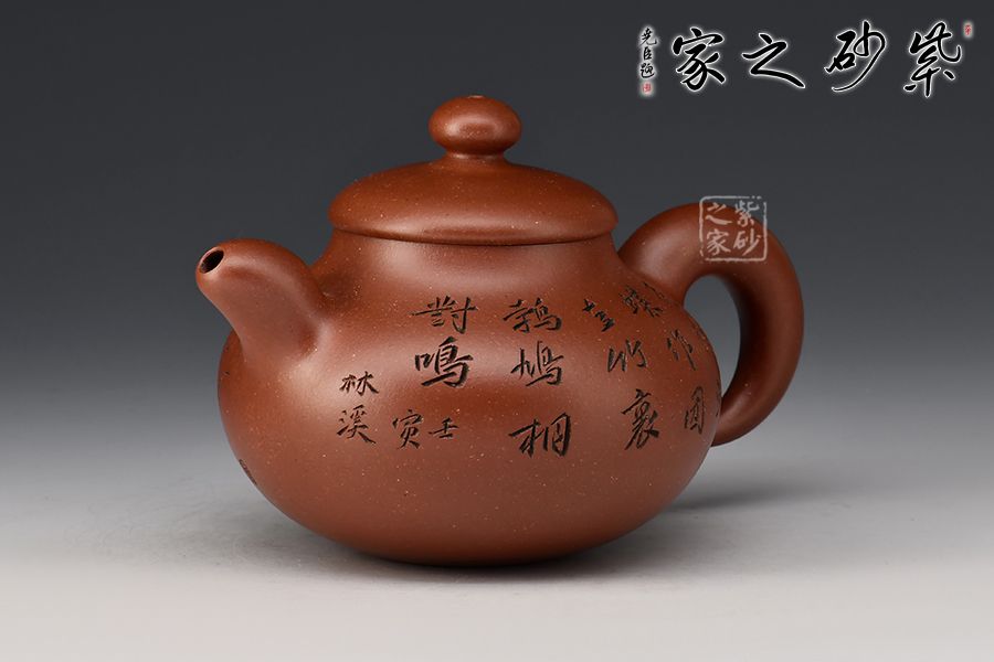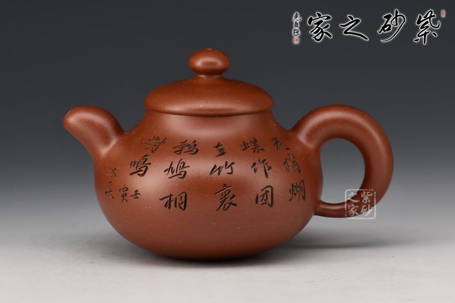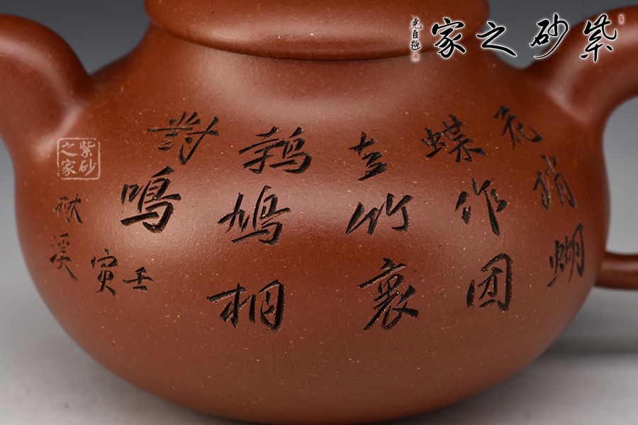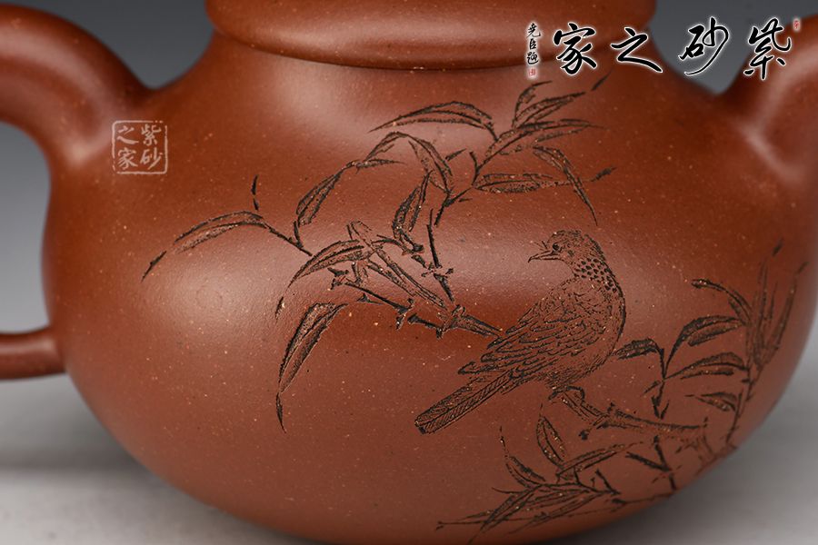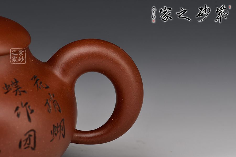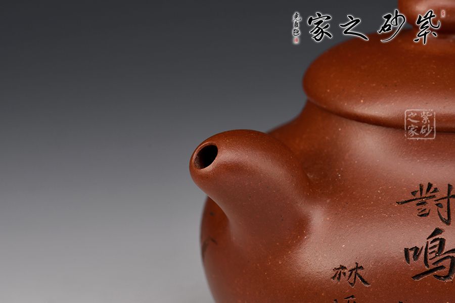 此壺有著渾圓的壺身,半圓的壺蓋,圓鈕,線條流暢,比例得當,壓蓋略微渾厚,點線之間見出魅力,子母線口蓋溫和嚴密,骨肉亭勻,簡練大方,制作頗見功力。彎流嘴胥出,柔美之姿明顯,耳形壺把優(yōu)雅滑落而下,形成一條圓潤飽滿的弧線,樸雅大方。