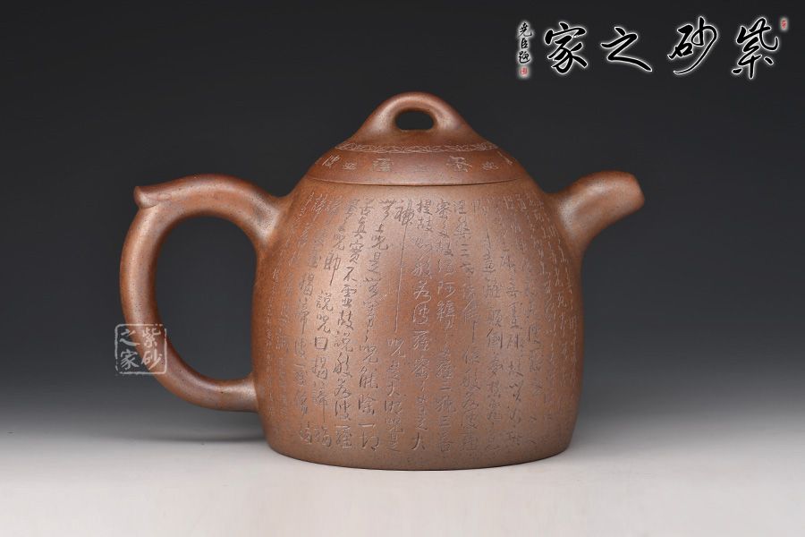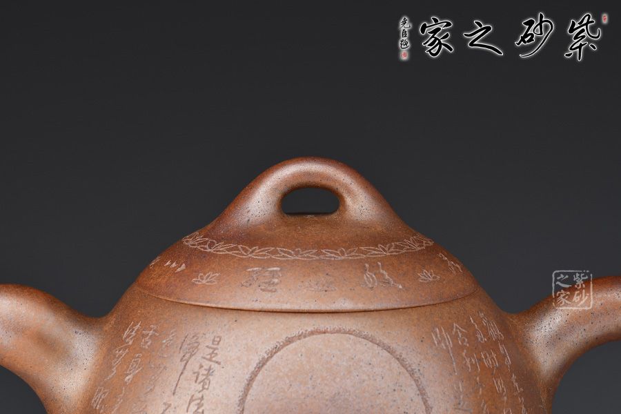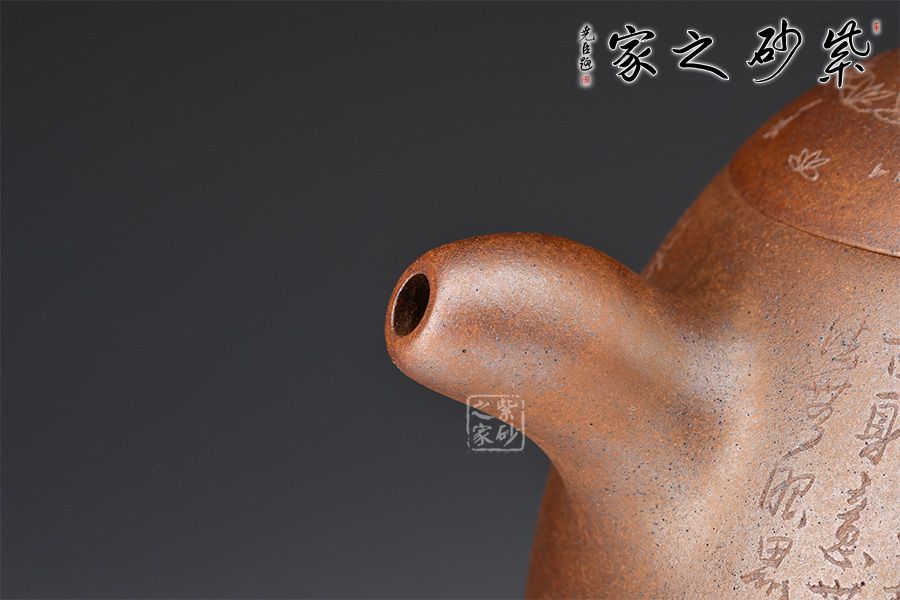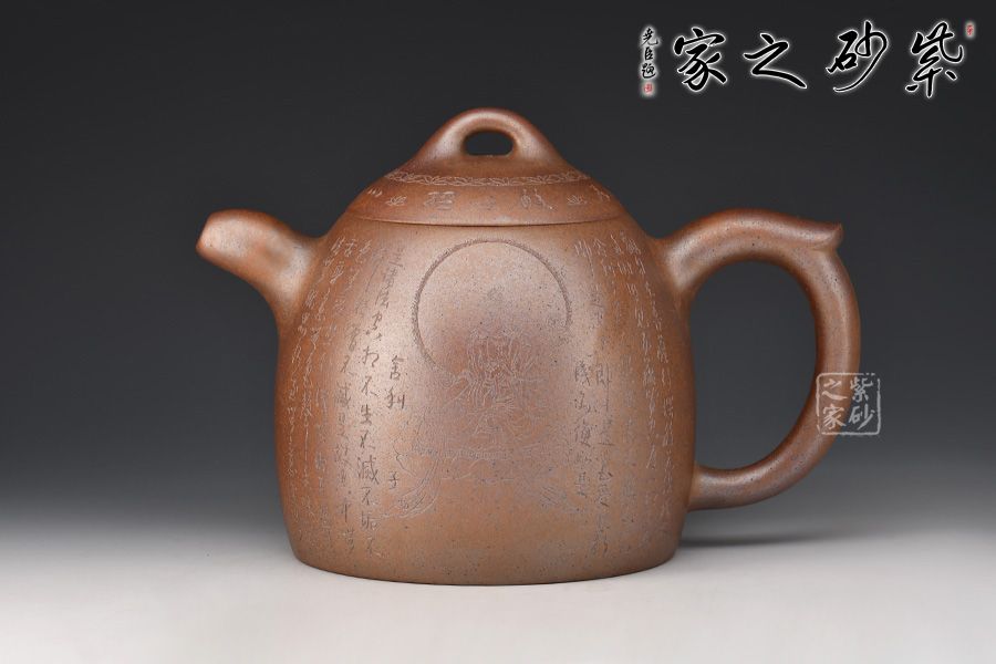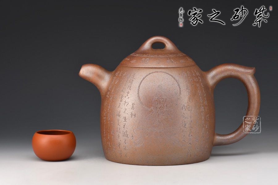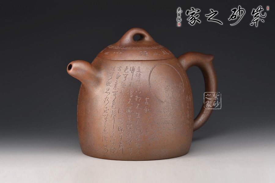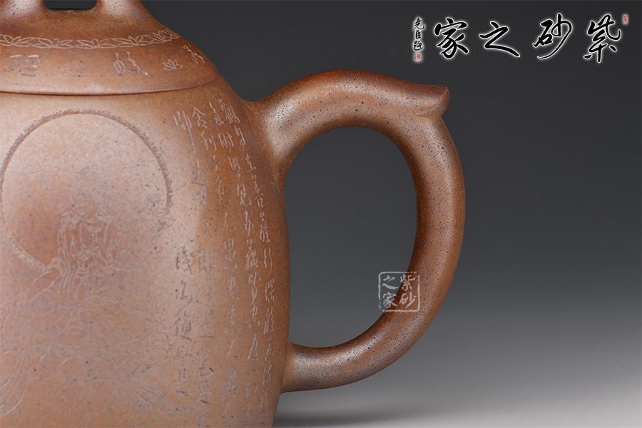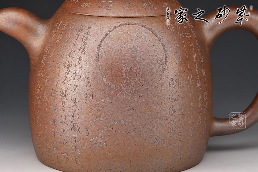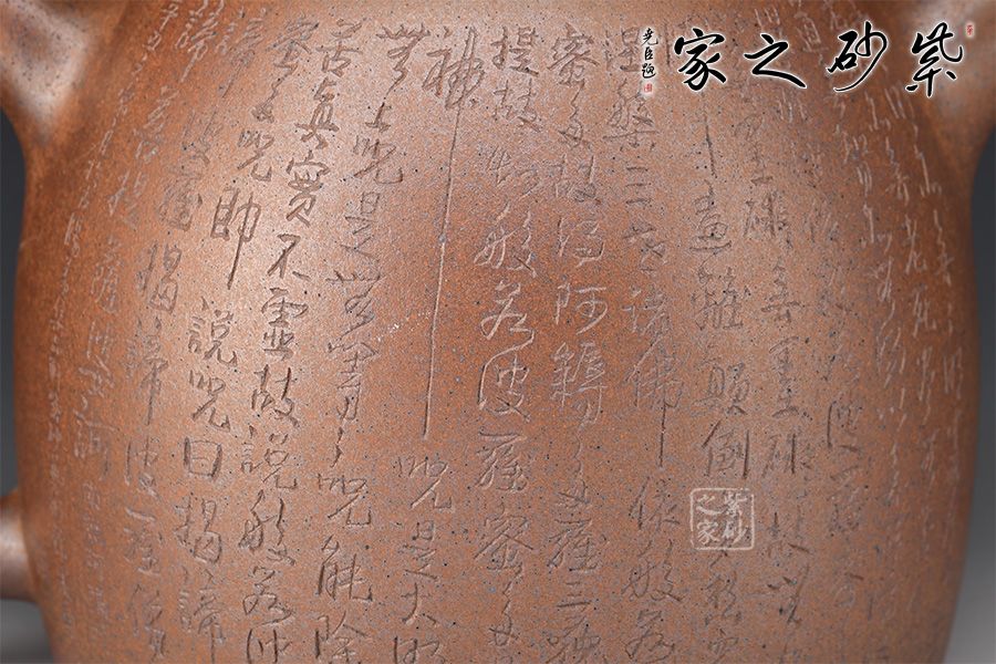 秦權(quán)壺,仿秤砣形制,壺身高聳由下至上收斂,自然流暢;流短有勁,環(huán)耳形把手,不矯不揚(yáng);壺蓋微鼓,沿與蓋品渾然一體,鈕似橋頂。壺身由心經(jīng)第一人鄭求標(biāo)刻繪,古樸大方,力到十足!窯變孤品,大師強(qiáng)強(qiáng)聯(lián)合,值得收藏!