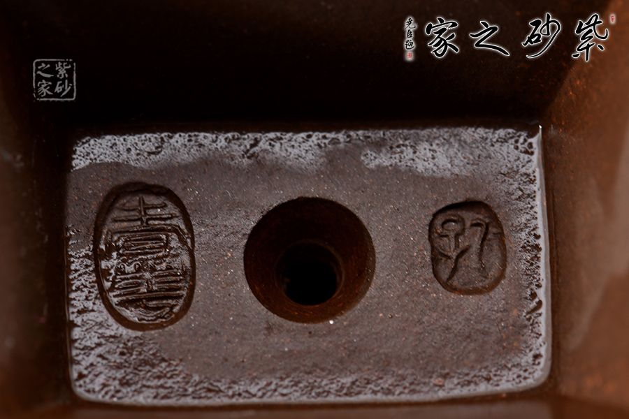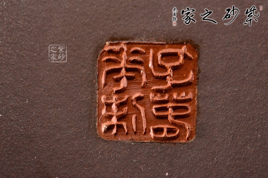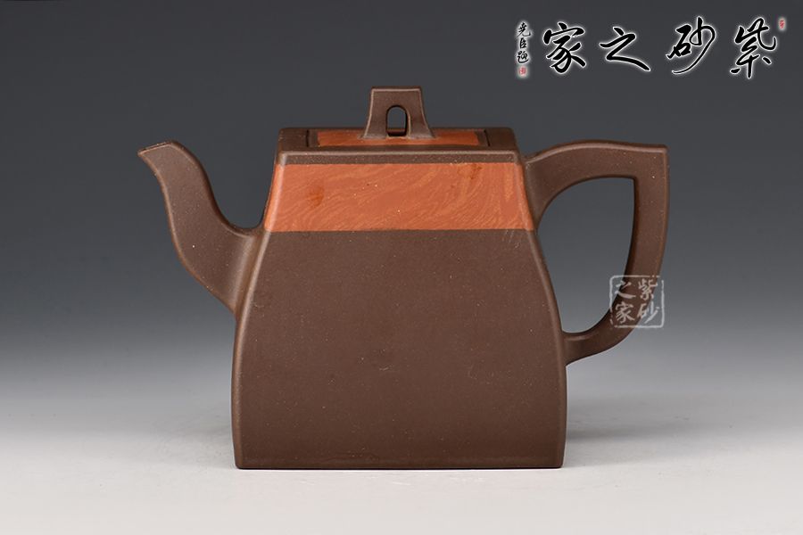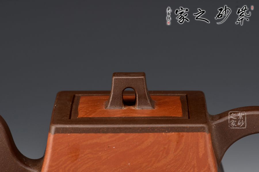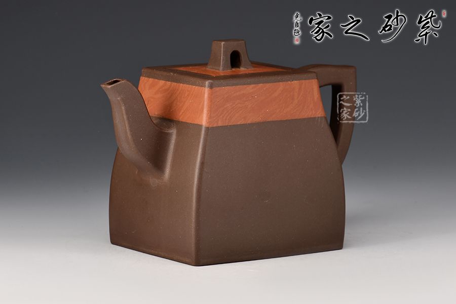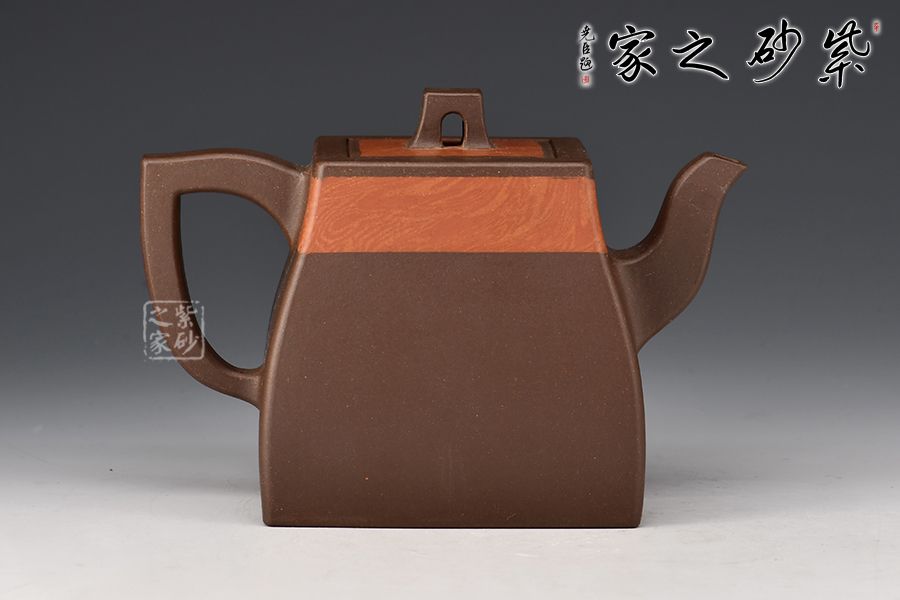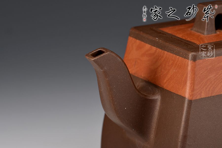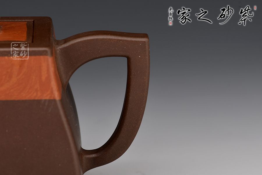 漢方是方器中經(jīng)典器型之一。此款作品頗具“孔家壺”的特色,非常惹眼。壺肩頸之處以特色絞泥工藝為裝飾,寓為錦帶,新穎獨(dú)特。家藏老紫泥手工精制而成,精雅而不失古樸風(fēng)味。