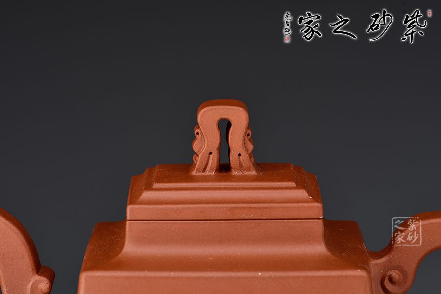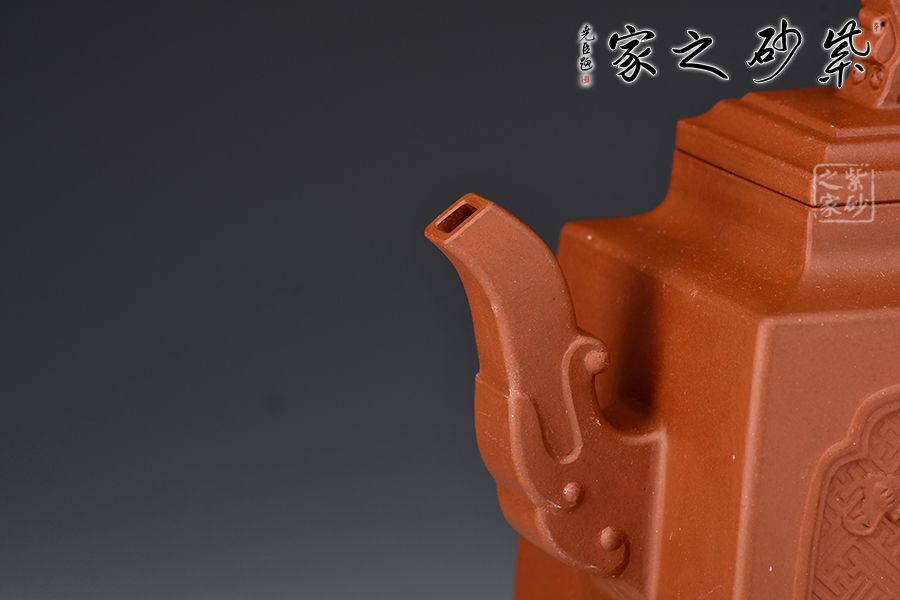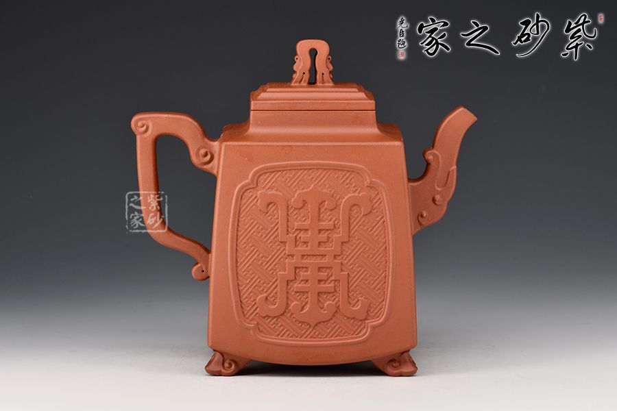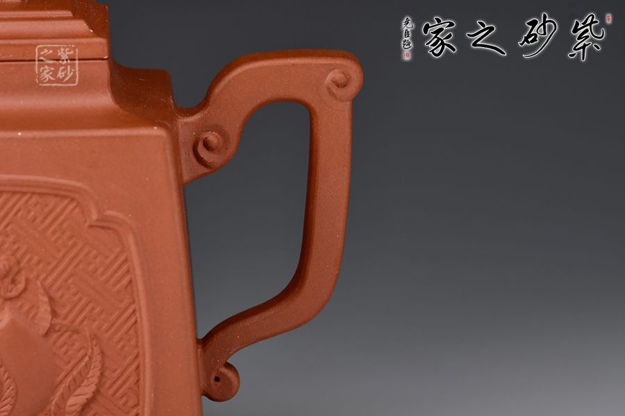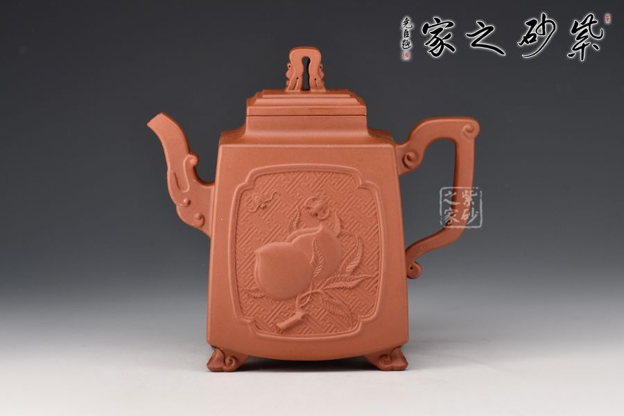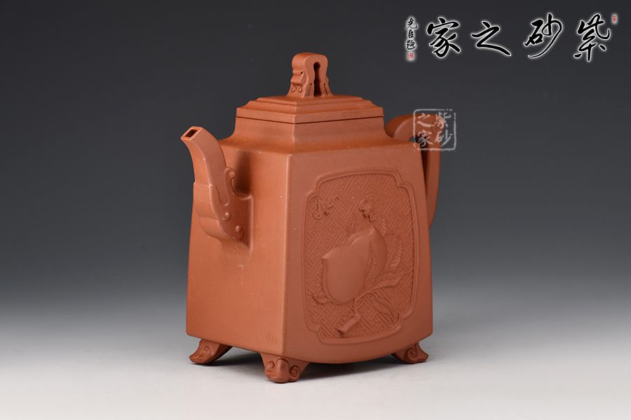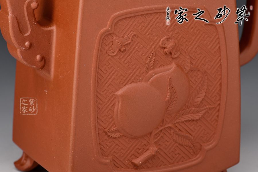 壺身呈四方形,并以四如意足鼎立之姿呈現(xiàn),更顯穩(wěn)重敦厚,彰顯大氣風(fēng)范。壺身兩面皆采用獨(dú)特的如意開(kāi)框裝飾工藝制不同的圖案紋飾及雕刻,從而達(dá)到了一種別樣的藝術(shù)效果。