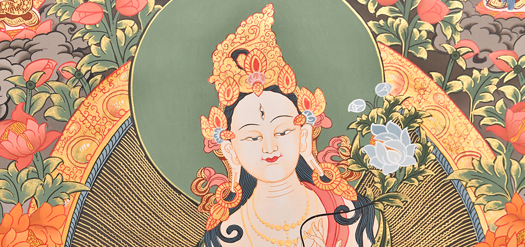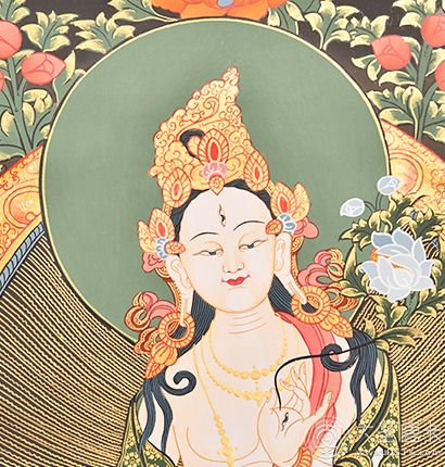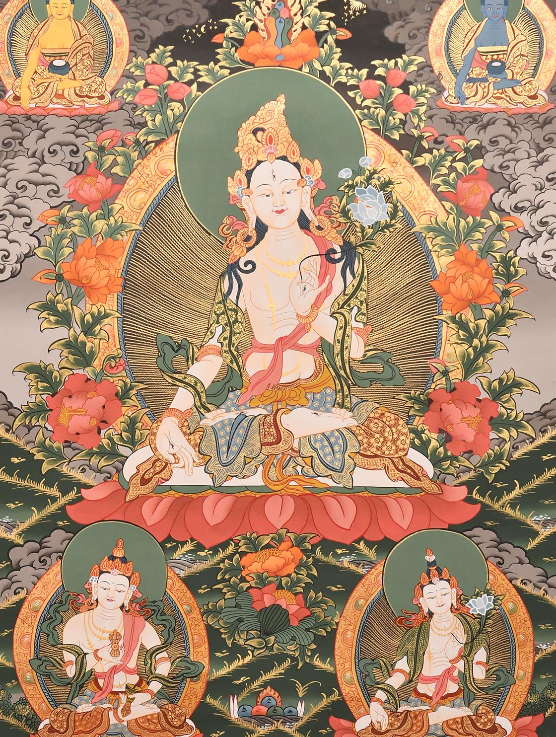 白度母(White Tara),藏音譯卓瑪嘎爾姆,又稱為增壽救度佛母,是觀世音菩薩的化身。白度母為二十一度母之一,是一切眾生尤其是女性的無比圣神,是保佑心想事成,賜壽除障的如意寶。白度母集二十一度母之功德于一身,能消除病痛邪風,妖魔鬼怪等外部之障與貪嗔癡等內部之障,勇猛無比,形隨眾生,變幻莫測。
