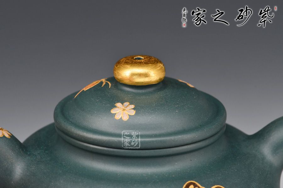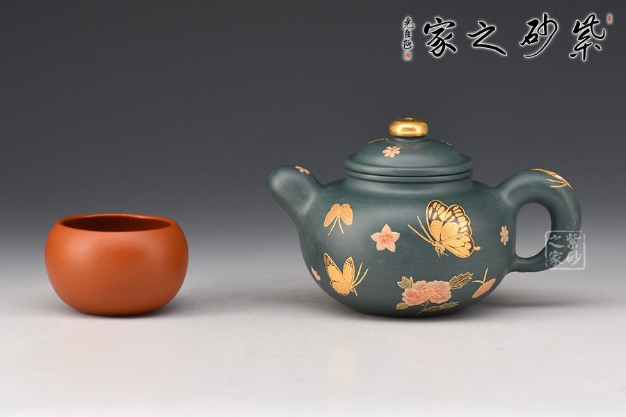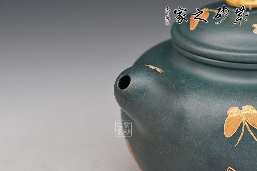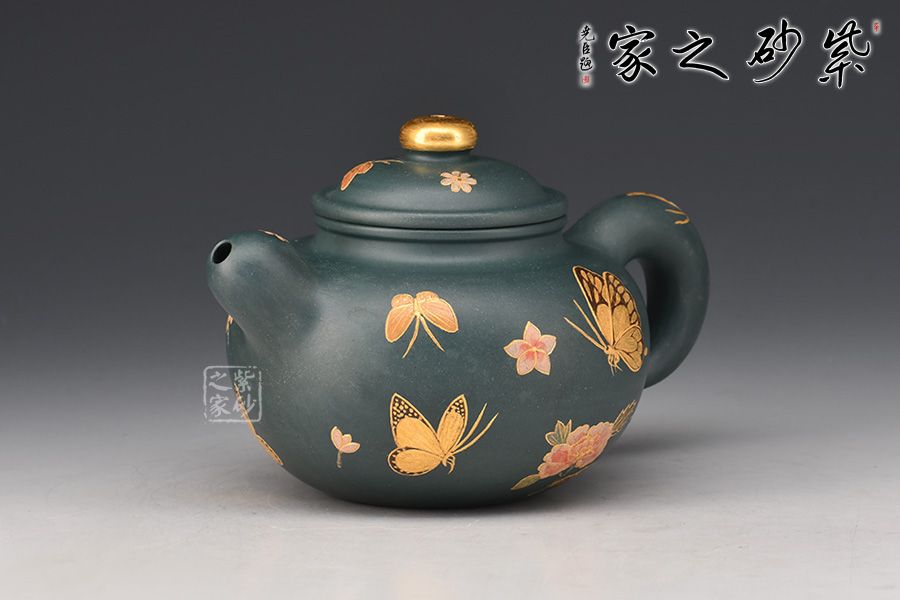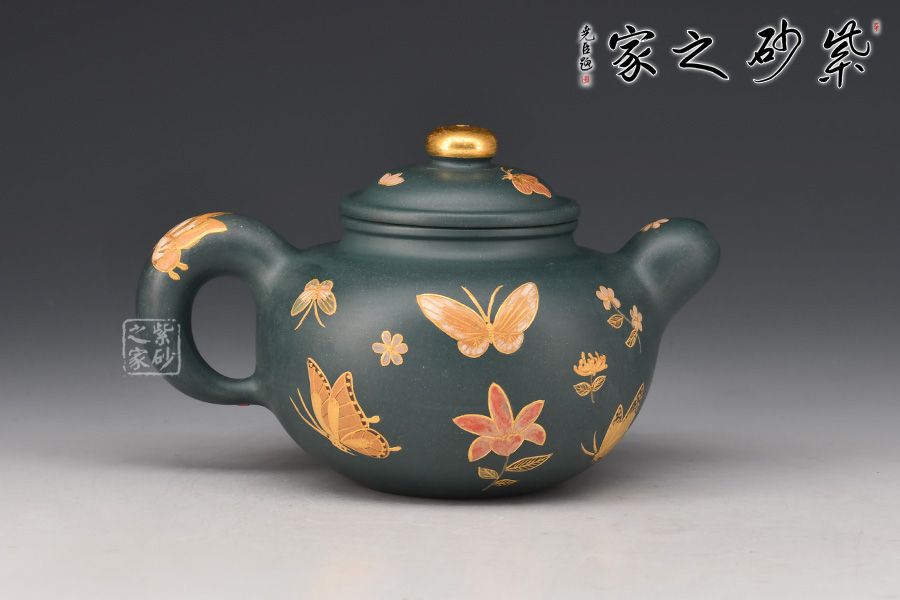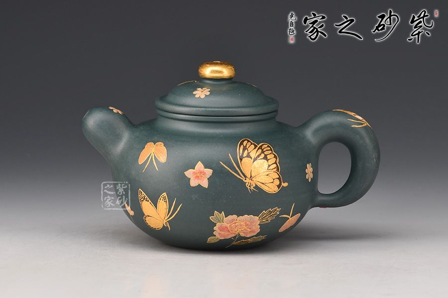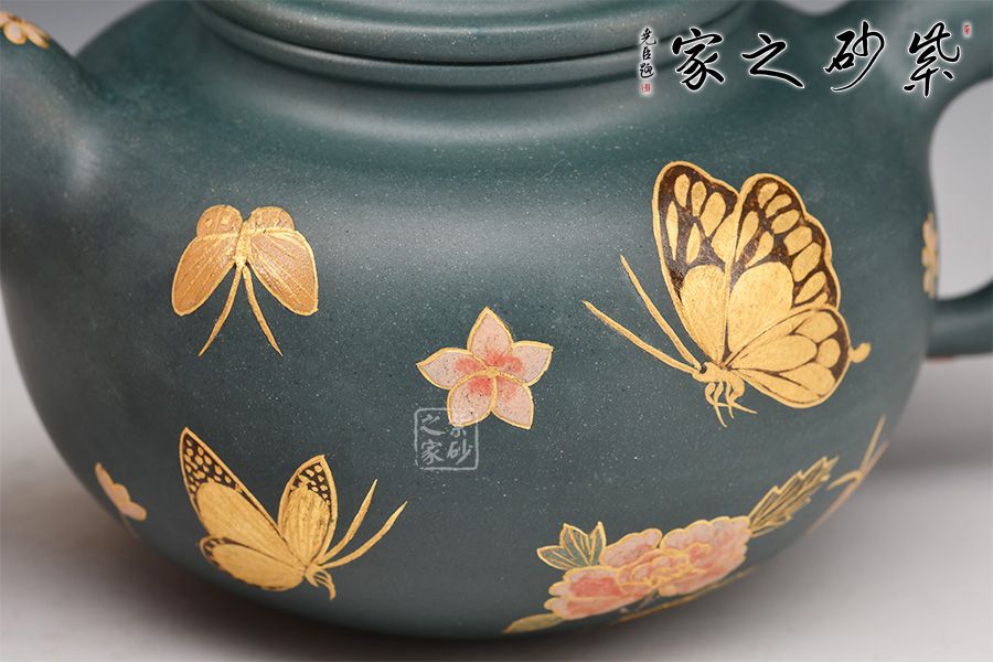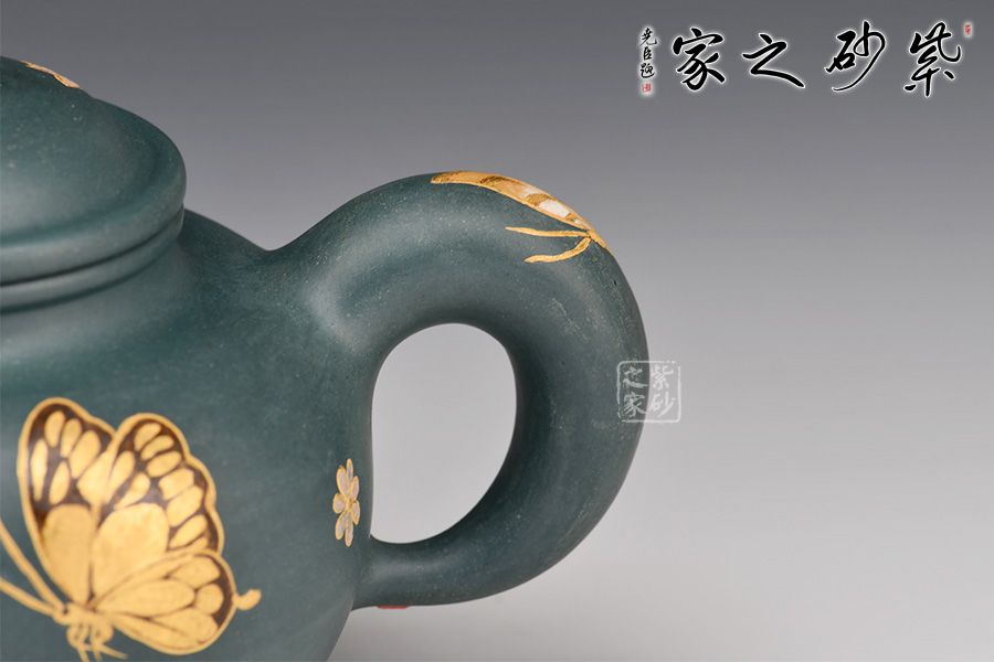 此壺為傳統(tǒng)經(jīng)典壺形,造型古樸端莊,氣度不凡,以簡(jiǎn)練形體來(lái)展示其美的內(nèi)蘊(yùn),充分展示了作者精妙絕倫的制壺技藝,以及對(duì)器形精、氣、神的表達(dá)。壺身溫潤(rùn)豐滿,壓蓋扁珠鈕,壺流厚重有力,壺把飄逸舒展,形成了一個(gè) 『耳朵』形曲線的優(yōu)美空間,各部比例協(xié)調(diào),古樸敦厚,秀美醇和。壺身描金的蝶戀花圖是此壺的一大亮點(diǎn)!