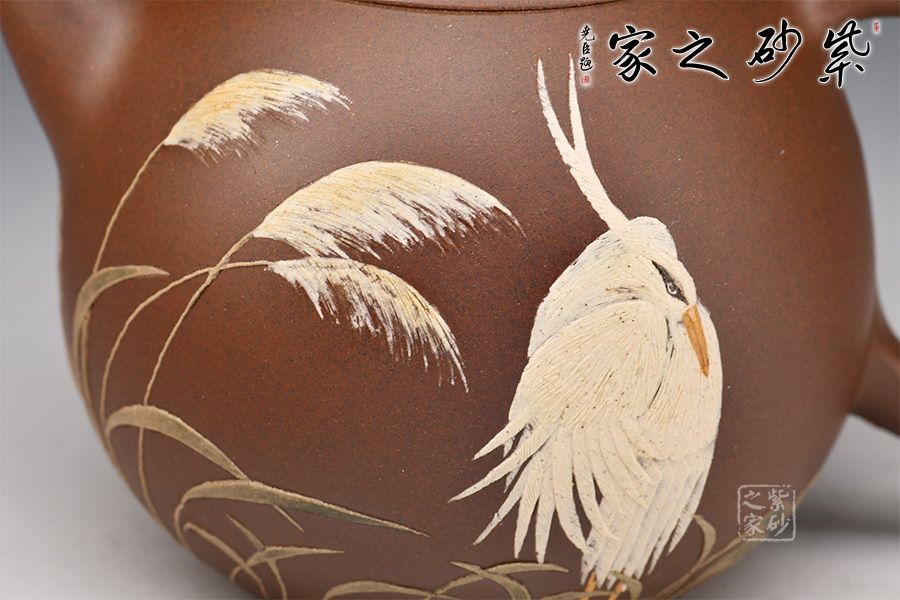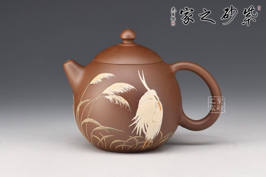 龍蛋壺是一款傳統(tǒng)的經(jīng)典壺型,通體狀似蛋形,截蓋與壺身似一氣呵成,蘑菇狀壺鈕,直嘴,壺嘴短而粗,出水流暢。耳形把大而垂,便于抓握。壺身飽滿光滑,壺體下部過渡平緩,壺身的百鶴圖凸顯作者高雅的志趣,此壺不論自用還是送人都值得推薦!