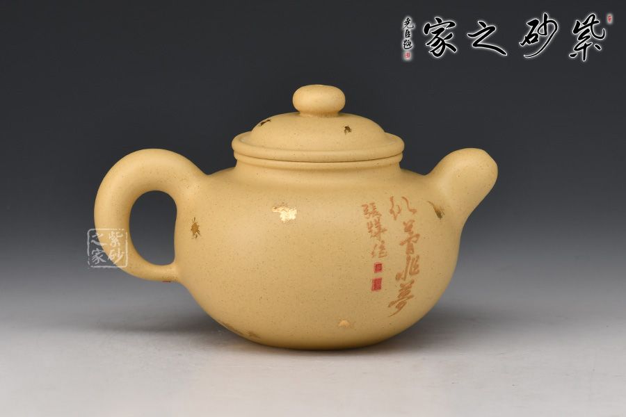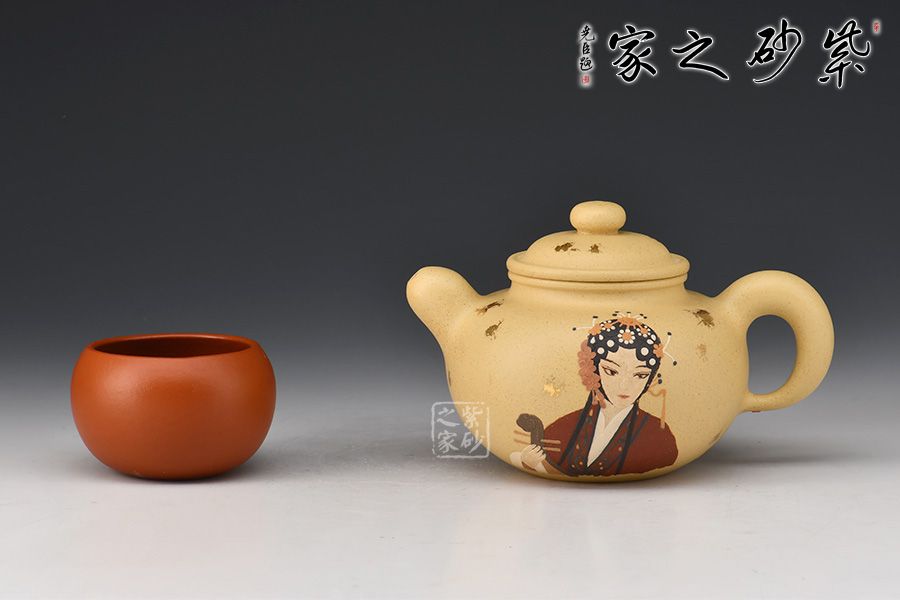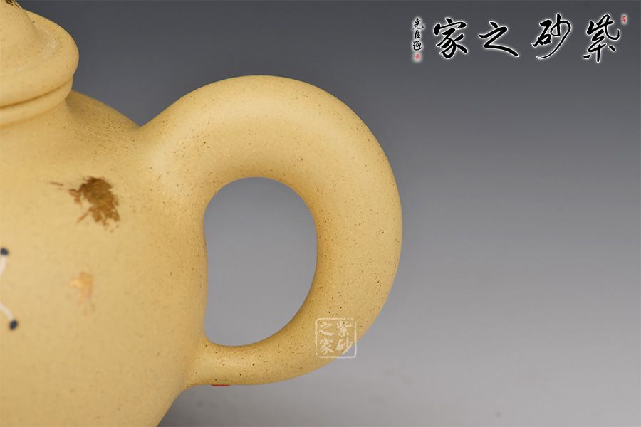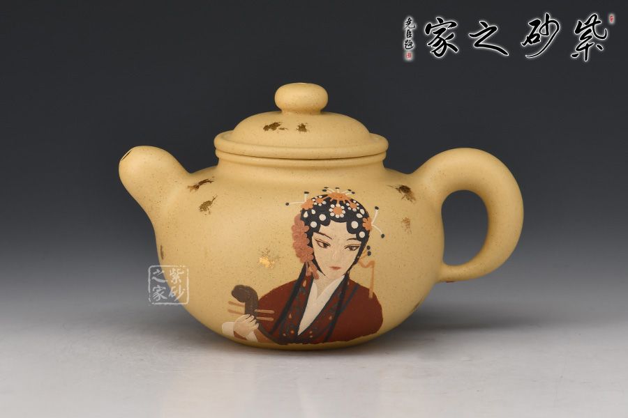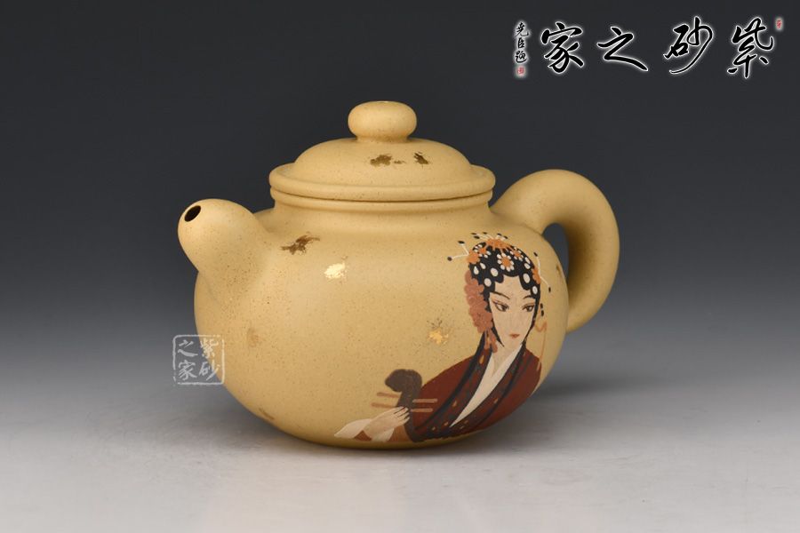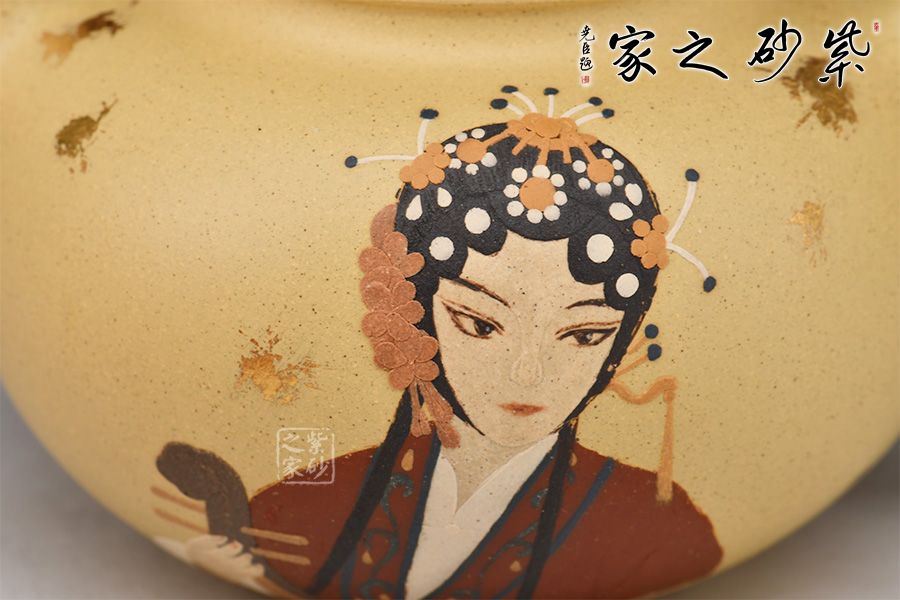 此壺為傳統(tǒng)經(jīng)典壺形,造型古樸端莊,氣度不凡,壺身溫潤豐滿,壓蓋扁珠鈕,壺流厚重有力,壺把飄逸舒展,形成了一個(gè) 『耳朵』形曲線的優(yōu)美空間,各部比例協(xié)調(diào),古樸敦厚,秀美醇和。壺身采用撒金和泥繪工藝,古風(fēng)美人赫然壺上,本山段泥養(yǎng)成后色澤清雅亮麗,值得入手!