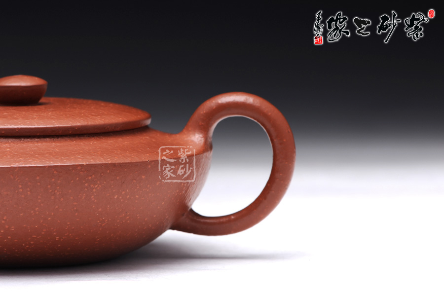 這款漢扁壺名副其實,壺身扁到極致,壺嘴及壺把皆高于壺蓋,整器更加挺括有氣勢,且此壺采用了是稀有泥料魚籽砂朱泥制成,細(xì)膩的朱泥泥質(zhì)中包裹著均勻蒼古的顆粒,剛?cè)岵?jì)之美讓人迷醉。