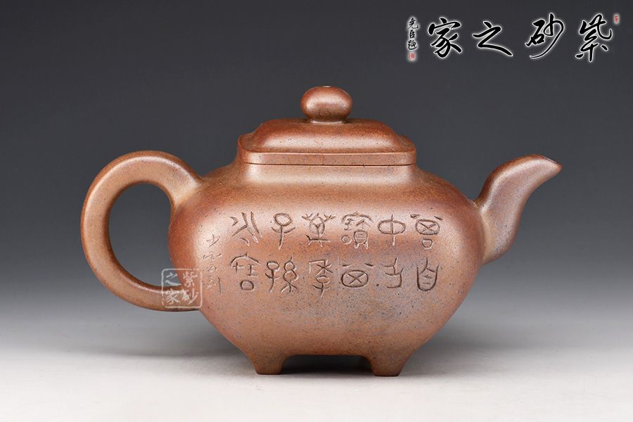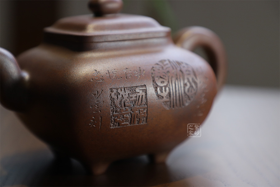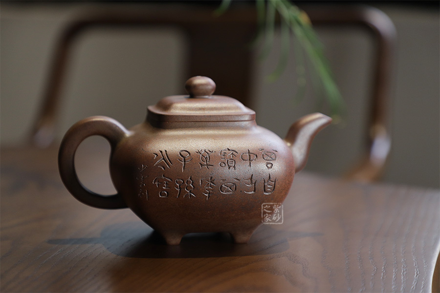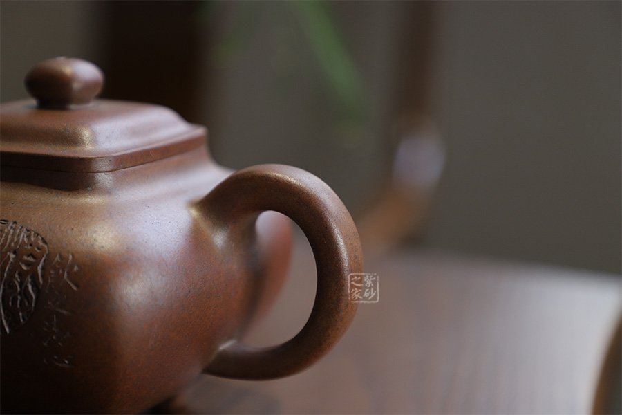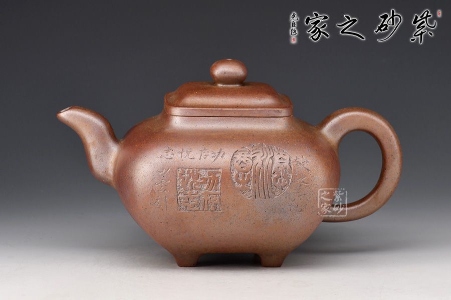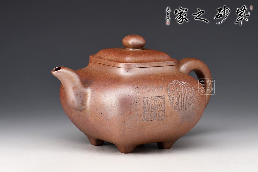 此壺為630cc的大品,壺身碩大,氣韻飽滿,方中有圓,挺勻有力,堪為壺中佳作。三彎壺流粗短,環(huán)把圓中帶方,四足如鼎分立。經(jīng)過(guò)百年洗禮,老味濃郁,古雅大方,非常具有收藏價(jià)值。