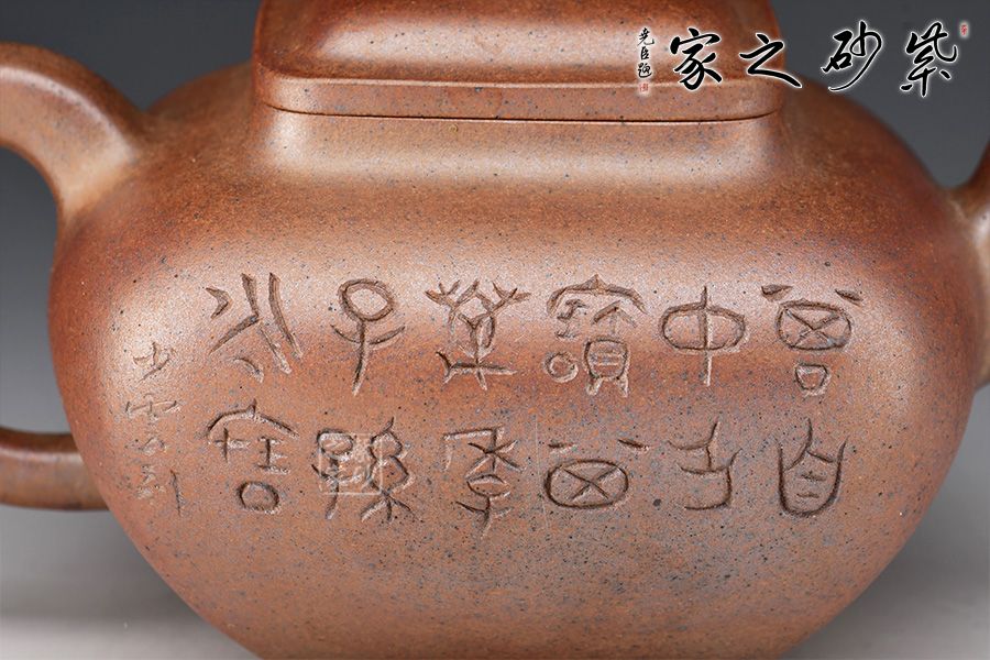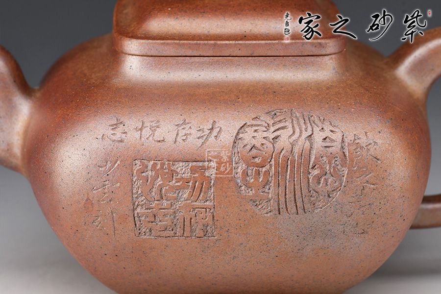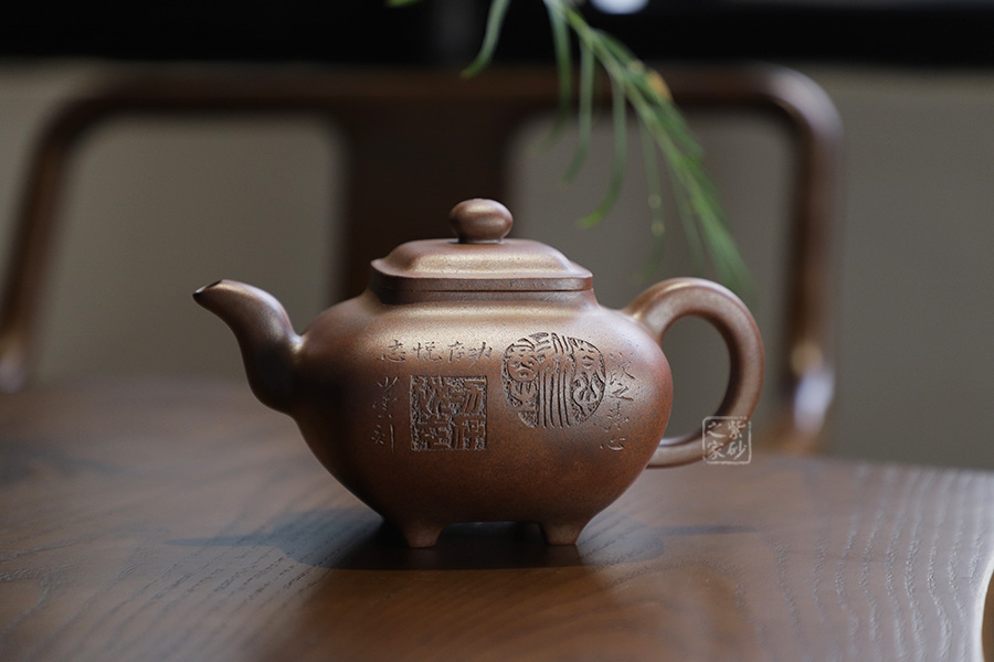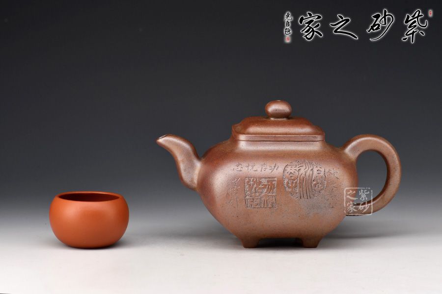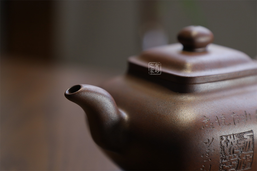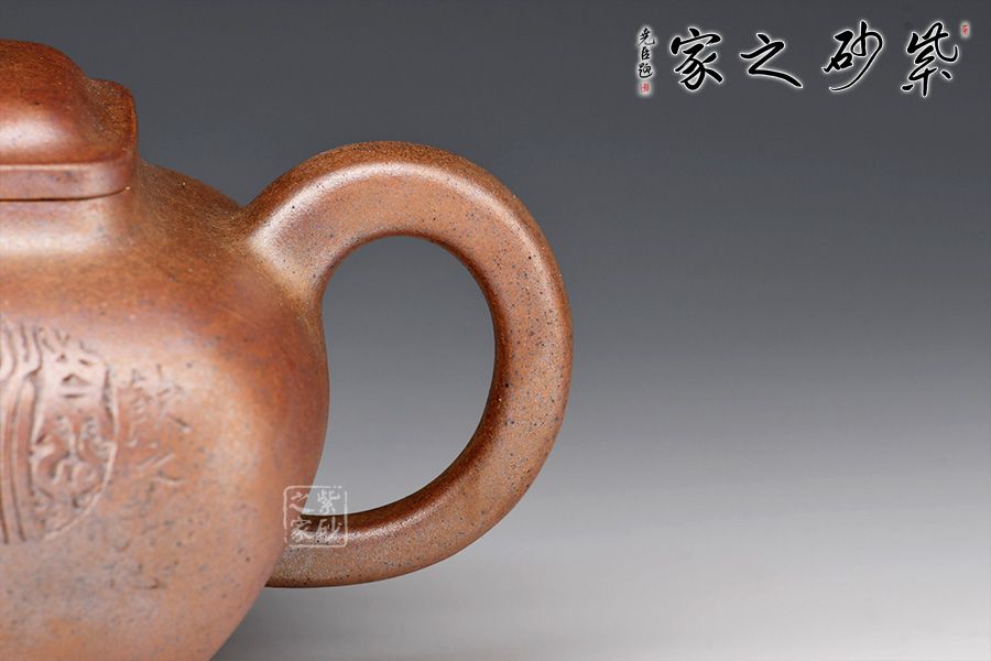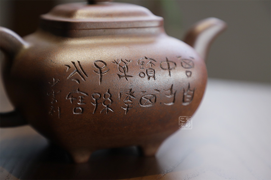 此壺為630cc的大品,壺身碩大,氣韻飽滿,方中有圓,挺勻有力,堪為壺中佳作。三彎壺流粗短,環(huán)把圓中帶方,四足如鼎分立。經(jīng)過(guò)百年洗禮,老味濃郁,古雅大方,非常具有收藏價(jià)值。