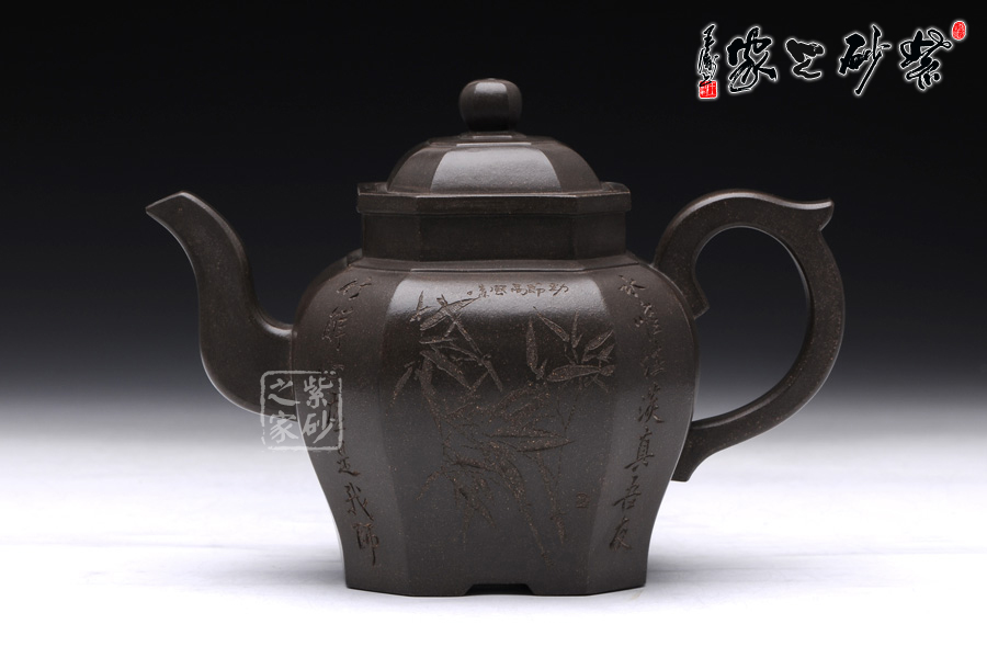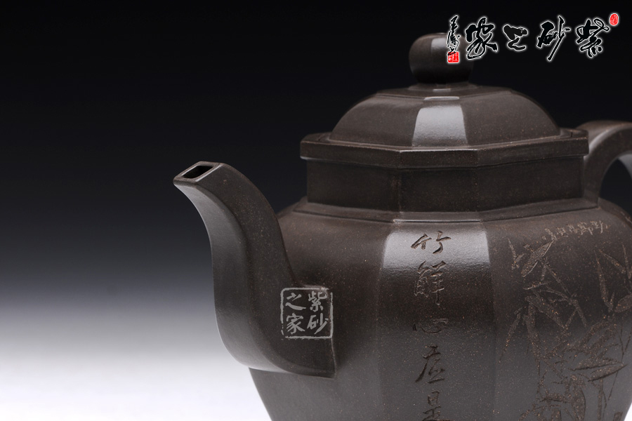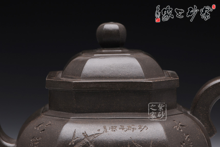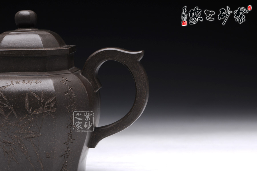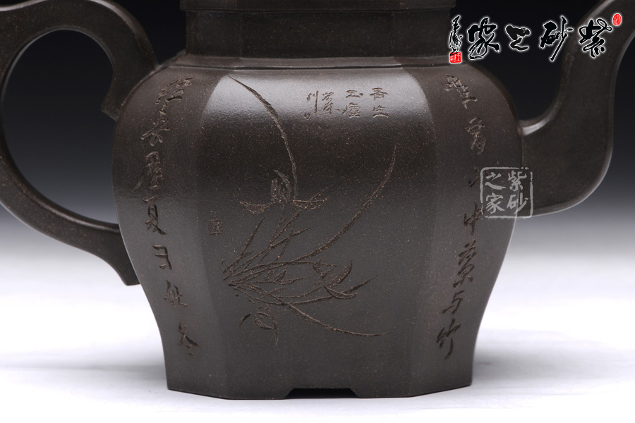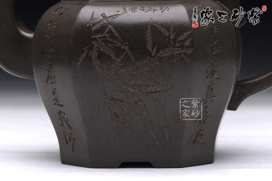此壺壺型為八方宮燈經典造型,古樸的韻味深入骨髓,工藝極為獨到精湛,一件絕美方器的韻味自然流露于壺體上,每一根線條的銜接都至極完美,容不得半點的疏忽,此款八方宮燈層次分明,棱角直挺,曲便是曲,直就是直,方器的韻味就在于這里;此壺分為四大四小八個面,壺身通體呈古陶罐的造型,上下的線條十分流暢,從壺鈕到壺底,暢快到底,四方耳形飛把盤旋如龍,遒勁有力,經典四方三彎流壺嘴曲折向上,噴薄而出,氣勢雄渾;壺身八面有兩面安置流、把,另外六面均為著名陶刻家陳宏林操刀篆刻,正面三面鐫刻的是“水唯性淡真吾友, 竹節(jié)虛心是我?guī)?rdquo;,中間鐫刻了一束翠竹;反面三面鐫刻的是“唯有山中蘭與竹,經春歷夏又秋冬”,中間鐫刻了一株優(yōu)雅的蘭花,詩情畫意,完美融合。