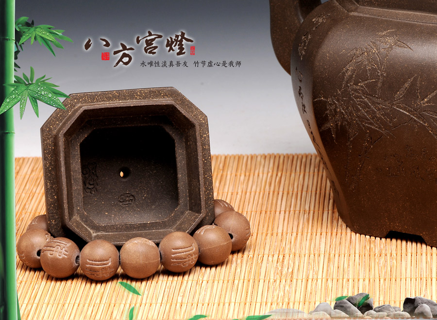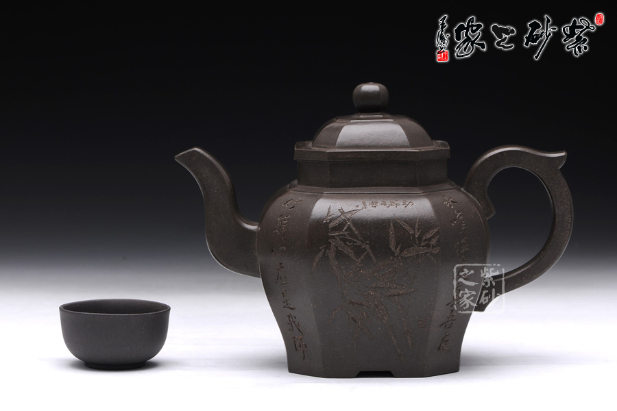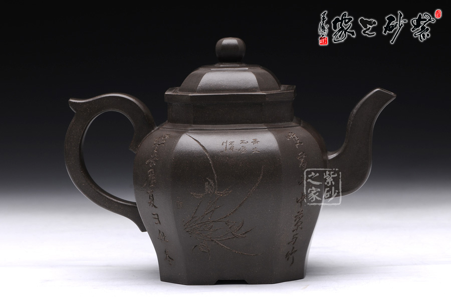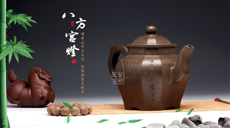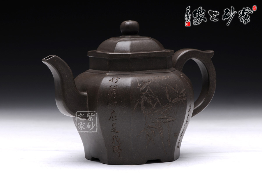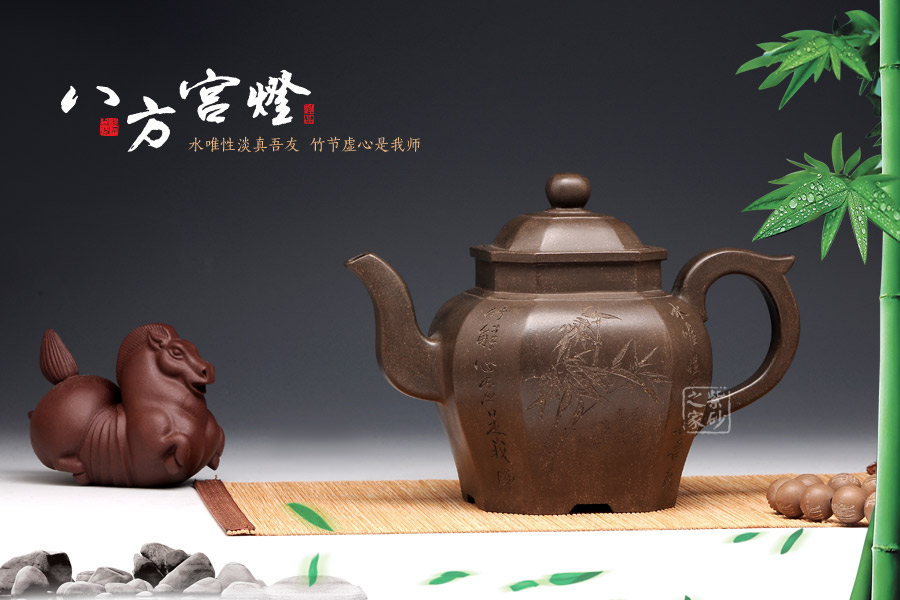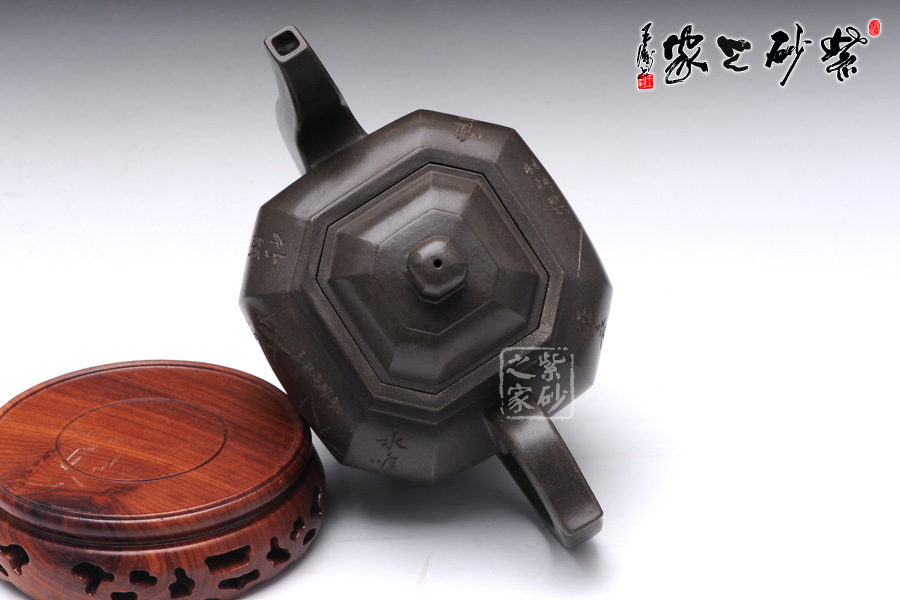 此壺壺型為八方宮燈經典造型,古樸的韻味深入骨髓,工藝極為獨到精湛,一件絕美方器的韻味自然流露于壺體上,每一根線條的銜接都至極完美,容不得半點的疏忽,此款八方宮燈層次分明,棱角直挺,曲便是曲,直就是直,方器的韻味就在于這里;此壺分為四大四小八個面,壺身通體呈古陶罐的造型,上下的線條十分流暢,從壺鈕到壺底,暢快到底,四方耳形飛把盤旋如龍,遒勁有力,經典四方三彎流壺嘴曲折向上,噴薄而出,氣勢雄渾;壺身八面有兩面安置流、把,另外六面均為著名陶刻家陳宏林操刀篆刻,正面三面鐫刻的是“水唯性淡真吾友, 竹節(jié)虛心是我?guī)?rdquo;,中間鐫刻了一束翠竹;反面三面鐫刻的是“唯有山中蘭與竹,經春歷夏又秋冬”,中間鐫刻了一株優(yōu)雅的蘭花,詩情畫意,完美融合。