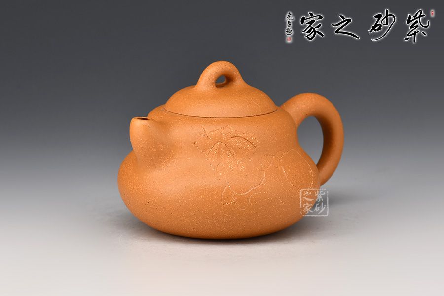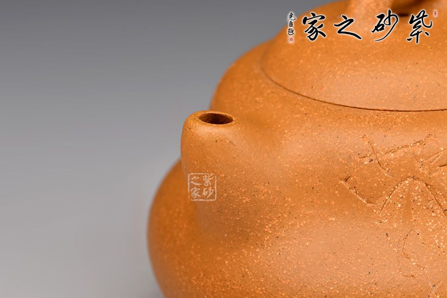 葫蘆,福祿。此壺采用原礦蟹黃泥制作而成,泥色亮麗,好泡養(yǎng)。壺身中間一條橫紋把壺分為兩半,于是上下相對,就成了一個壓扁的葫蘆。壺嘴短小精煉,與壺身融為一體,恰似一個葫蘆的開口。此件作品造型新穎,制作用心,展現(xiàn)了田園的趣味,也展現(xiàn)了女性的柔美。