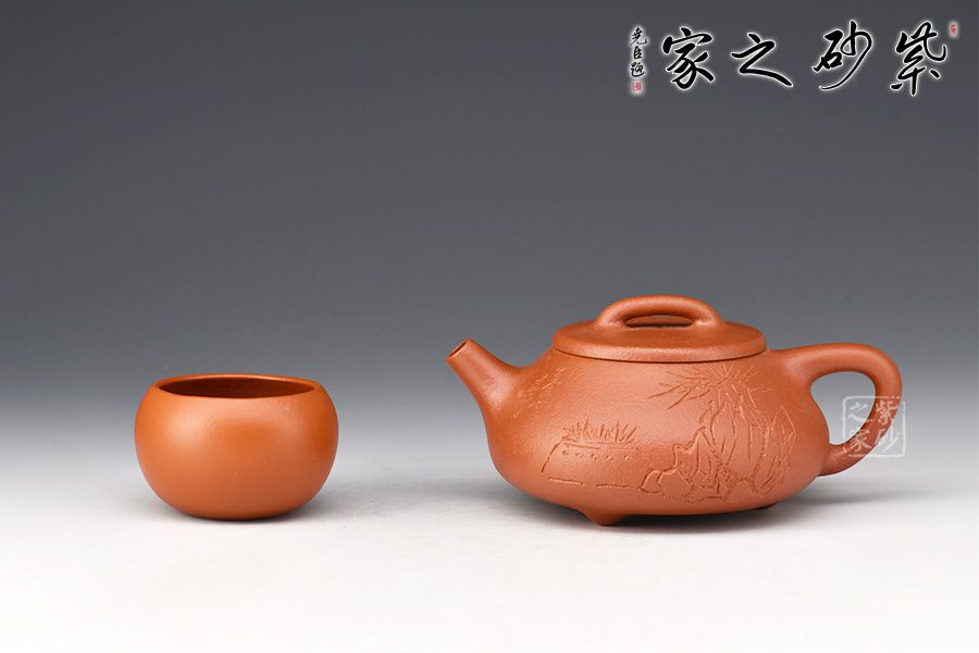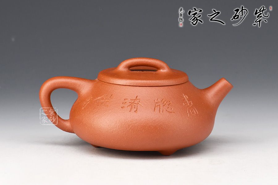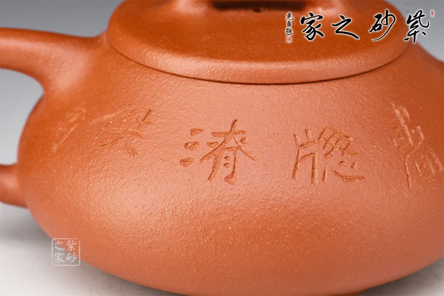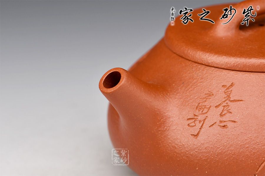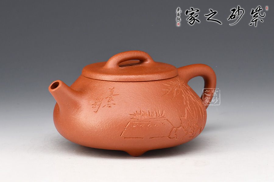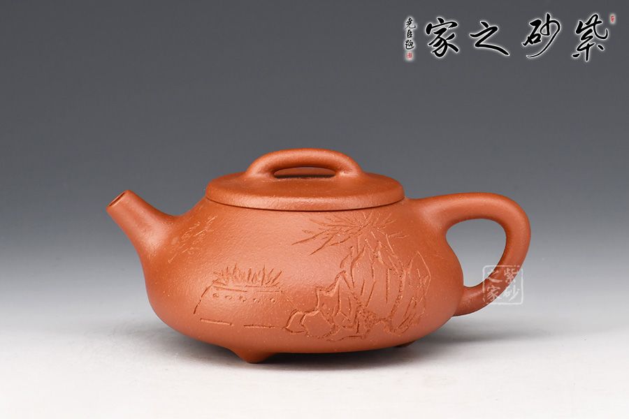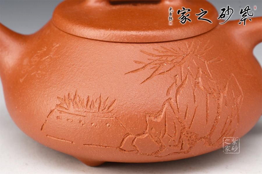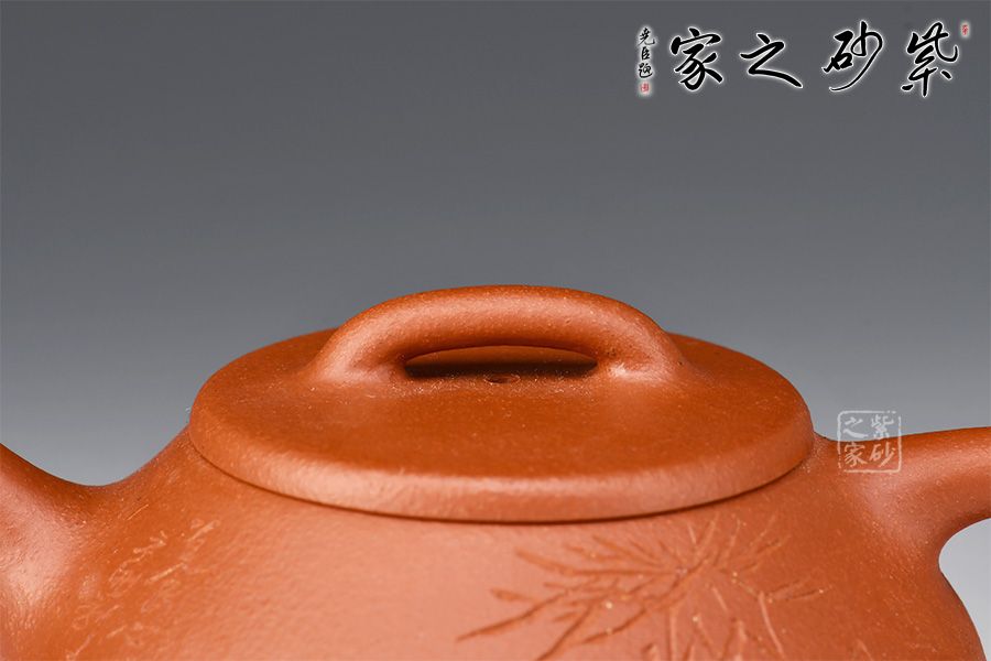 選用原礦紅泥全手工制作,質(zhì)感柔亮,質(zhì)堅(jiān)而溫潤(rùn)。將傳統(tǒng)文人畫(huà)技法運(yùn)用到陶刻,藝術(shù)價(jià)值倍增。此壺老味十足,處處見(jiàn)功力,面面是藝術(shù),壺型永不過(guò)時(shí)。作品在傳統(tǒng)石瓢基礎(chǔ)上,結(jié)合漢代元素改良而成,壺鈕像漢代的瓦當(dāng)。壺型完美詮釋澹泊明志,蘊(yùn)道家至高哲理,而中等容量的大小,適合一人小品或與親朋相聚。