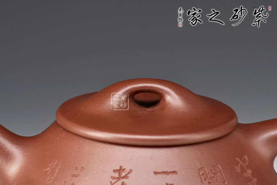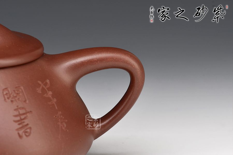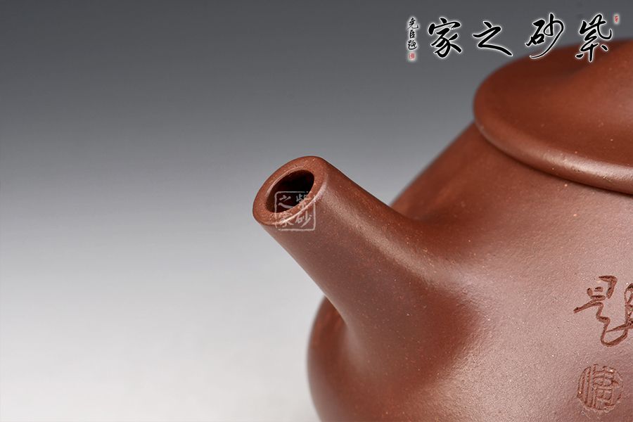 此壺為作者摹古而作,以景舟石瓢為型。壺身呈八字造型,豐潤(rùn)飽滿,曲線柔和流暢,平壓蓋、橋鈕,拿取自如,直流簡(jiǎn)而有力,出水順暢,壺把上豐下斂,與壺身之型形成和諧的美學(xué)效果,底部三乳足給人以輕靈而穩(wěn)重之感。整器比例精湛,骨肉亭勻,氣韻充沛,590cc大品容量,是一把非常實(shí)用的品茶利器。