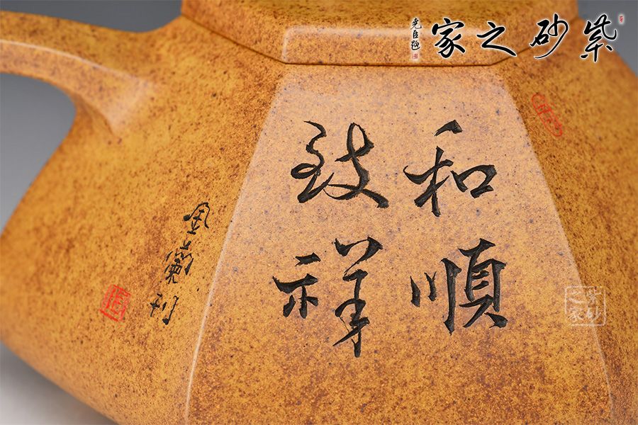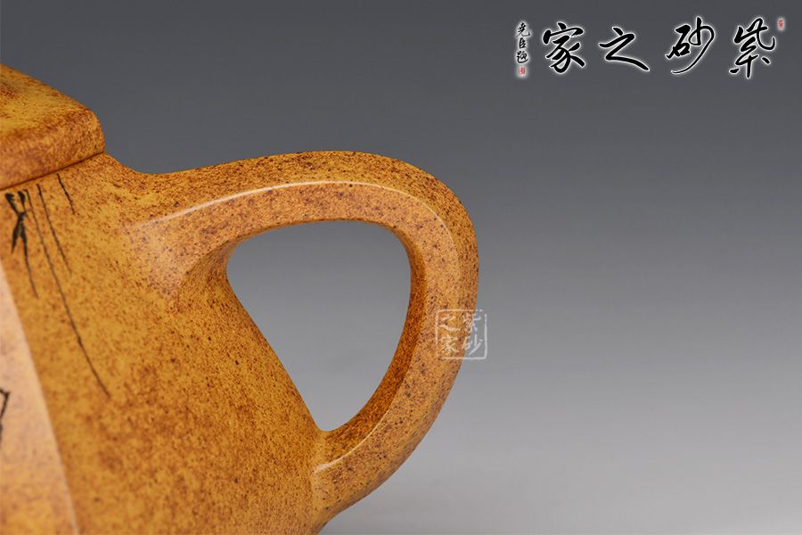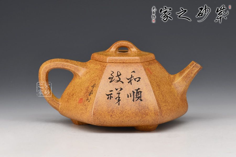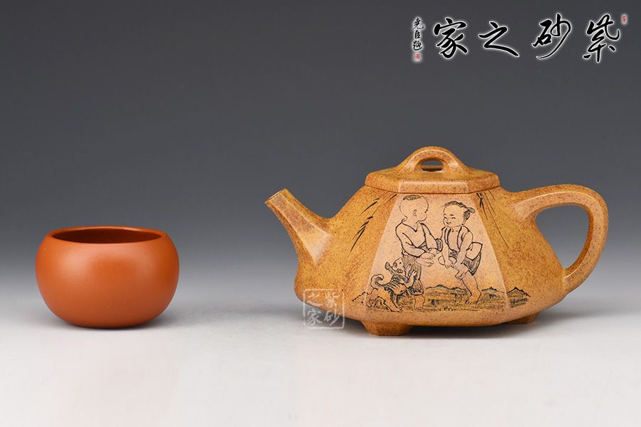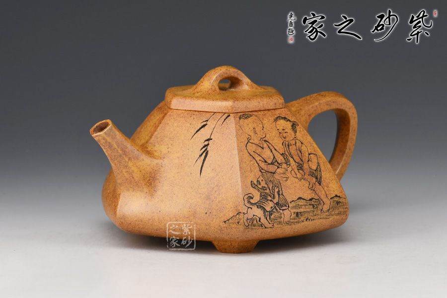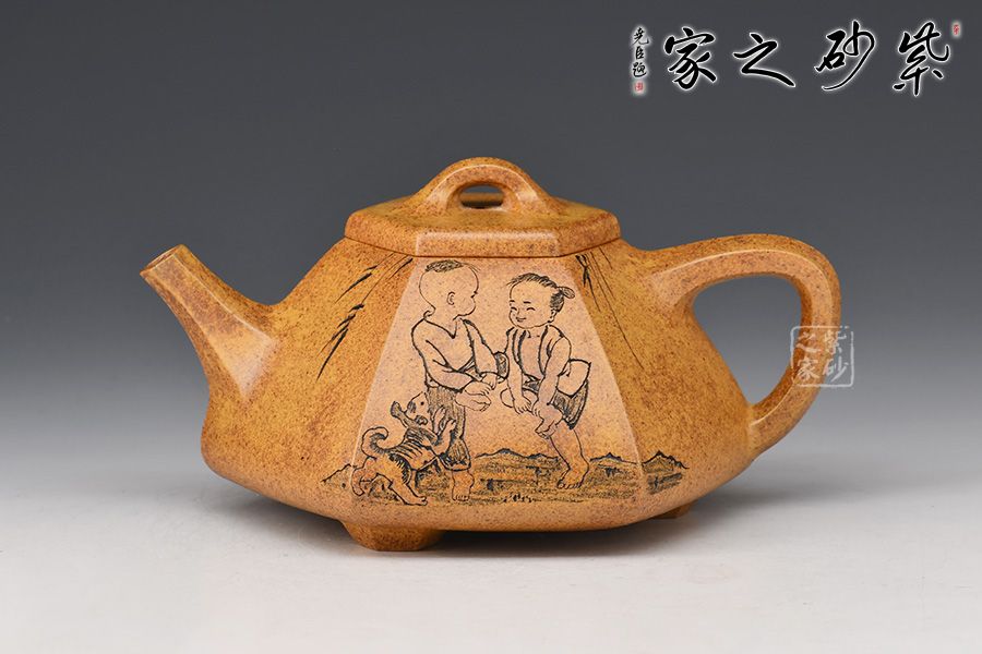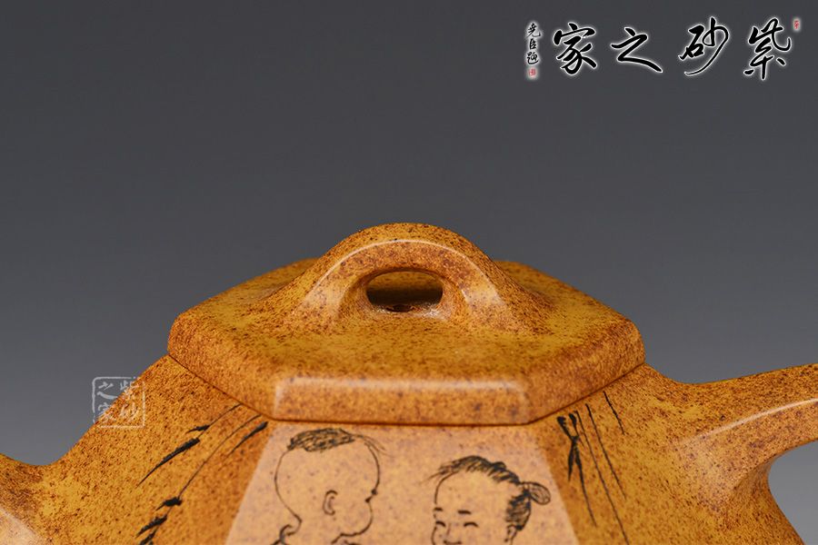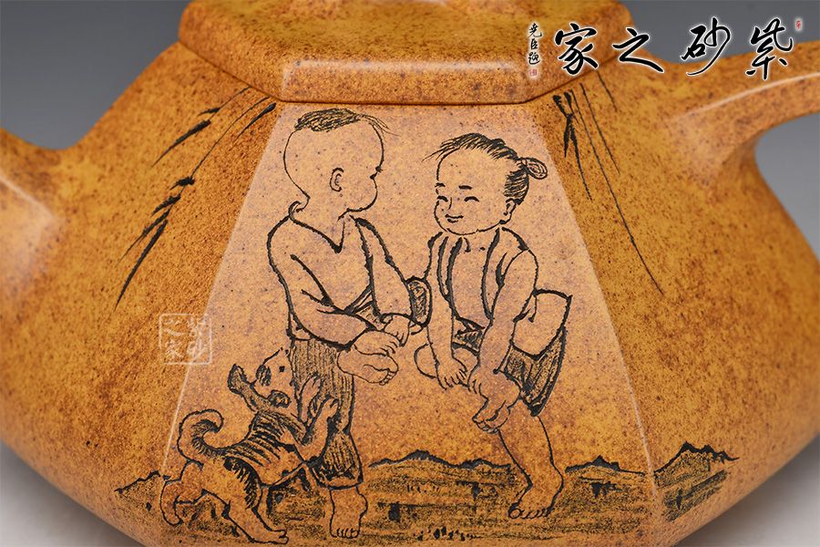 六方石瓢是由傳統(tǒng)石瓢壺延伸而來,此壺選用稀有黃金砂泥料制作而成,色澤古樸,彰顯帝王之氣。上斂下寬,底部三足使用穩(wěn)當(dāng),直流壺嘴出水爽快,三角把端握舒適。整器飽滿豐潤,壺身由任淦庭一脈陶金蘭刻繪孩童嬉戲圖,功力深厚!此壺把玩舒適,手感好,是實(shí)用與欣賞于一體的作品。