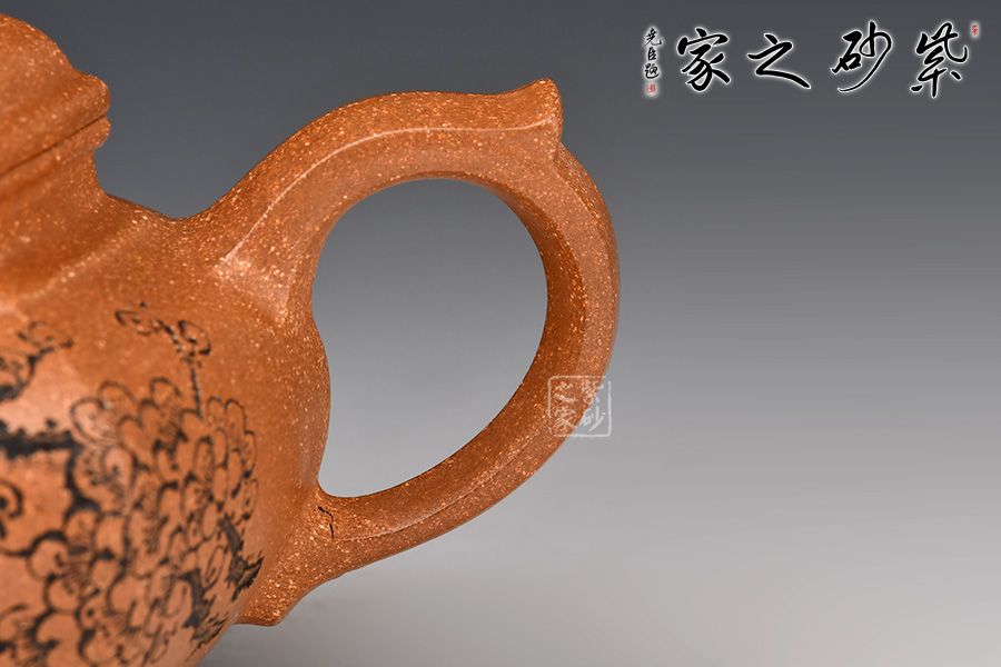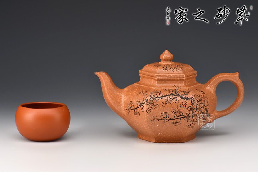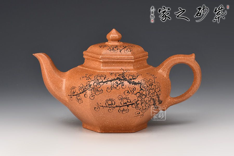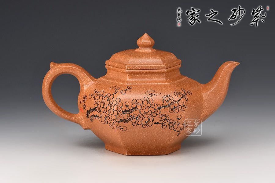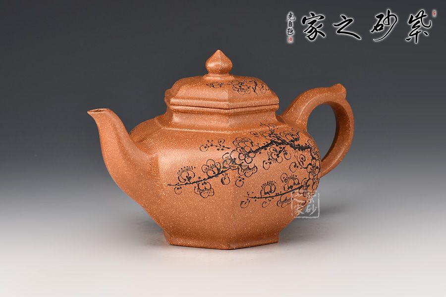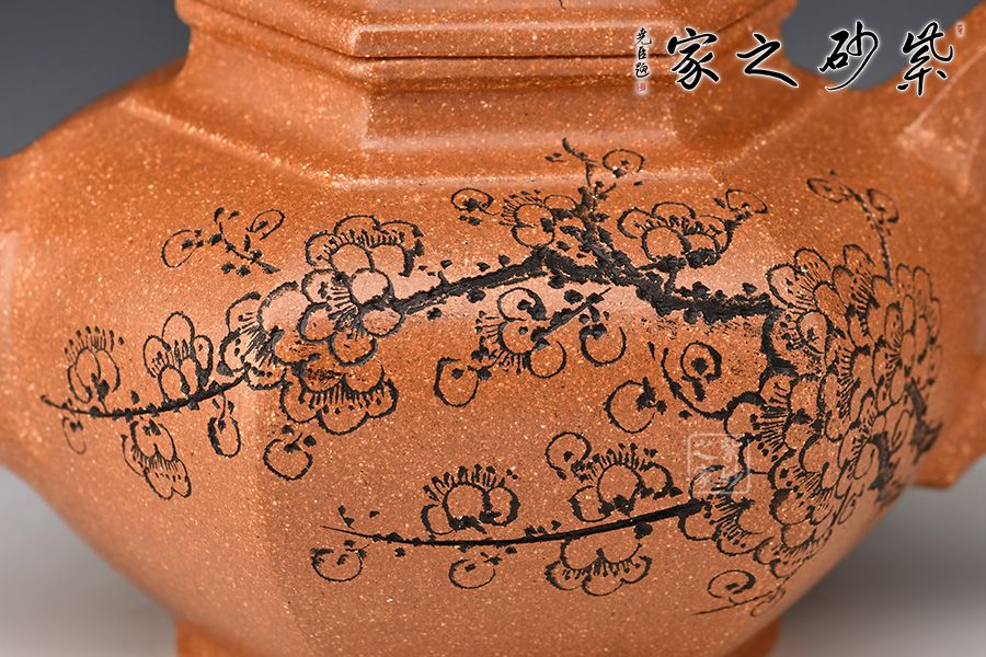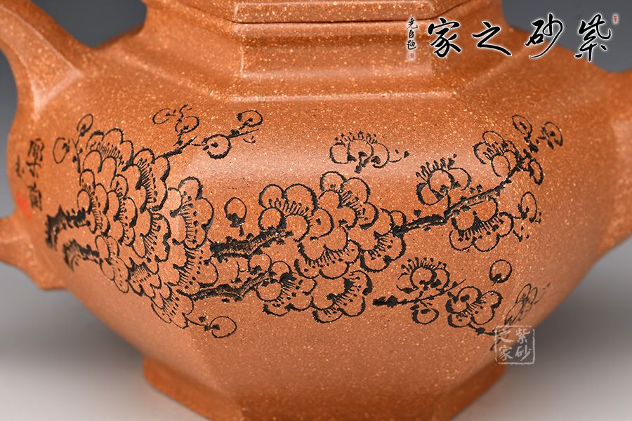 壺嘴、壺把均為六方,呼應(yīng)主題;壓蓋嚴(yán)絲合縫,壺鈕似小巧的壺身,韻味十足;壺身加底挺拔壺身。 笑櫻壺的線條美感要求流暢、自如,方器要求點、線、面清晰明確,塊面清晰。壺身沈倩老師刻繪的梅花傲骨猶存,為此壺增添了風(fēng)骨,此壺不論是自用或是送人都為佳品!