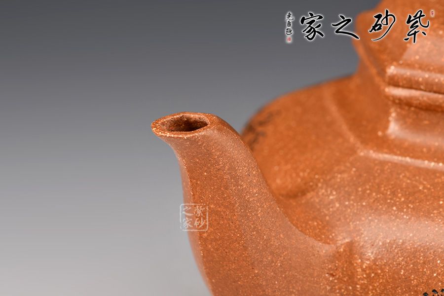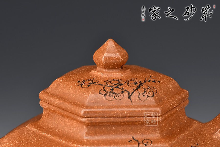 此壺以經(jīng)典器型笑櫻壺為原型,運用原礦蟹黃泥作胎,胎質(zhì)細(xì)膩,典雅溫潤。老師在自己的創(chuàng)新上制作此壺,打破傳統(tǒng)笑櫻圓器的造型,以六方定形,弧線與棱角的結(jié)合堪稱剛?cè)岵?jì)。六方取六六大順之美意,如意吉祥的意思。