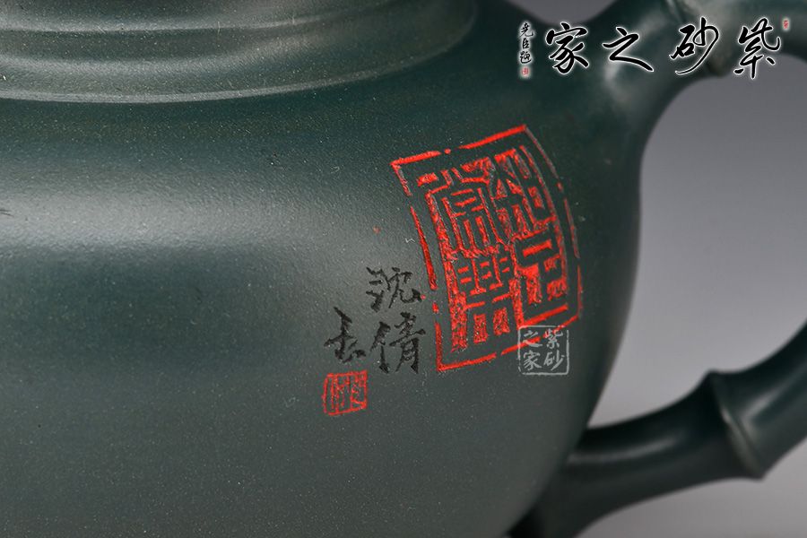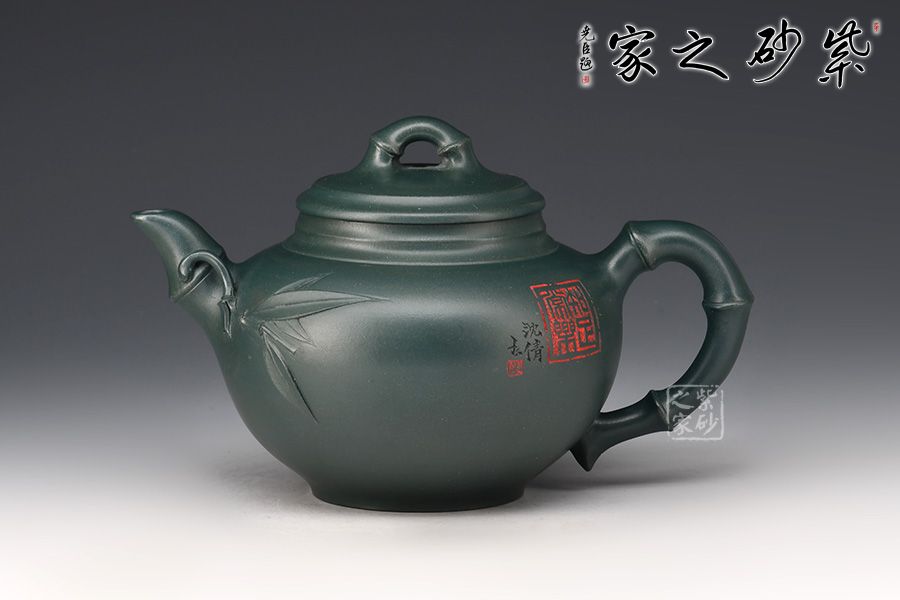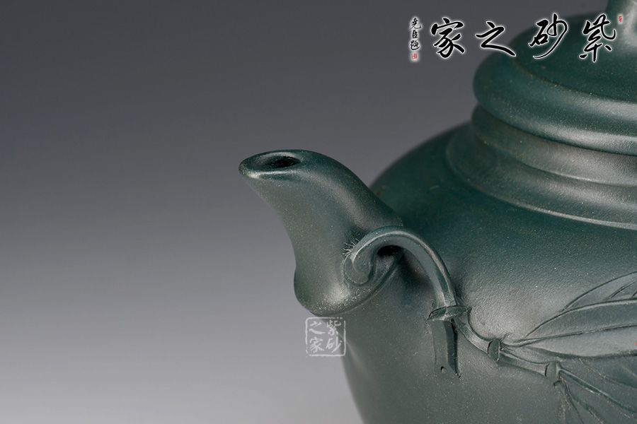 此壺以經典器型笑櫻壺為原型,在此基礎上加以竹節(jié)元素,壺身飽滿圓潤,壺鈕、流和壺把皆以竹節(jié)裝飾,加之原礦綠泥,氣韻飽滿,高風亮節(jié)!壓蓋微鼓壺頸較高,線條流暢,比例恰到好處,壺身的貼花更是為此壺增添了勃勃生機!