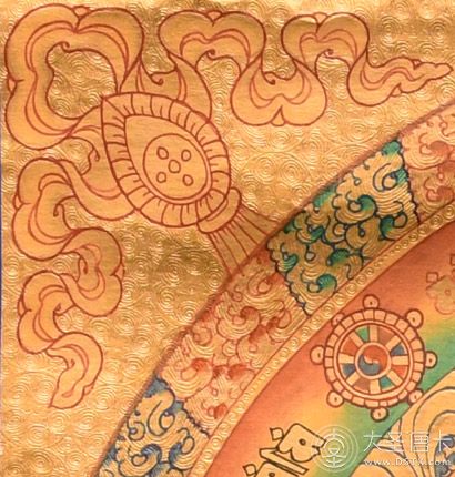 在繪制佛像服飾等位置時,用刻金技法,使圖案更具豐富的層次和立體感,用金勾勒的線條和圖案不但明亮度進一步提高,讓畫面更加燦爛,而且也使金在畫面上保持得更加長久。