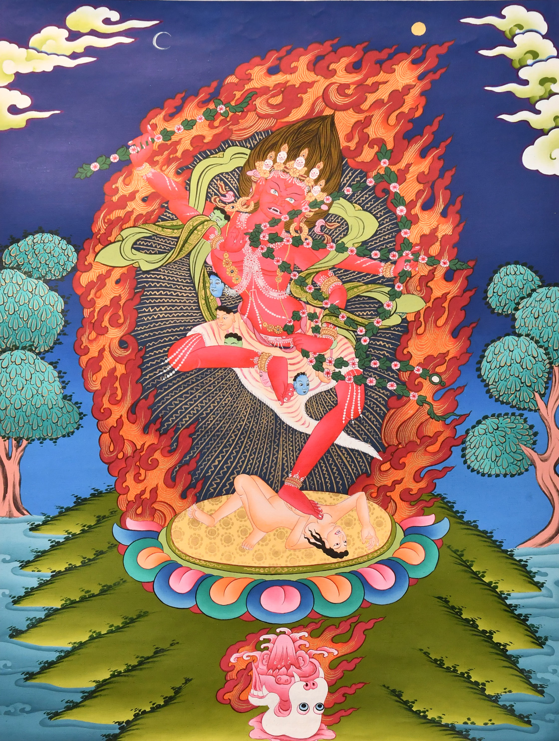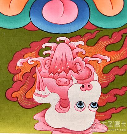 | 唐卡“師傅”開臉,筆路穩重流暢。體現完美天人相,可見佛菩薩慈眉善目,賦予唐卡畫像生的靈氣。 | 細節決定品質,點睛之筆不到位影響整體美觀,五官比例不協調,面目呆板,缺乏靈氣。 |