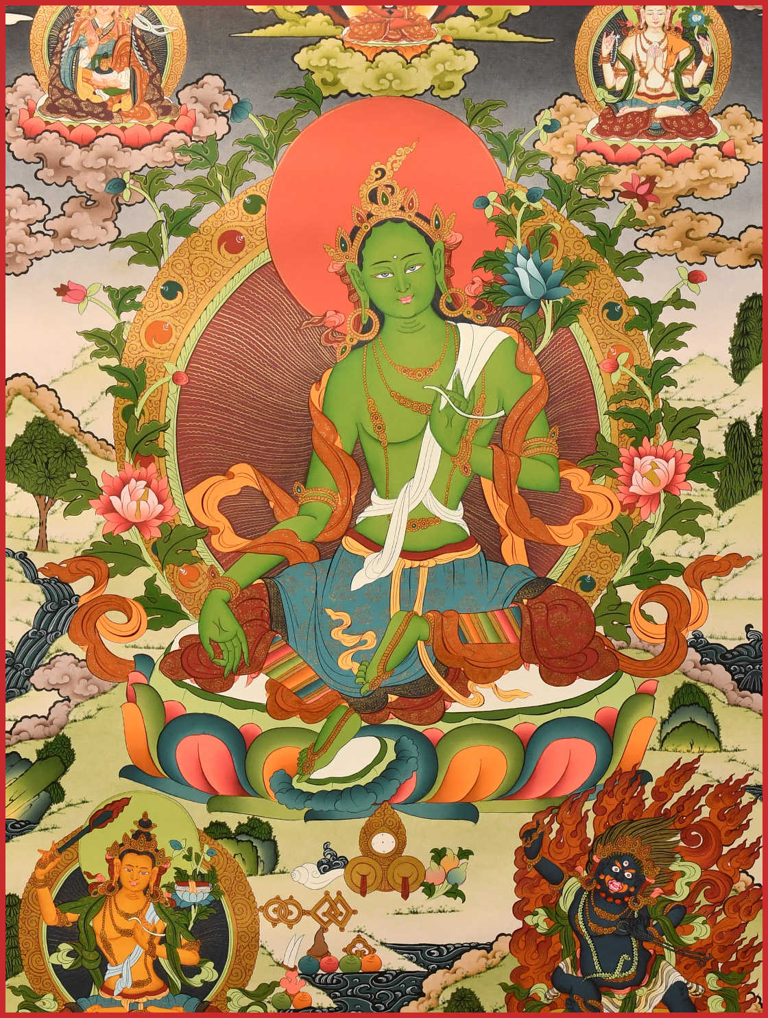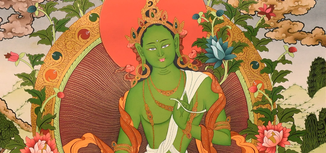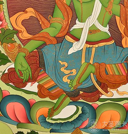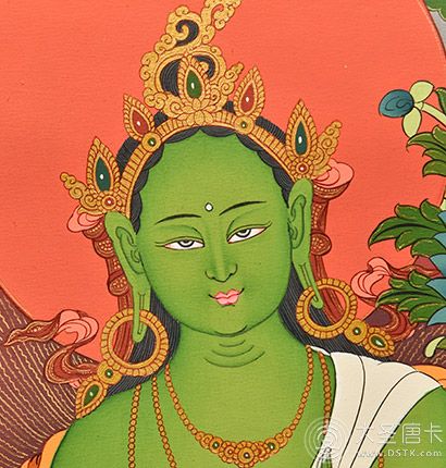 綠度母是從觀音菩薩的眼淚中化現出來的,寓意吉祥圓滿、事事順利、平安幸福等。綠度母是二十一度母的總集,能救八種苦難,本尊心咒具足一切息增懷誅之功用,消除一切眾生的煩惱痛苦、滿足一切眾生愿求。