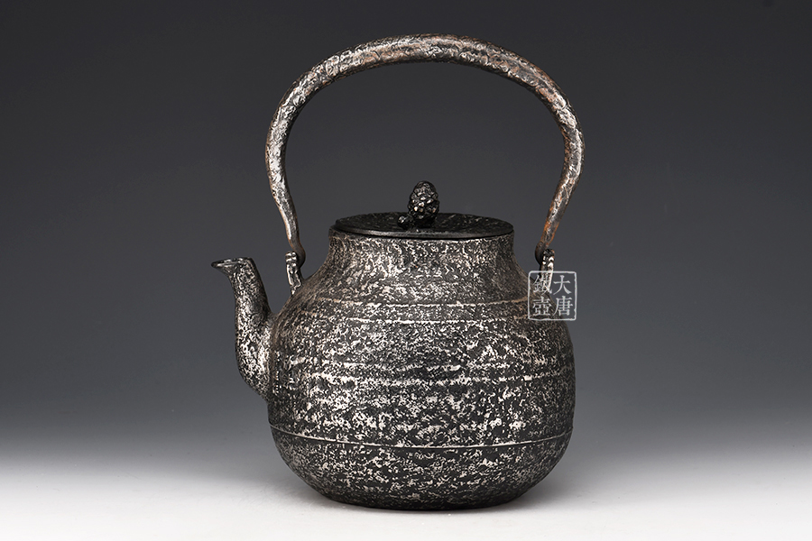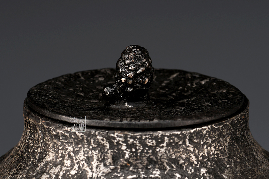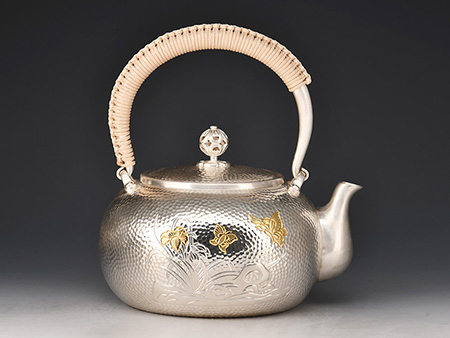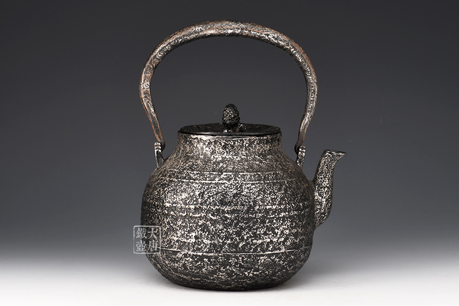 荒井工房的鐵瓶除了在鑄造工藝上有嚴(yán)格的規(guī)范和體系,在鐵瓶裝飾技術(shù)上也頗有建樹。除了傳統(tǒng)的印刻技術(shù)外,荒井工房還掌握了非常出色的金銀鑲嵌技藝,尤其以大片的鏨刻銀片最為出眾,這在山形當(dāng)?shù)靥每谥歇殬湟粠谩?/p>