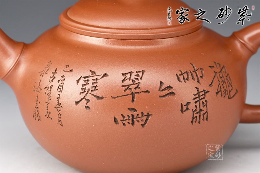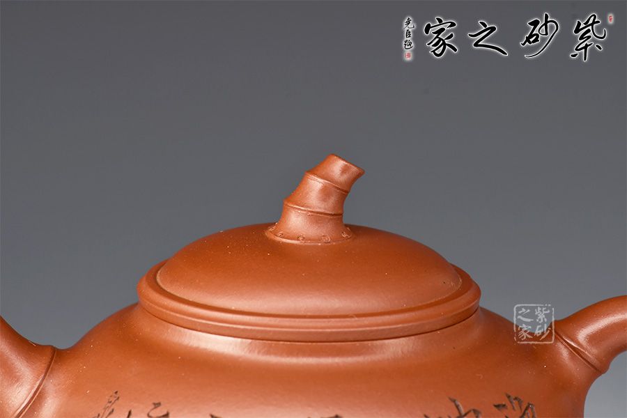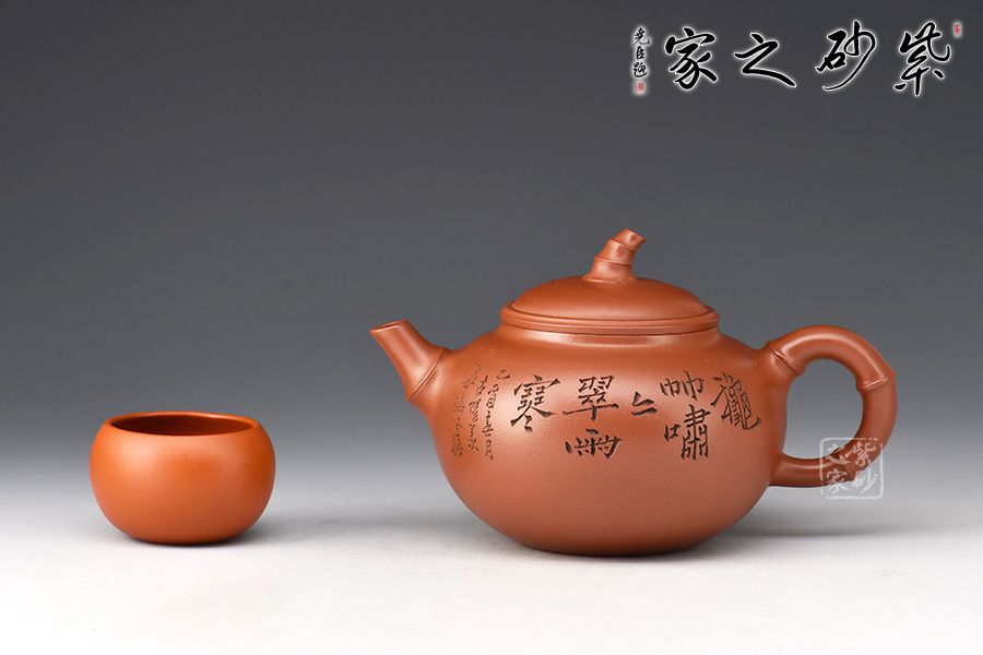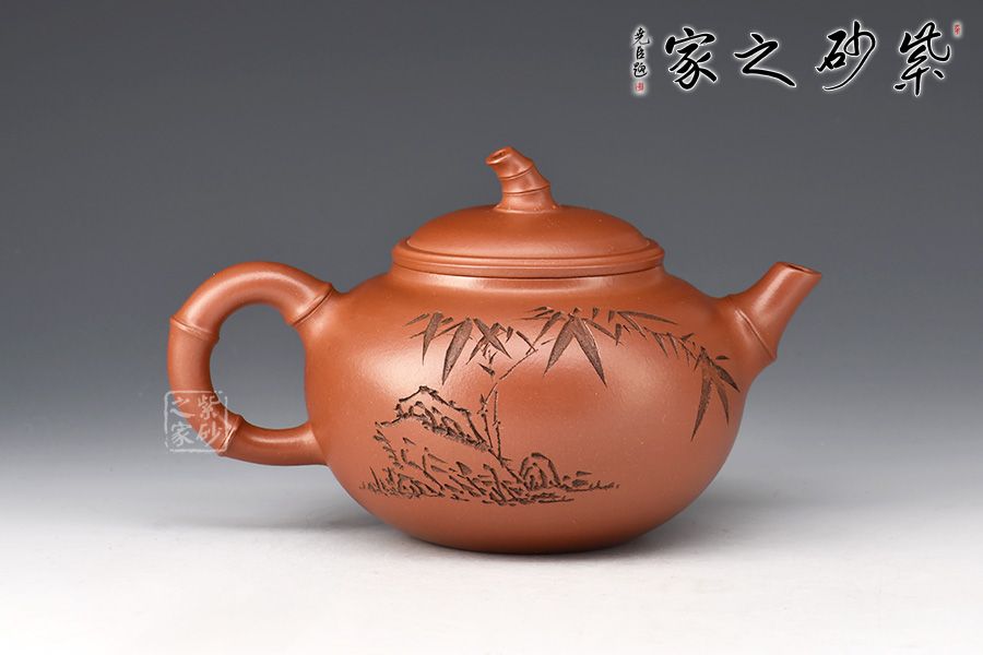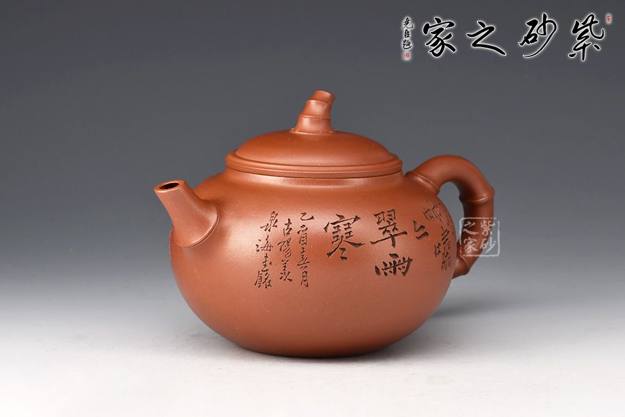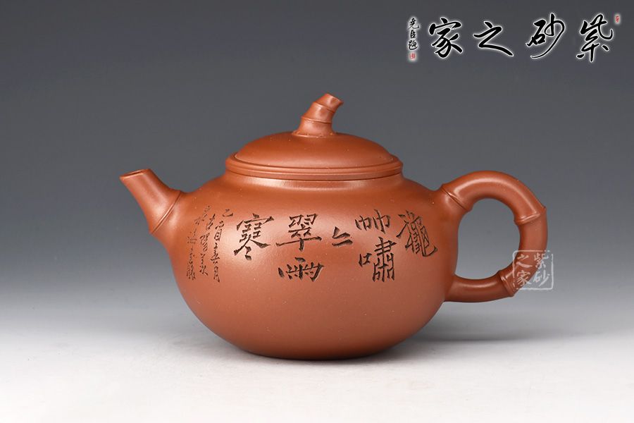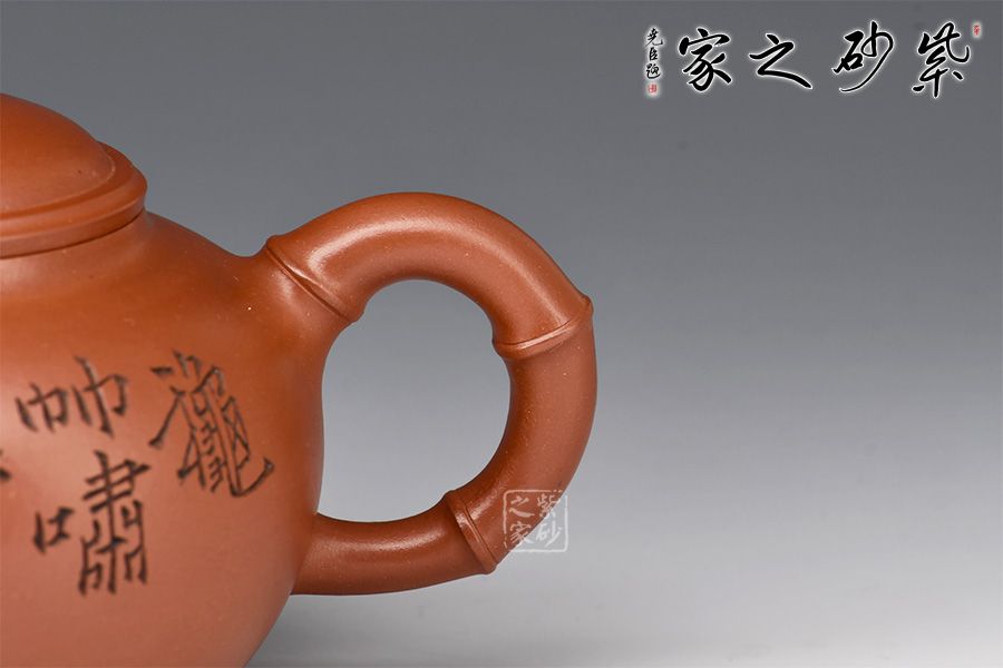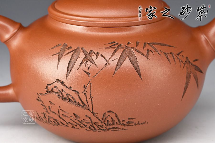 當(dāng)今紫砂藝人以竹為造型題材創(chuàng)作的壺式較為廣泛,風(fēng)格清雅。此壺圓敦豐潤(rùn),流、鈕、鋬飾以竹節(jié)狀,渾厚內(nèi)蘊(yùn)。壺身譚泉海大師陶刻,正面詩(shī)詞、反面竹子,前后呼應(yīng)主題。全器簡(jiǎn)練渾厚,工藝精湛,宛若天成,大師陶刻,推薦收藏。