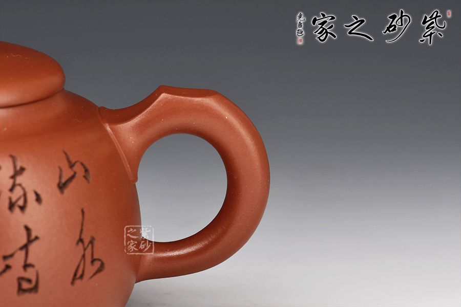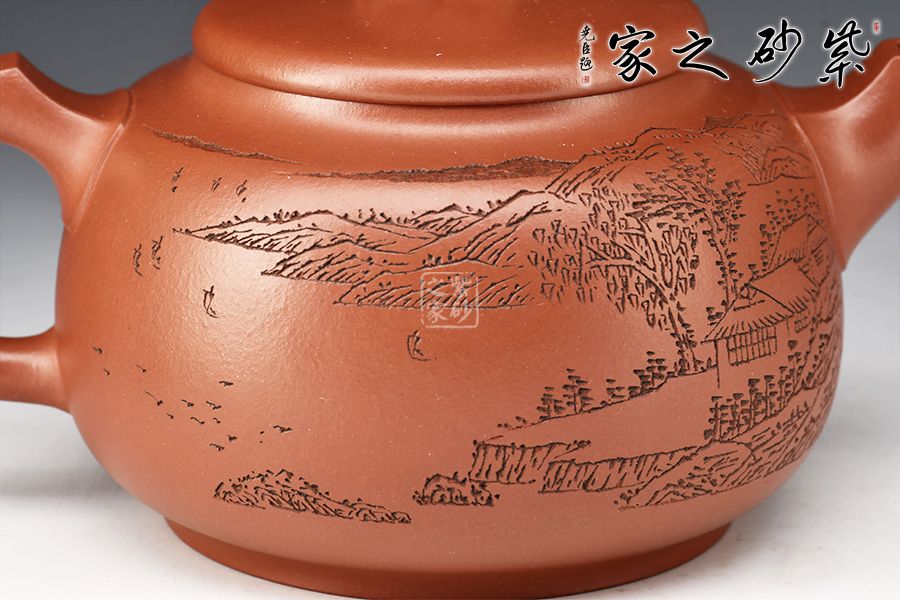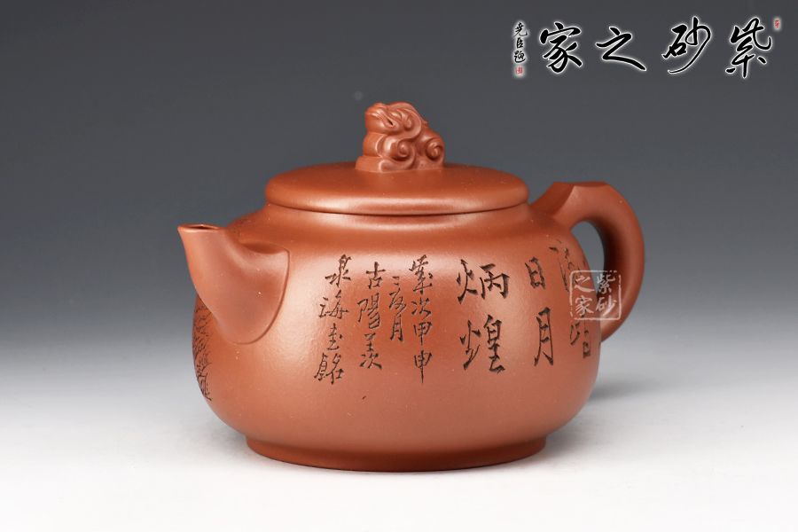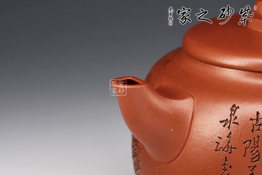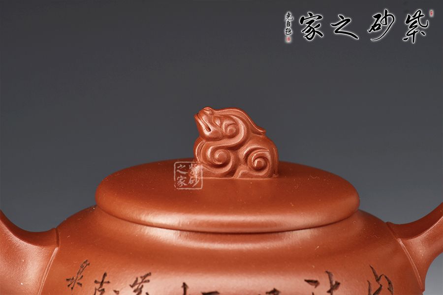 此壺方圓結(jié)合,端莊形態(tài)里有圓潤(rùn)美感。圓底圈足,氣質(zhì)不俗。壺蓋平滑洗練,瑞獸壺鈕小巧精致,栩栩如生。壺嘴和壺把明接,壺嘴粗細(xì)過(guò)渡落差劇烈,有方有圓,力道中有柔美。壺把圓滑細(xì)膩,刀切的平面工整異常,盡顯利落,古樸形態(tài)和精致裝飾交相輝映。