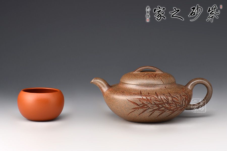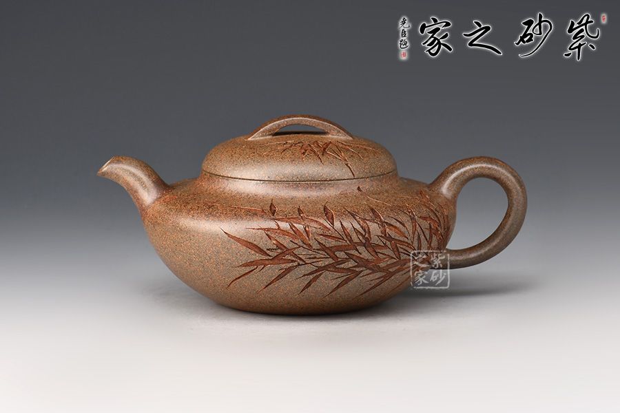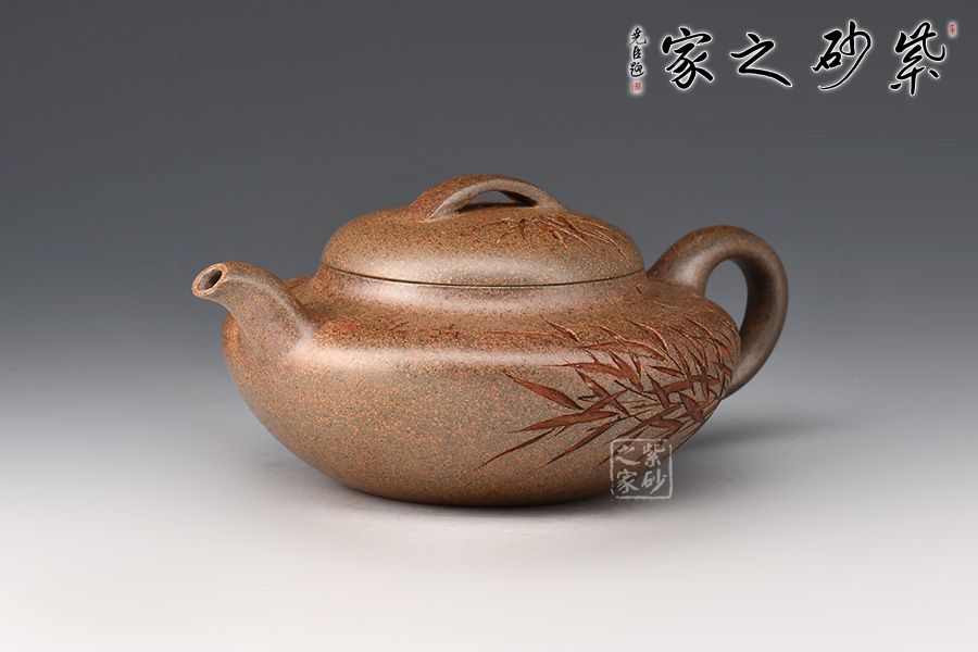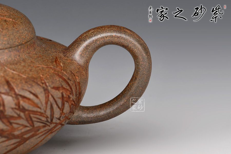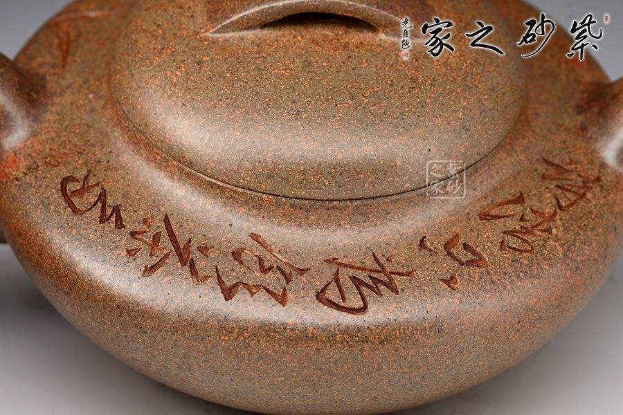 采用了青灰段泥制作而成,壺容量為230cc,造型簡練,大方,扁腹,矮頸,彎流,把如纖細(xì),流把勻稱自然,口蓋直而緊縫,壺蓋半圓高高隆起,蓋上設(shè)扁球鈕。壺形樸拙謙和,造工精細(xì),美妙絕倫。此壺高貴之氣盡于無言之中,簡約有章,厚重中略顯莊嚴(yán)樸實。