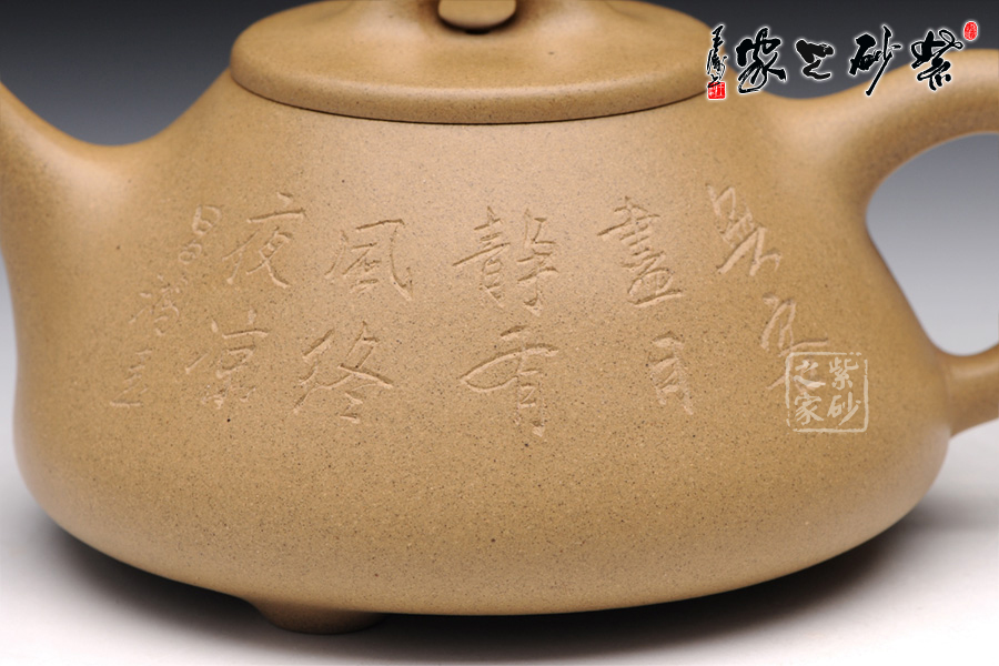 本山綠泥制作的石瓢視覺上清新淡雅,素凈美觀,此款石瓢精、氣、神俱佳,憑流、把、鈕及壺身的比例搭配來展現(xiàn)作品風(fēng)格,使得整器線條流暢舒展,比例協(xié)調(diào)秀美,可謂剛?cè)嵯酀?jì),作品氣度深沉內(nèi)斂,極富韻味。壺身正面由李昌鴻題寫“無客盡日靜,有風(fēng)終夜涼”,這是唐代詩人白居易寫的一首《竹窗》,與反面篆刻的竹相得益彰,情景相融!