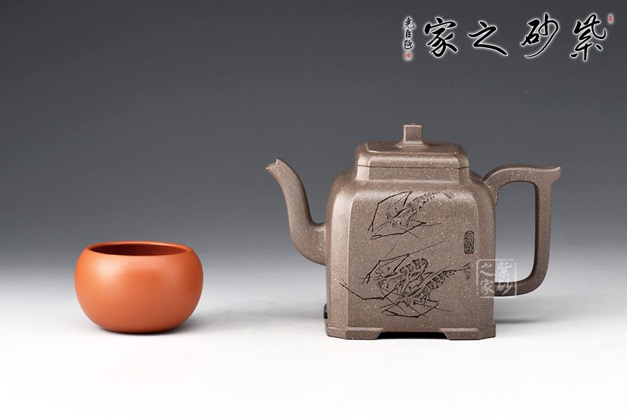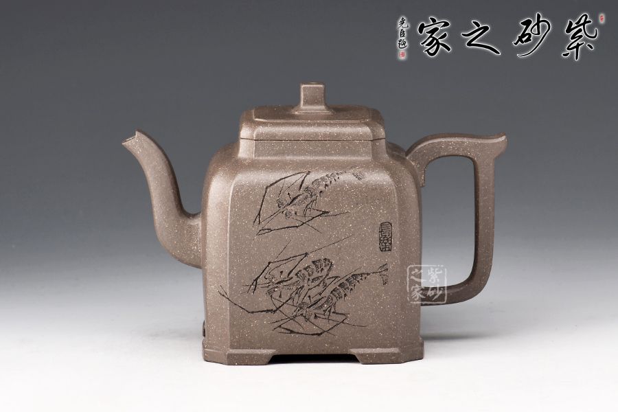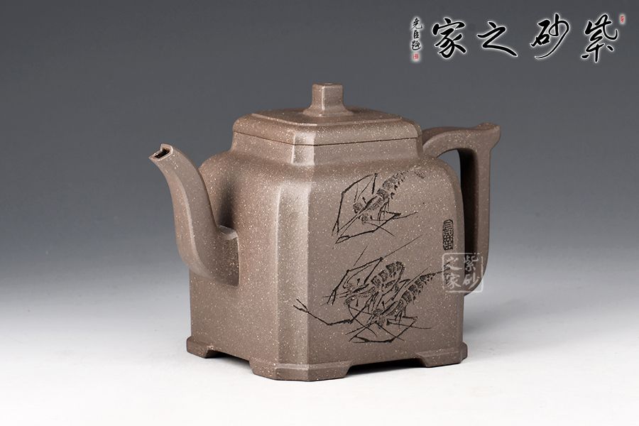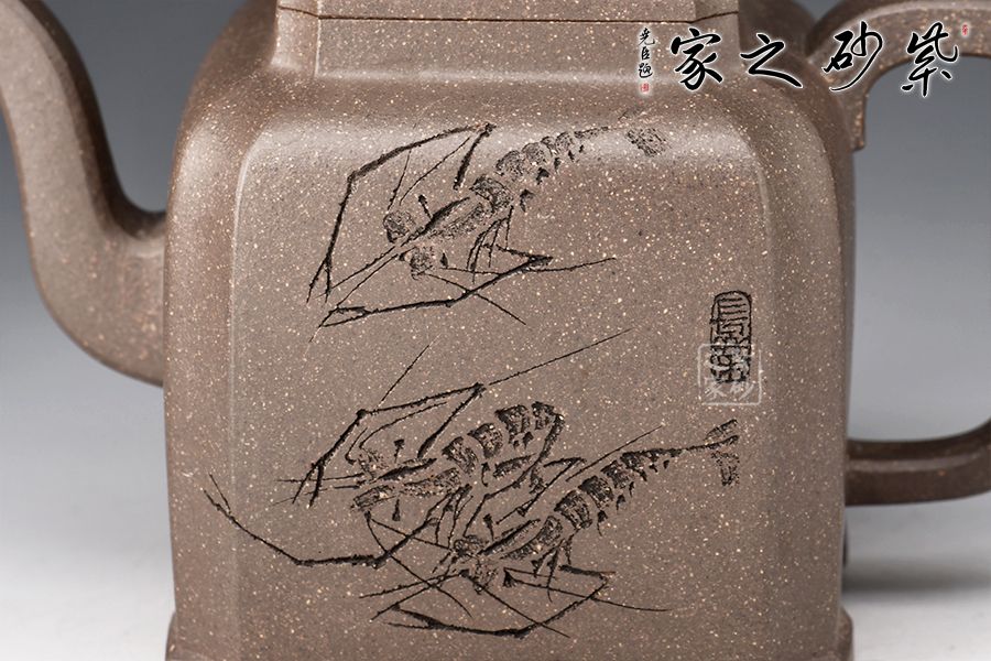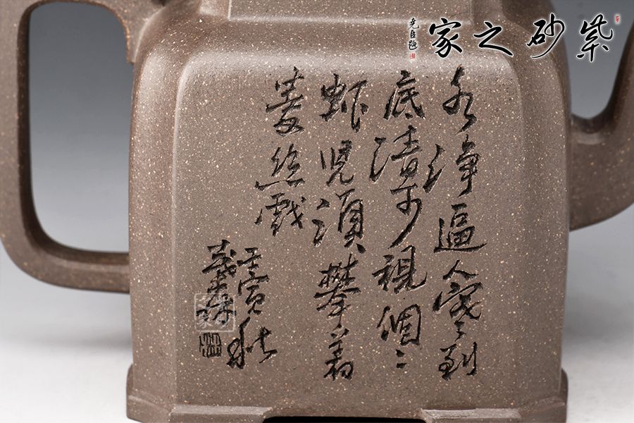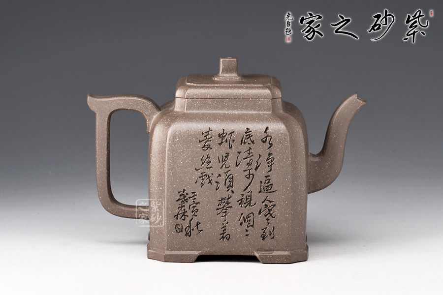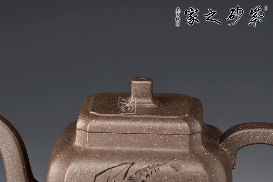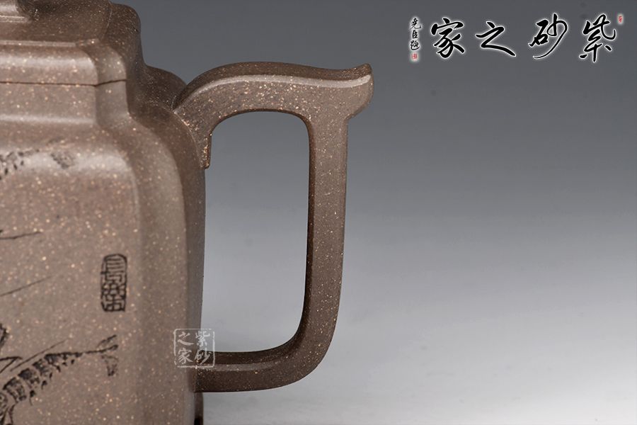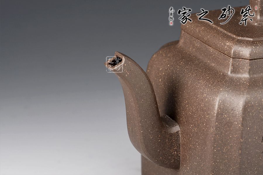 此壺呈八方棱形,高頸有云肩線及口線。高四方鈕朝上,蓋頂平面與蓋面的八棱交接,四方三彎流呈直折角,四方飛把與壺身銜接。蓋四面置換吻合適宜,角線面制作工整,曲線飽滿,氣勢恢宏,整器沉穩(wěn)雄健,氣勢盎然,乃老師佳作。
