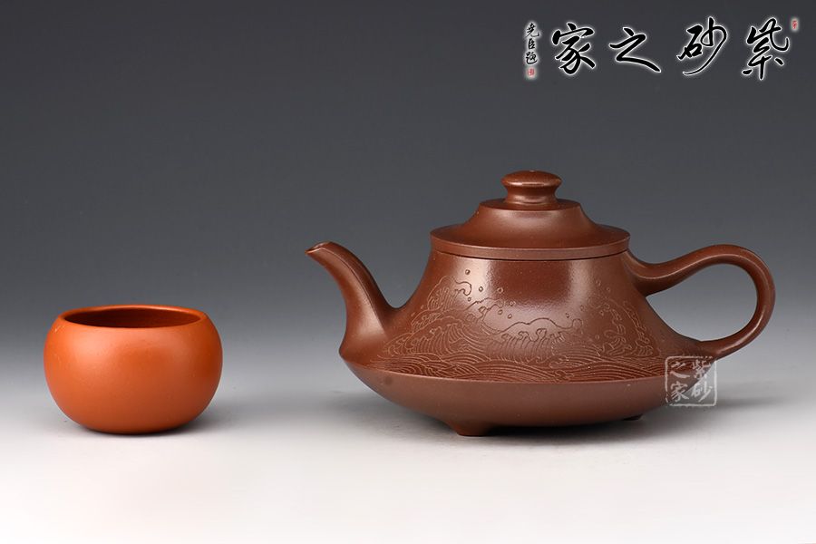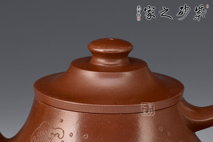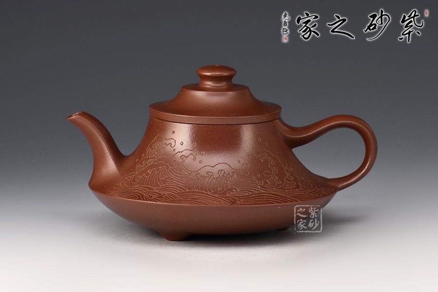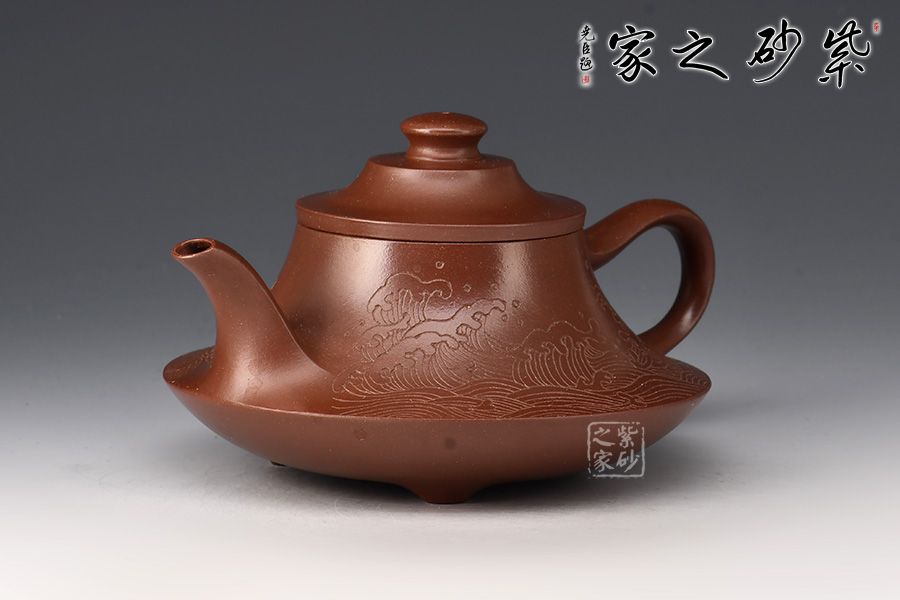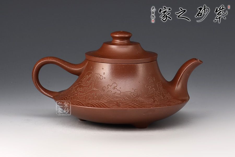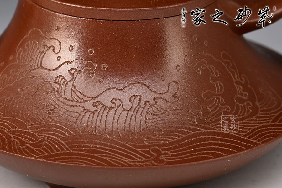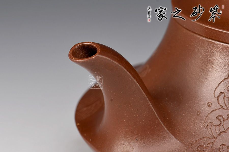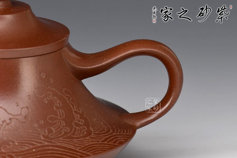 壺身上窄下寬,壺底如同一個(gè)盤子與壺身相接,相交處可見一條腰線,力蘊(yùn)十足。壺嘴與壺把皆從底部腰線延伸而至,自然過渡,線條粗獷流暢。壺嘴口朝天,出水利落;壺把從壺身蜿蜒而下,如流水曲觴,彰顯力度,與壺身相合,形成一個(gè)漂亮的耳把。