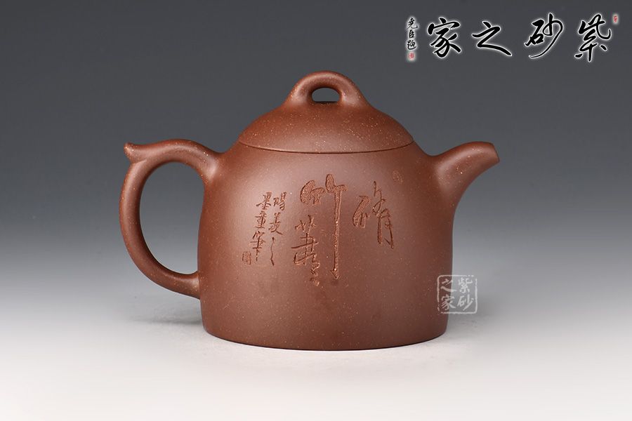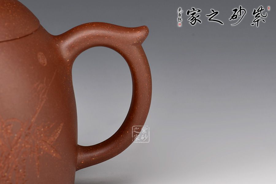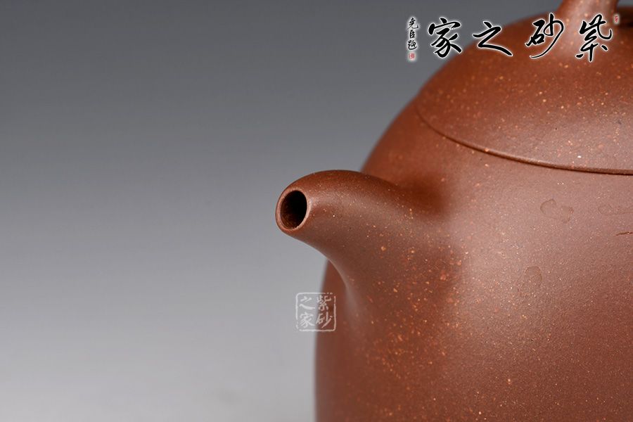 此壺壺身若秤砣之形,高聳挺立,自下至上逐漸收斂,截蓋上下渾然一體,線條自然流暢。一彎流短而挺拔,出水爽利,環(huán)形飛把不矯不揚,儒雅端莊。