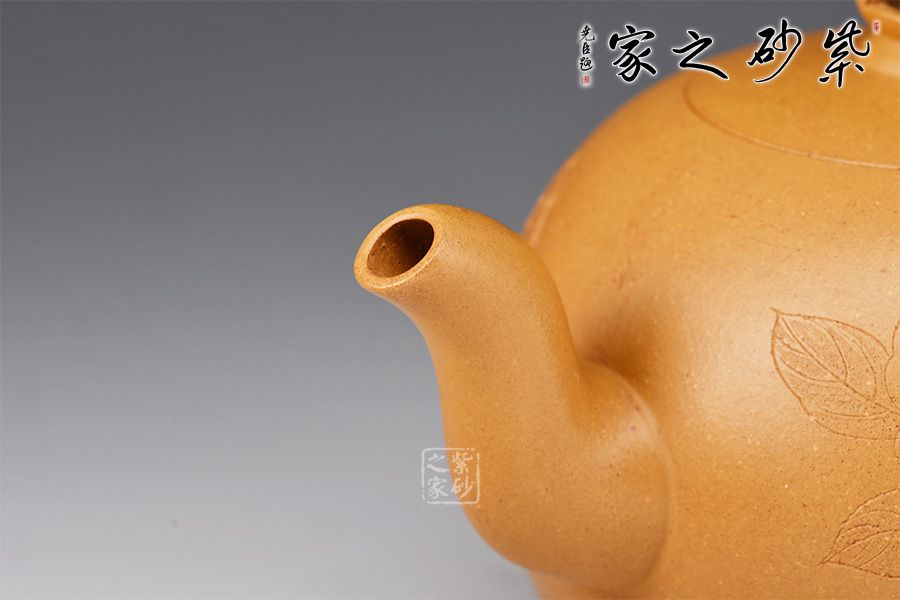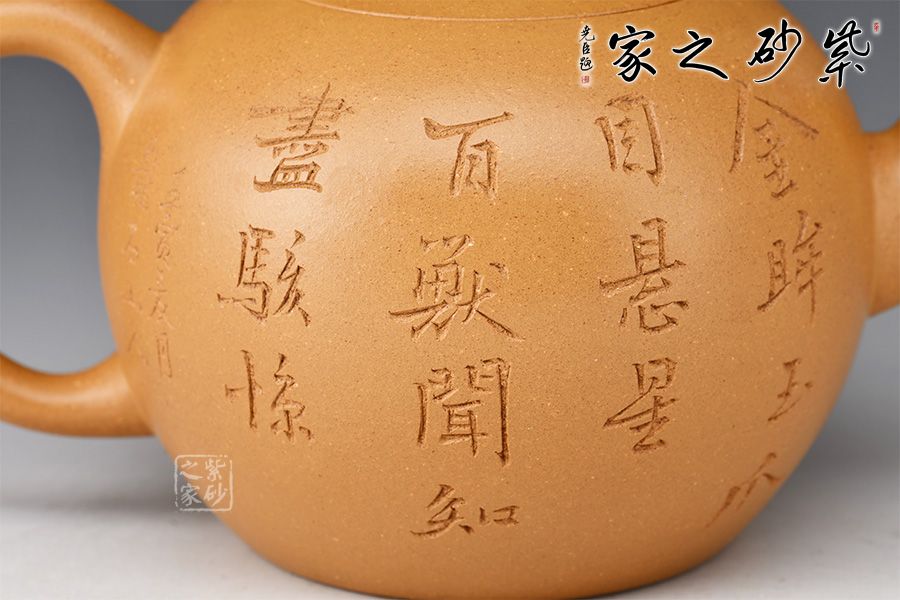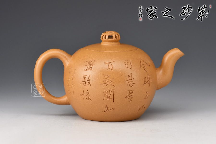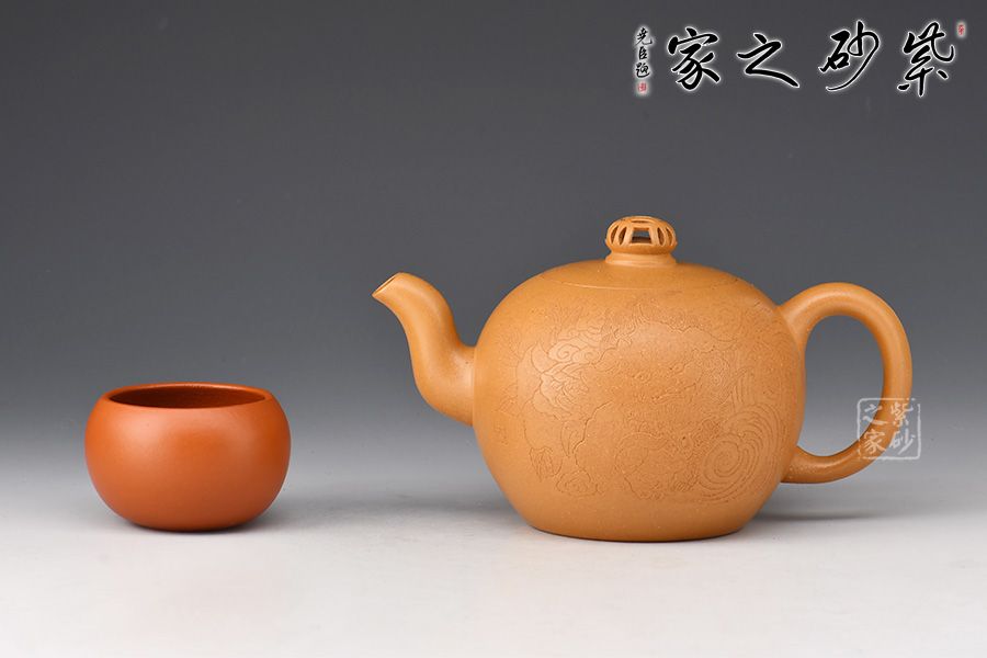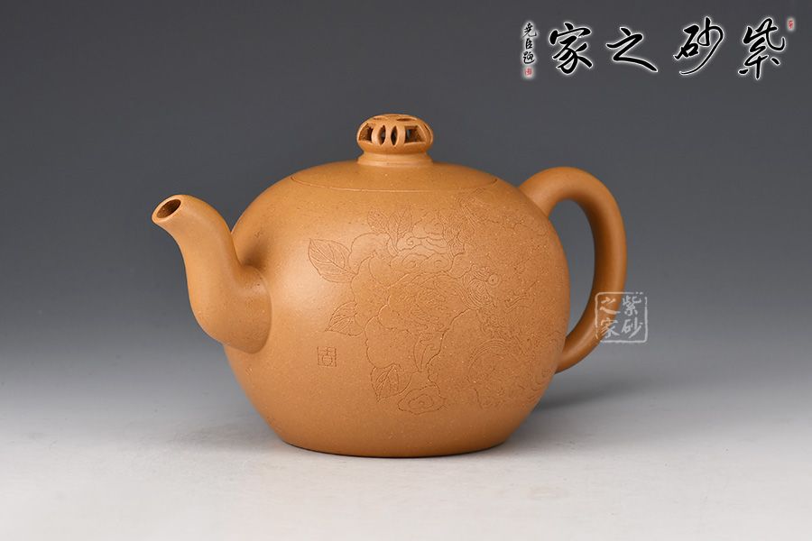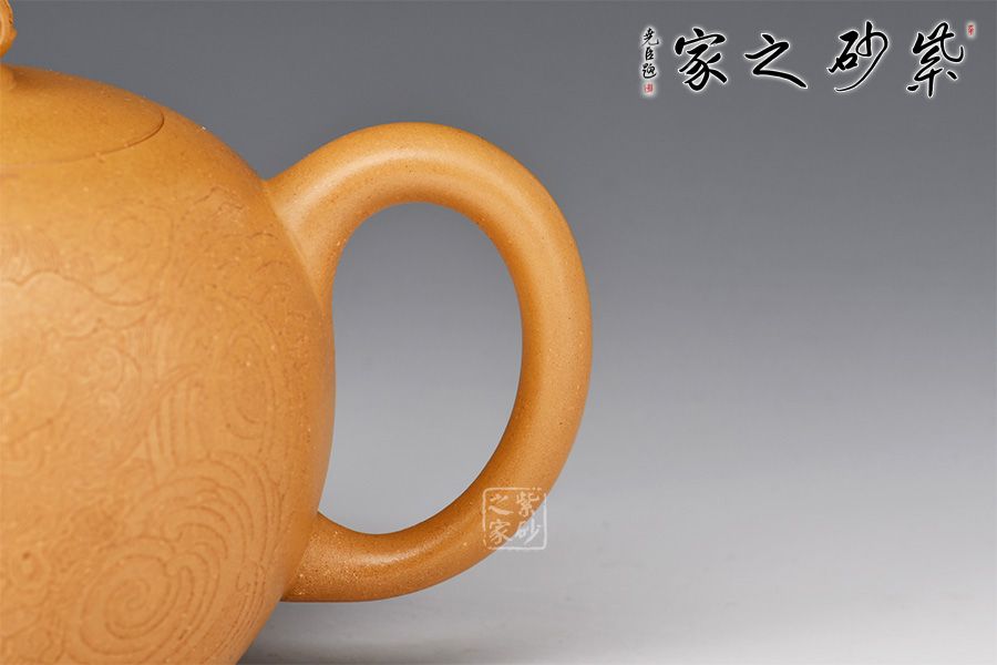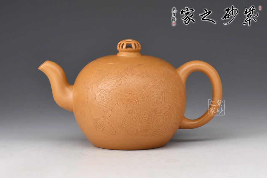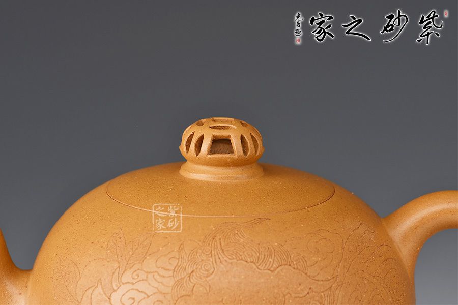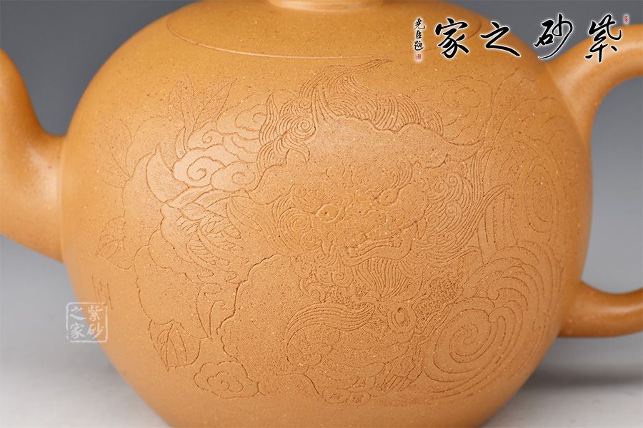 金獅獻瑞,福滿人間。整壺造型珠圓玉潤,象征圓滿如意。珠鈕小巧別致,形似繡球,鏤空設(shè)計。彎流姿態(tài)婀娜,耳把端莊秀美,搭配相得益彰。壺身陶刻獅子舞繡球,刻繪精湛,賞用皆宜,值得入手把玩。