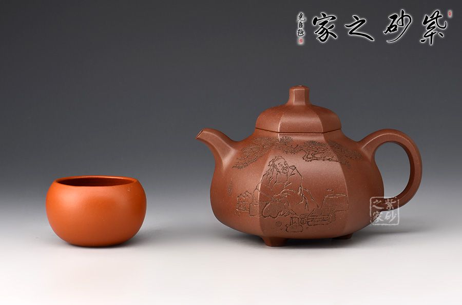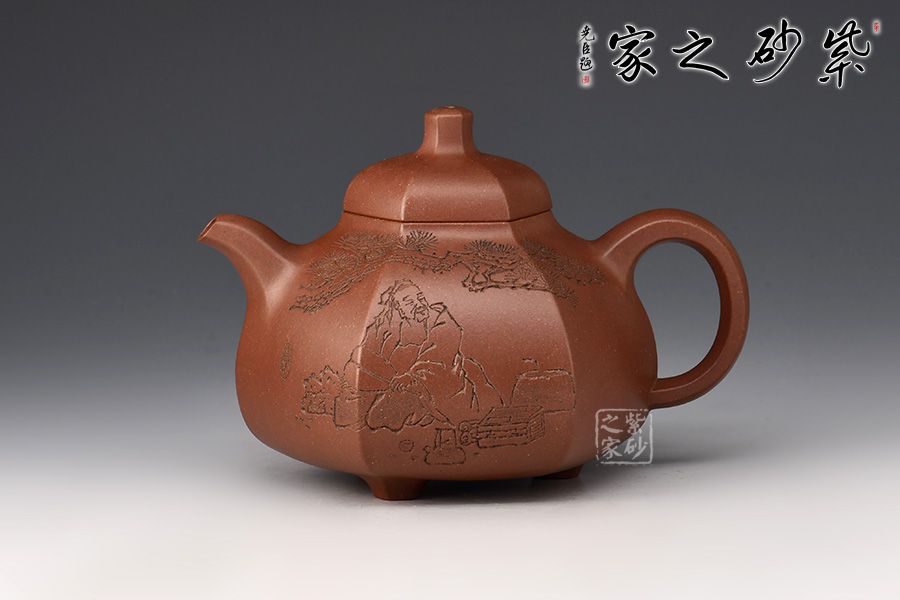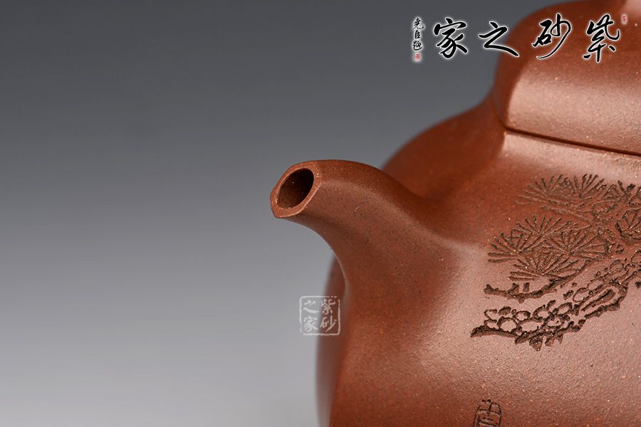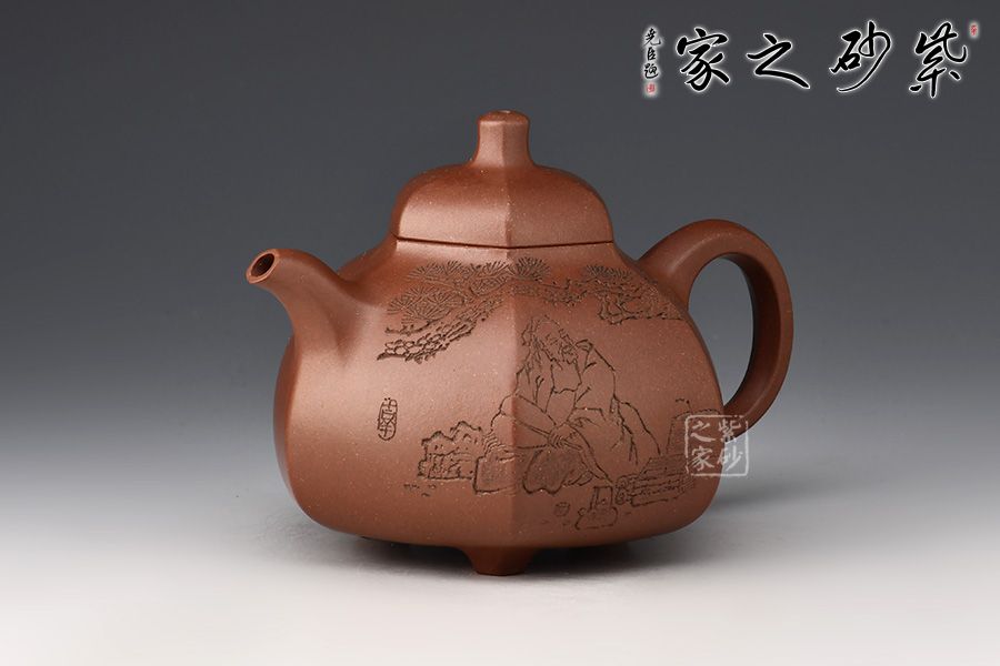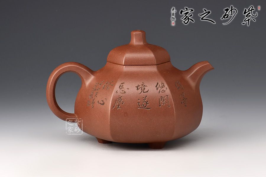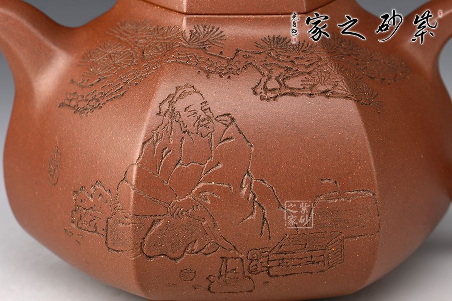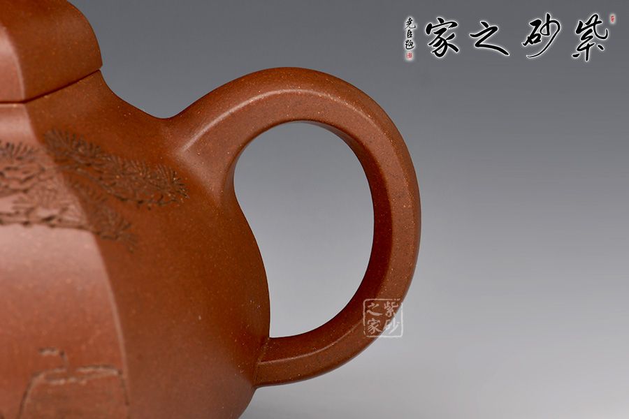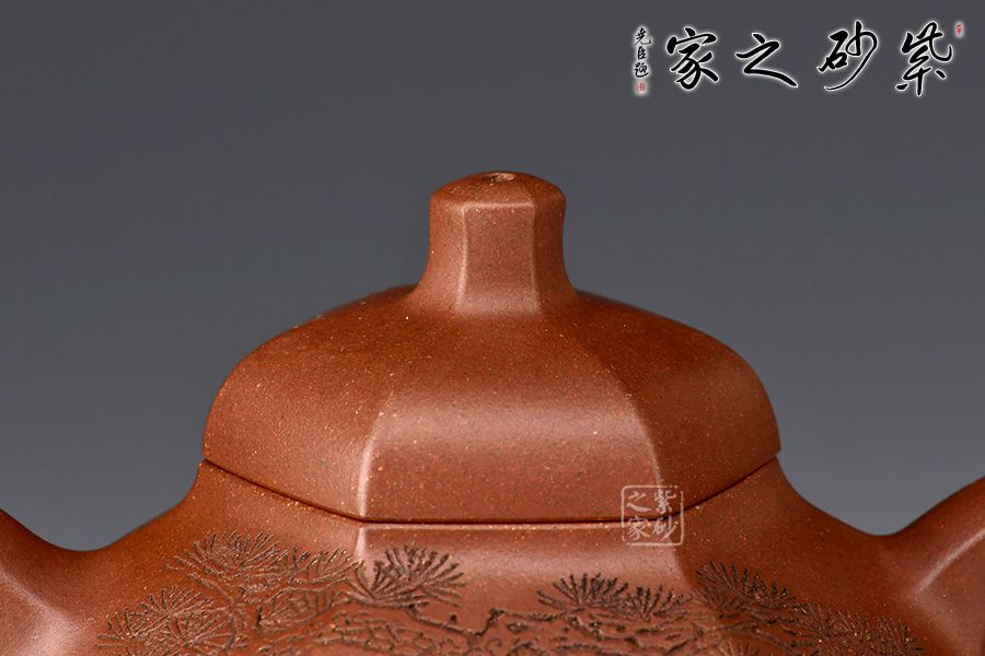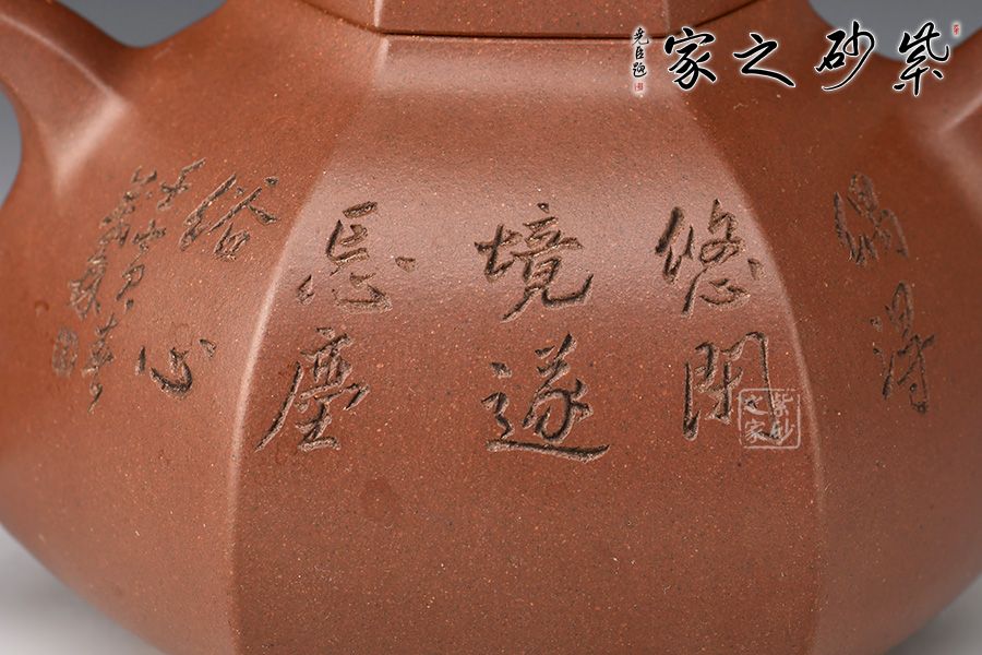 此壺乃是在六方掇球壺的基礎(chǔ)創(chuàng)新上演變而來,壺身各部均分為六面,鑲接成型工藝難度大,點(diǎn)線面清晰明確,線條自壺鈕氣孔處斜斜流瀉而下,各面略鼓出,肌理豐盈而力道渾厚。壺嘴為六方彎流,出水爽利,暗接手法與壺身相連,壺把與壺身相對應(yīng)。整個壺型在原有基礎(chǔ)上增加新的創(chuàng)作理念,壺身柔美的線條,上下一氣貫通,構(gòu)思巧妙而制工細(xì)。細(xì)膩的材質(zhì),簡練的線條,這便是紫砂帶來的魅力。此外,壺身刻繪,工藝不凡。