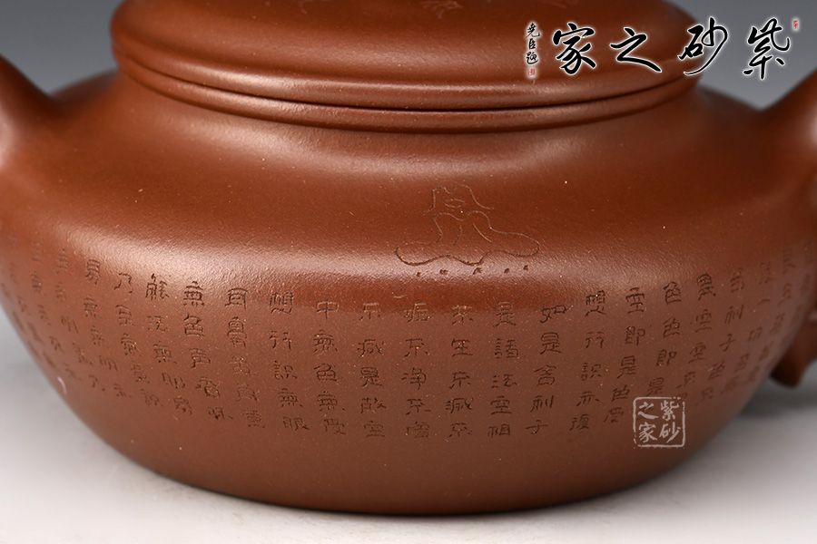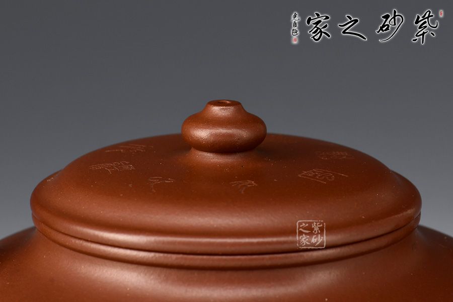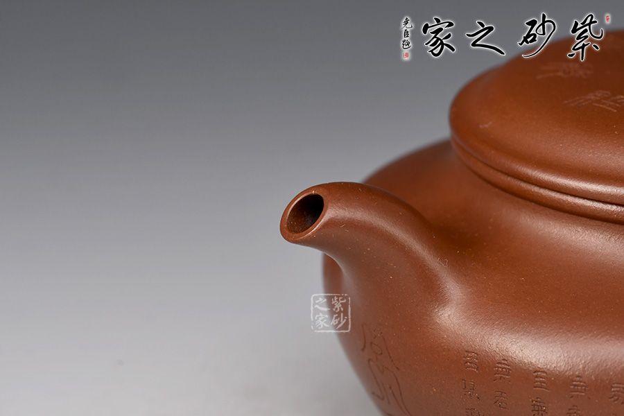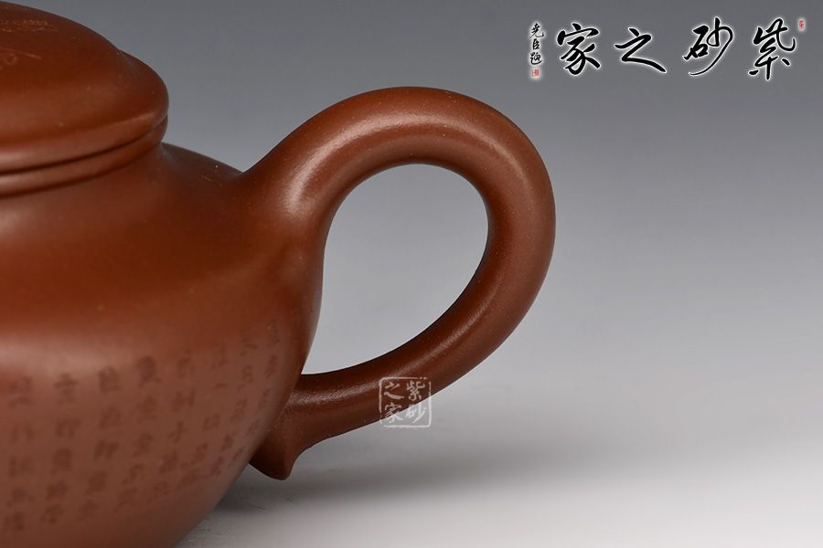 茶壺腹身飽滿,氣定神閑,蓋面平滑,壺蓋沿邊作圓唇外翻,壺蓋與口沿子母線吻合嚴(yán)密,合成圓線極為飽滿,蓋中部上隆呈半圓形,中心作圓珠提鈕。二彎流胥出自然,圓圈把自肩部勢均而起,頸部與身桶一體成型,宛若天成,制作工藝難度極大。
