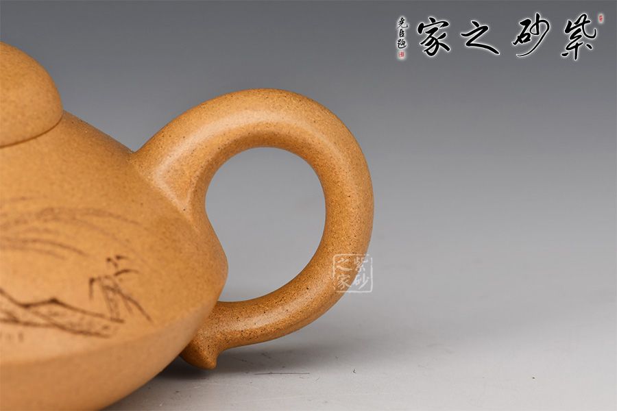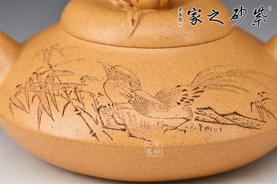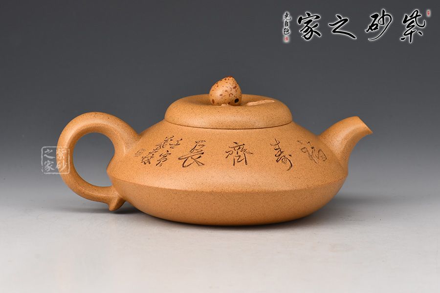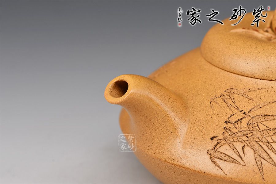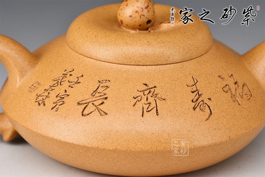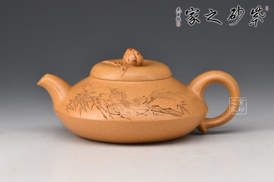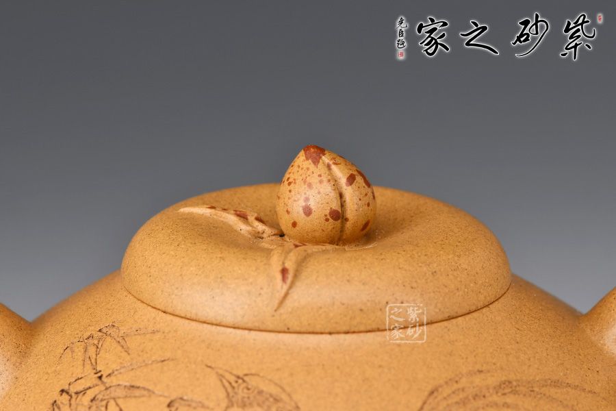 圣桃器型敦厚而穩(wěn)重,壺鈕為桃子造型,兩片桃葉舒展在兩側(cè),形態(tài)逼真,很是喜人;深入壺體,與飽滿的壺身切合恰到好處,壺身圓潤飽滿,而在中國傳統(tǒng)文化中,“圓”往往是“圓圓滿滿”的意思,同樣表達(dá)吉祥祝福之意,與桃子的主題相得益彰。壺嘴和壺把桃枝裝飾而成,在壺把處一側(cè)伸出一條嫩枝,幾片綠綠的桃葉在壺身舒展開去,充滿生命的活力。