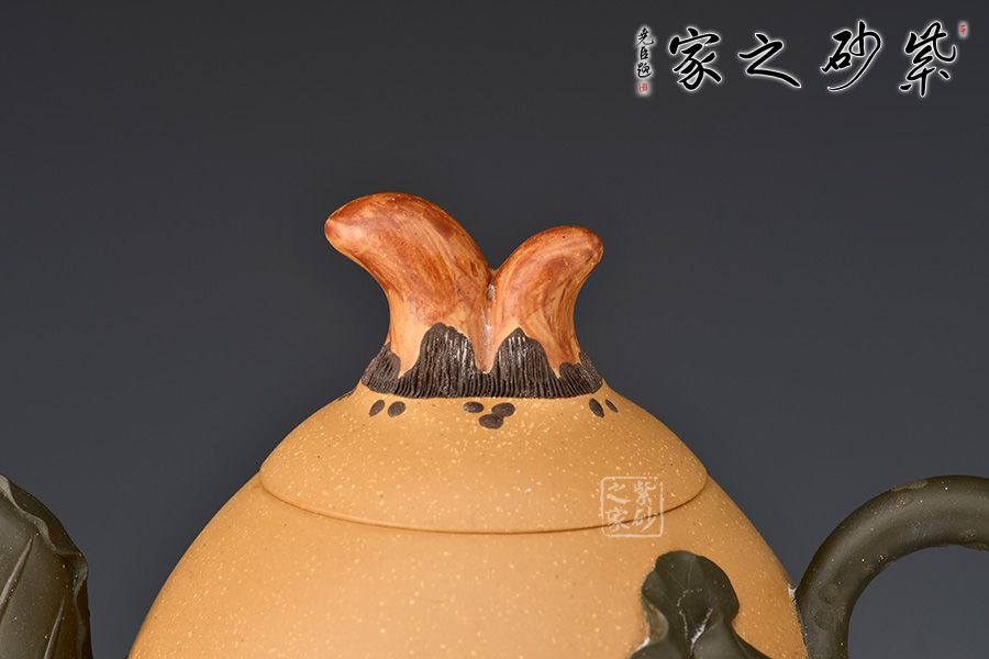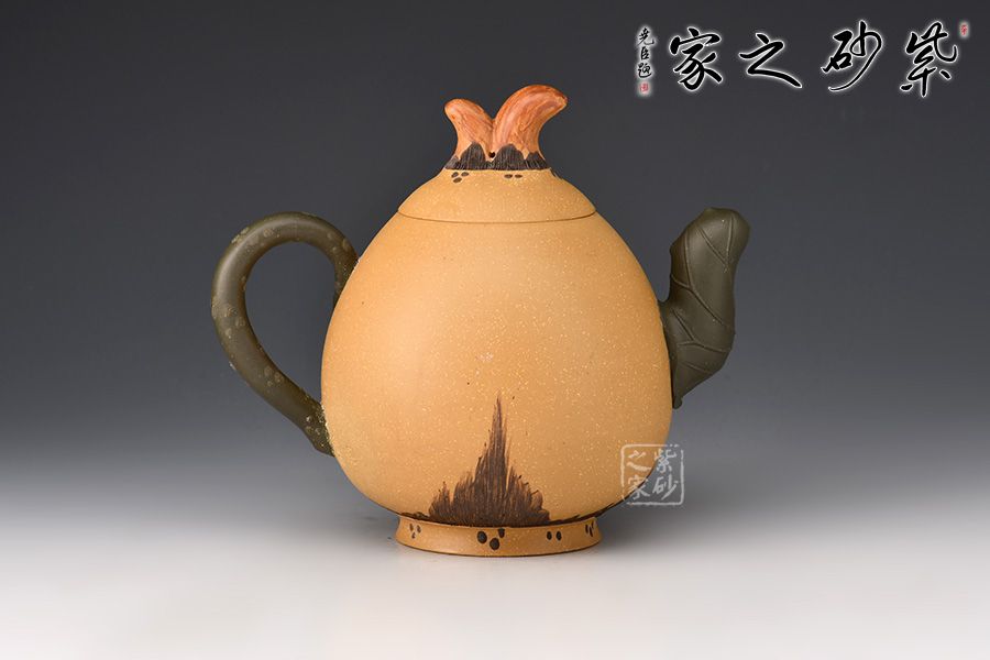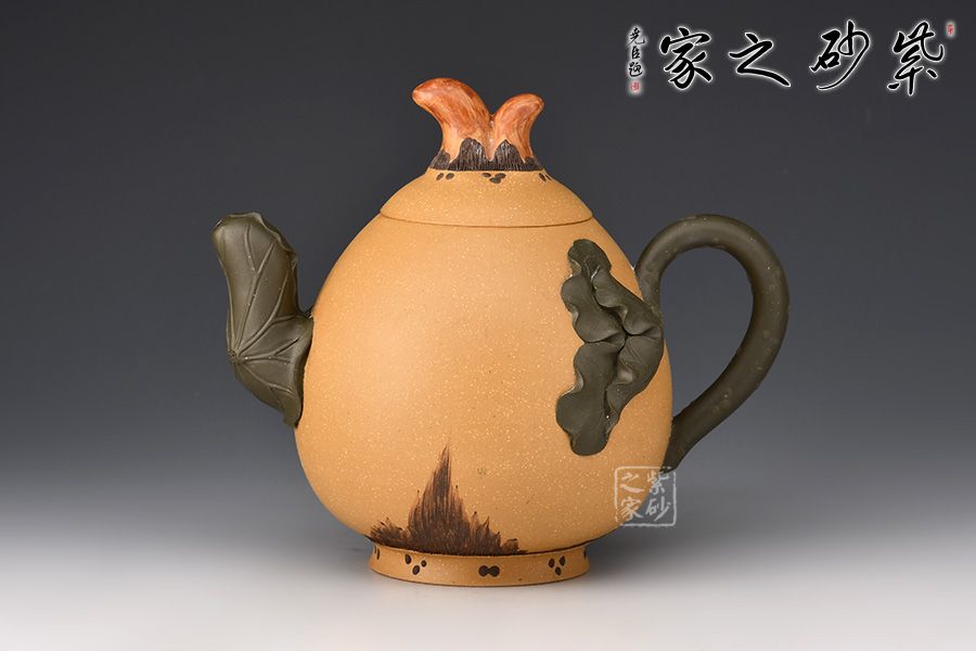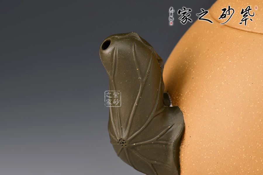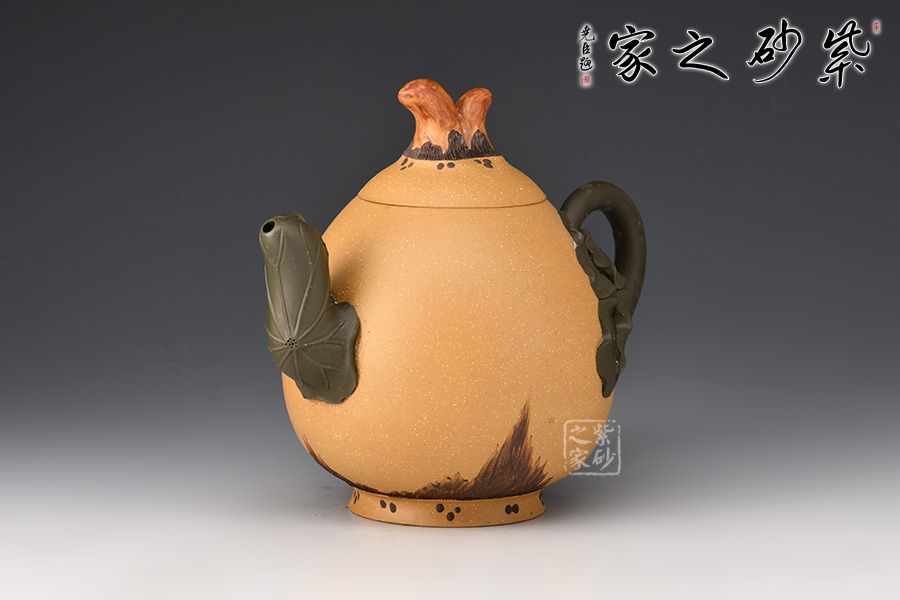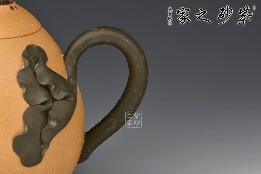 該壺構(gòu)思新奇,其巧形塑器,巧色點(diǎn)綴,提煉概括逼真,秀麗規(guī)整大氣,結(jié)構(gòu)合理適用。器身造型為一節(jié)藕枝,高腳嫩身,且?guī)貉?,為插管式倒裝酒壺,無蓋。一片蓮葉依節(jié)卷起做流,另一蓮梗貼身為把,造型趁勢(shì)。脈、刺梗、荷枝均刻畫的精細(xì)入微。尤其是裝飾變化,別具一格。整壺運(yùn)用多種紫砂技巧,雕塑修飾,著色點(diǎn)彩、粉飾洗染、刻線重合,使作品的形象、色澤及表面的紋理都達(dá)到了出神入化的境界。