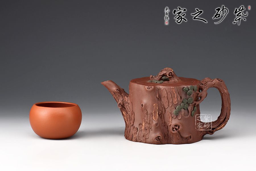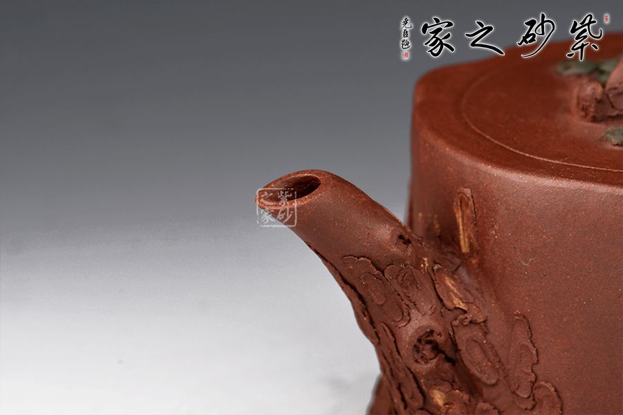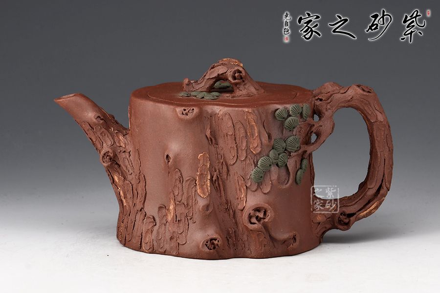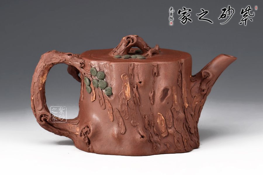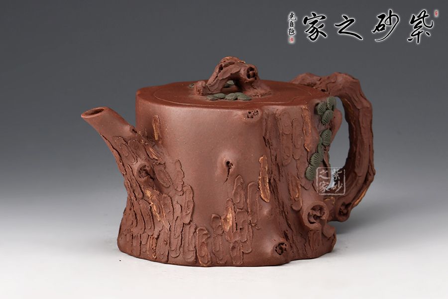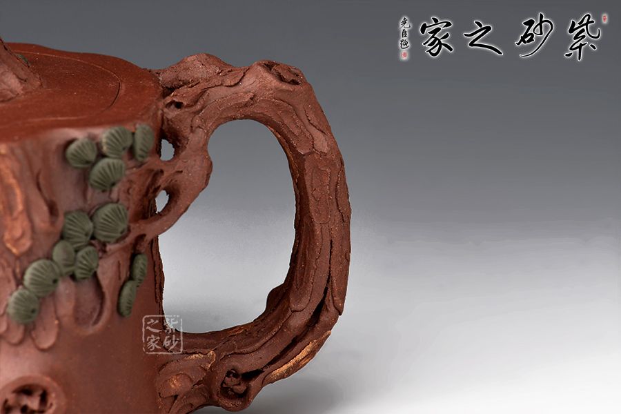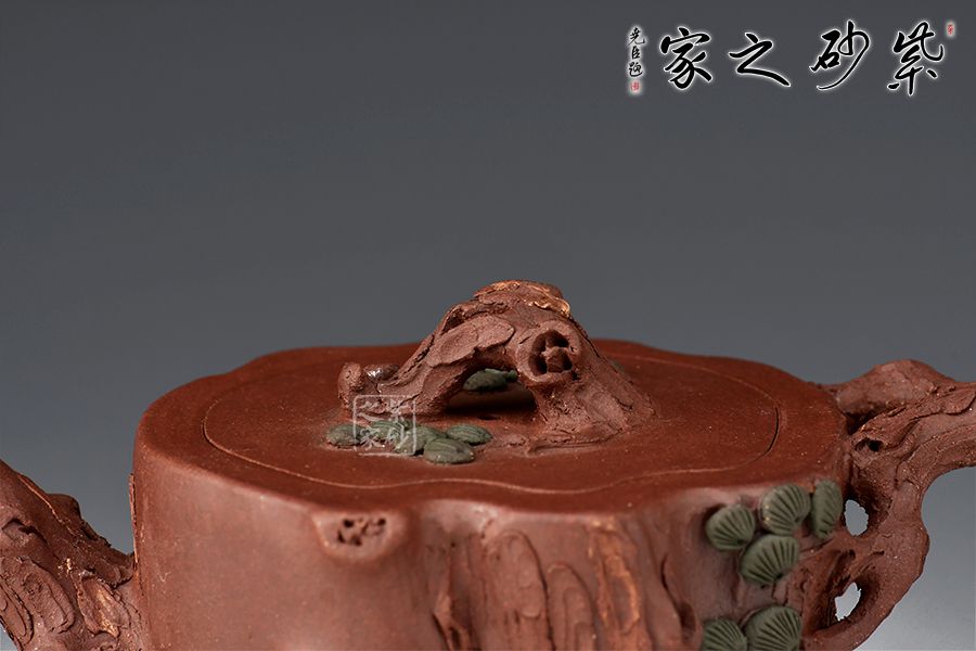 整器泥塑工藝精美,通體作松樹樁形,壺鈕取一截松枝彎折而成,匍匐貼合于蓋面,其上松針刻畫逼真。嘴、把宛若從壺身自然胥出之樹枝,順勢天成,枝干、樹癭描繪入微,壺把枝葉生出松針,貼塑于壺面,生機(jī)盎然。層層迭迭的紋路相互交織相融,將古松斑駁卻又不失蒼勁的質(zhì)感塑造得惟妙惟肖,雕琢精細(xì)極致,松之古樸雅韻、深厚內(nèi)蘊(yùn)在此盡現(xiàn),是一把欣賞、把玩、使用皆宜的花器佳作。