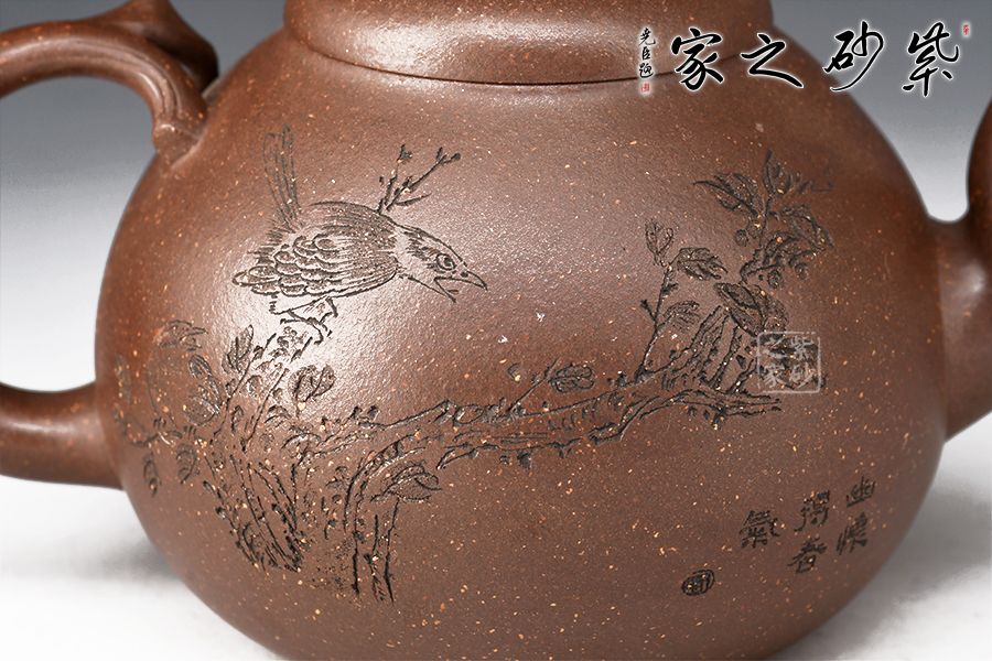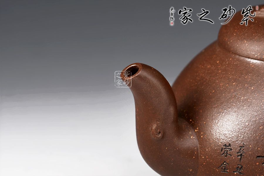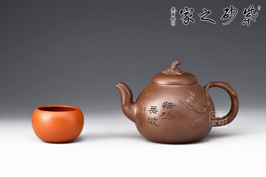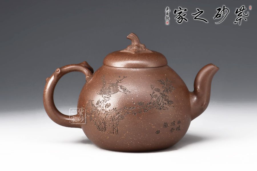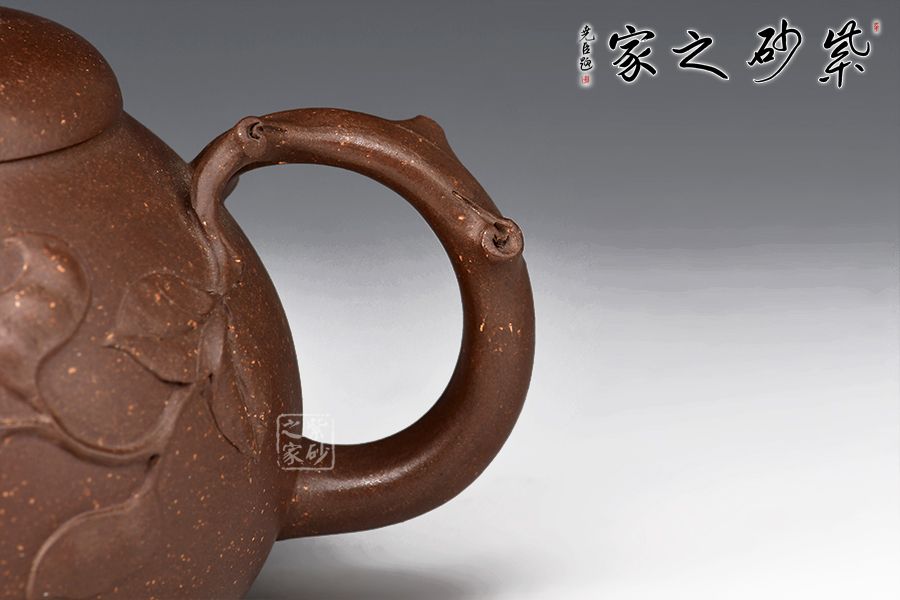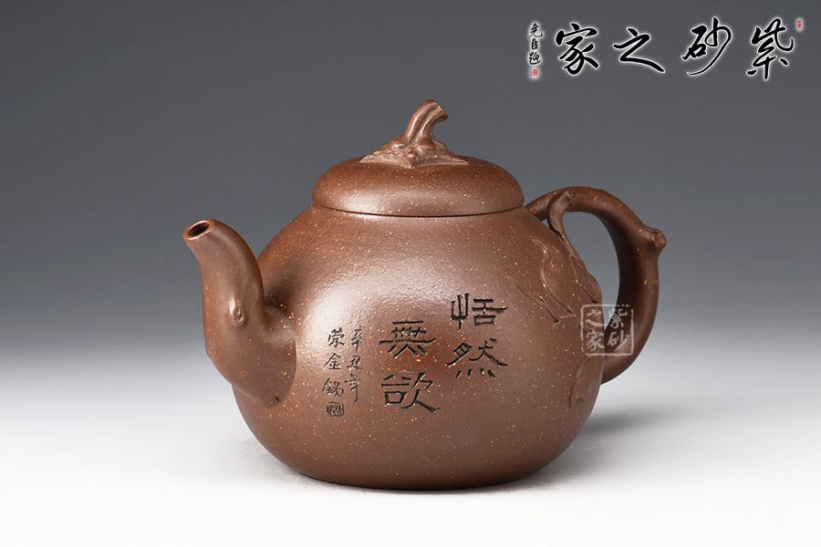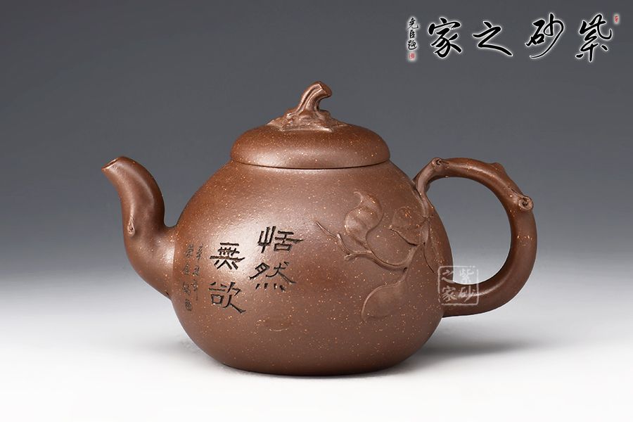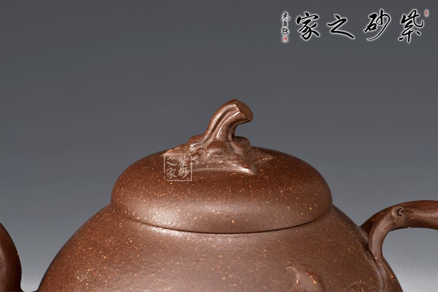 此壺壺形飽滿圓潤,像一顆豐滿鼓起的蜜瓜,加之壺身上的葉片裝飾,形象生動,仿若能感受到它的清香甜美之味,壺嘴和會把均融入了枝干元素,凹凸不平,撫摸上去更顯真實(shí)之感。壺鈕為如瓜蒂,逼真自如。整壺工藝精到,將富有的自然之美賦于紫砂之上,這是紫砂與自然的頌歌。