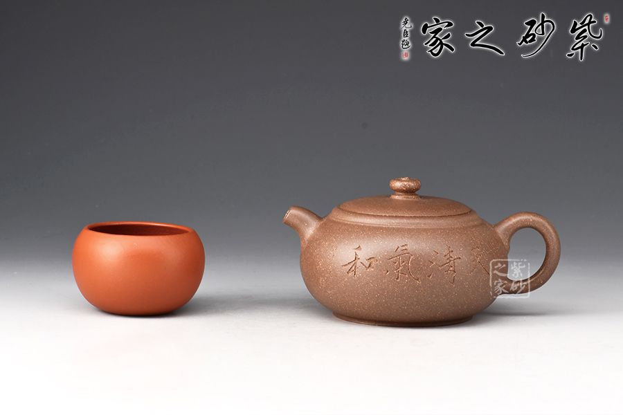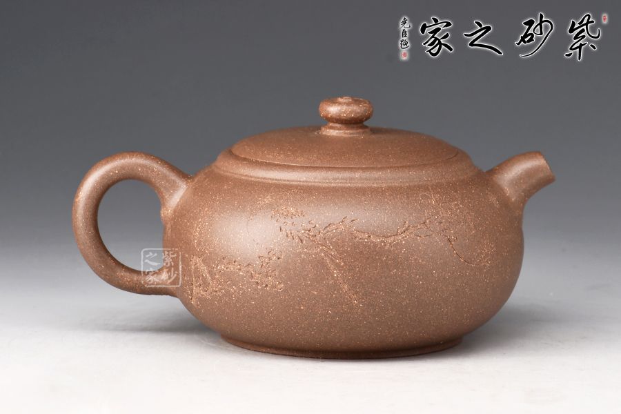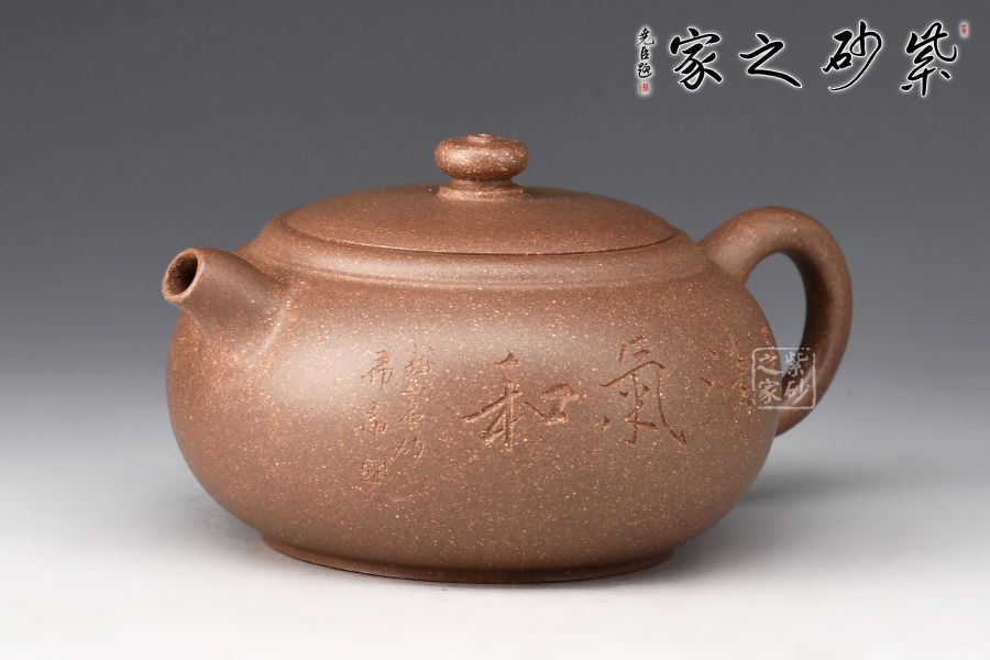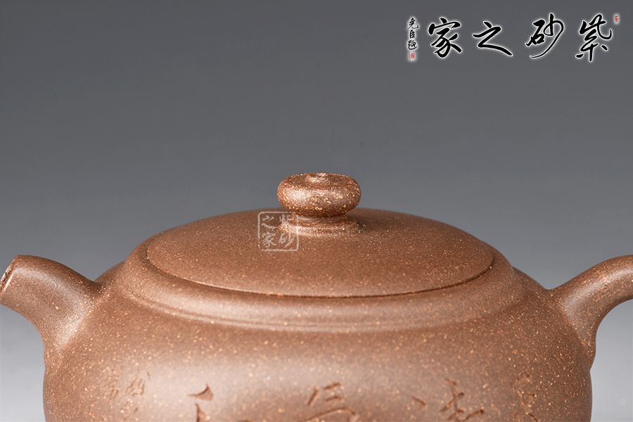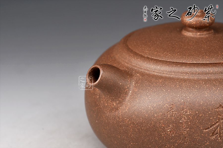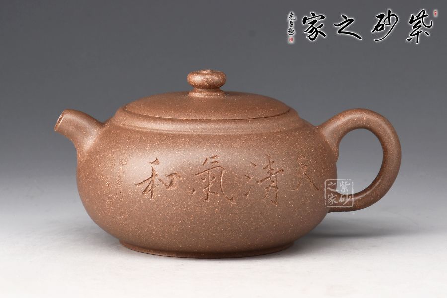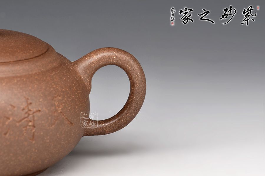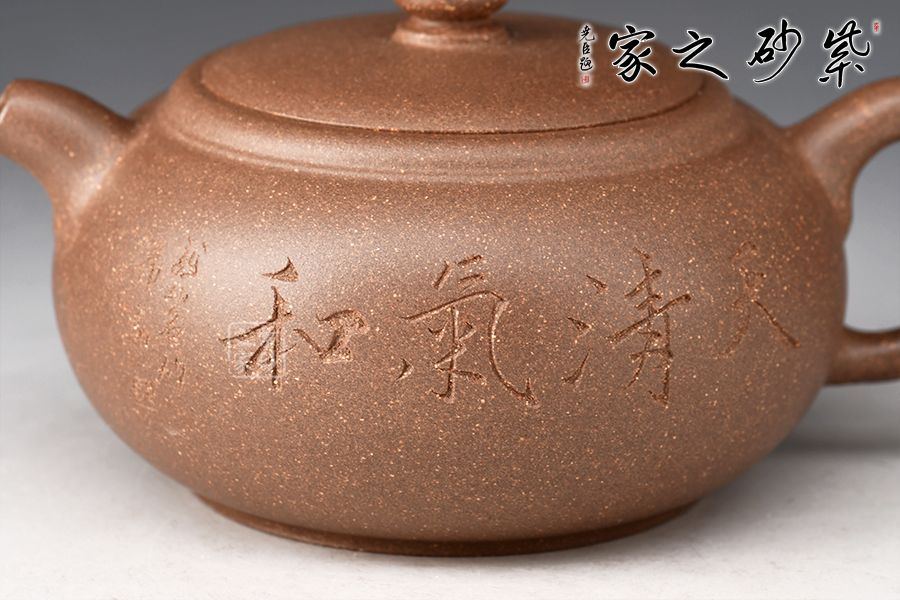 整壺圓潤(rùn)充實(shí),以曲線(xiàn)構(gòu)成主體形式,自壺鈕、蓋、身,沒(méi)有硬性的折線(xiàn)和角,一彎壺嘴,出水爽利。耳形圈把暗接精湛,把體豐盈,過(guò)渡有致,蓋與口吻合,圓鈕觸覺(jué)舒適。壺身陶刻裝飾,字體飄逸自然, 古雅大氣,深厚的文化底蘊(yùn)顯于壺中,該壺集實(shí)用和觀賞把玩于一體,值得收藏。