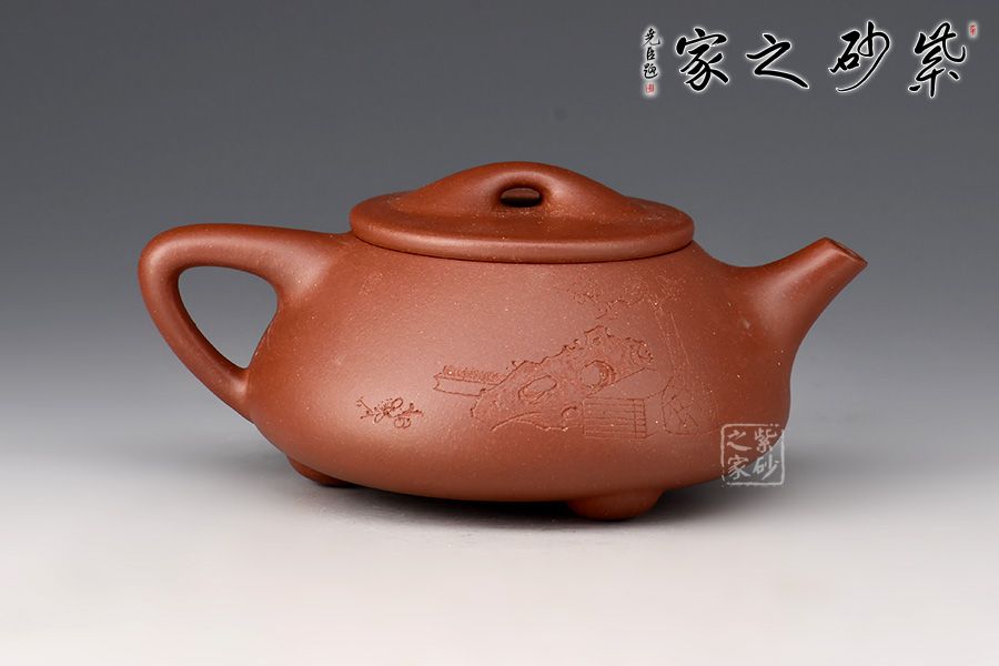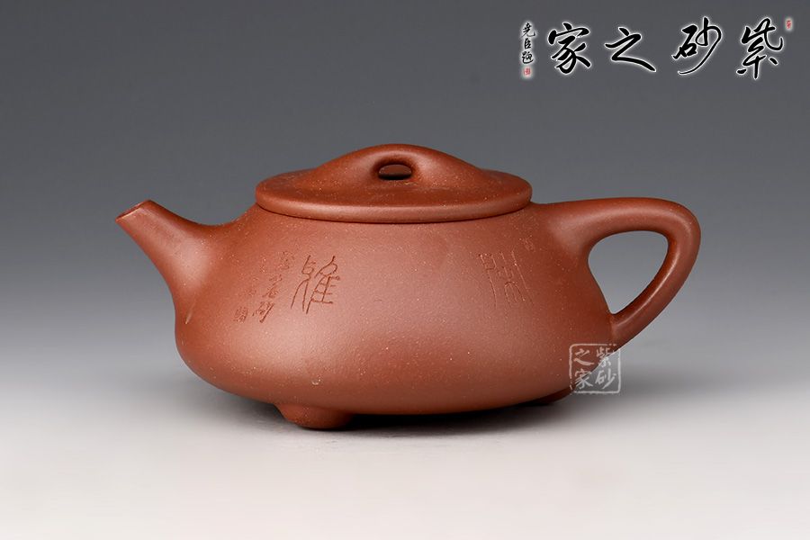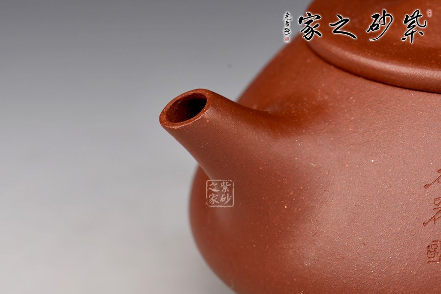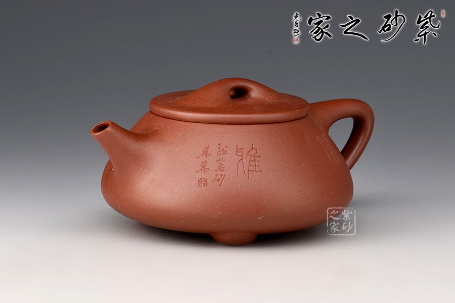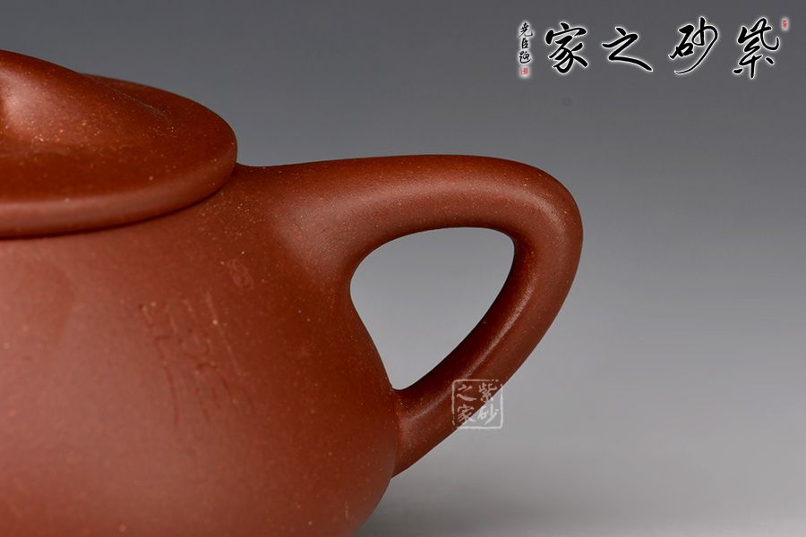 此壺取經(jīng)典石瓢之型,全手工精制而成,造型骨肉亭勻,簡約大方,壺身豐潤飽滿,平壓蓋、橋鈕,投茶、揭拿便利。直流簡而有力,出水爽利,倒三角壺把,上豐下斂,比例和諧。