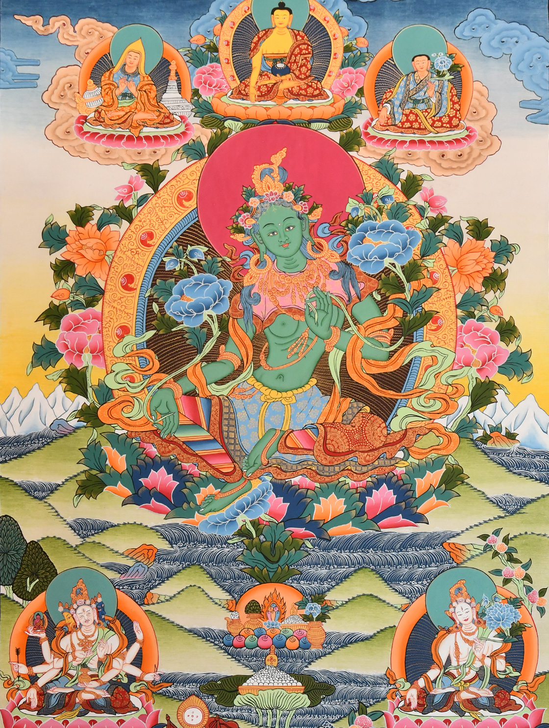 | 唐卡是歷史的瑰寶,現已被例入國家非物質文化遺產名錄,得到了高度的重視和保護。同時由于顏料的珍稀、繪制周期長、工藝復雜大大增強了其珍藏價值。一幅好的作品可遇不可求,近年來唐卡已成為收藏界炙手可熱的藏品。 | 唐卡的形式便于攜帶,其內容體現了藏傳佛教的莊重、神圣、華貴,被稱為“移動的佛像”。同時也是修行者積累善業,追尋心靈的平靜與安寧的一個過程。 | 唐卡的內容包羅萬象,它以圖像的方式承載著藏族文化精髓,是藏族智慧的結晶,廣泛傳播了藏地的文化、歷史和宗教理論。 | 唐卡絢麗的色彩、流暢的線條、嚴謹的結構,都充滿著濃郁的高原和游牧民族風情,無疑是難得的藝術珍品。值得一提的是唐卡繪制顏料全部為天然礦物顏料,畫面效果艷麗,可以保存千年而不變色。 |