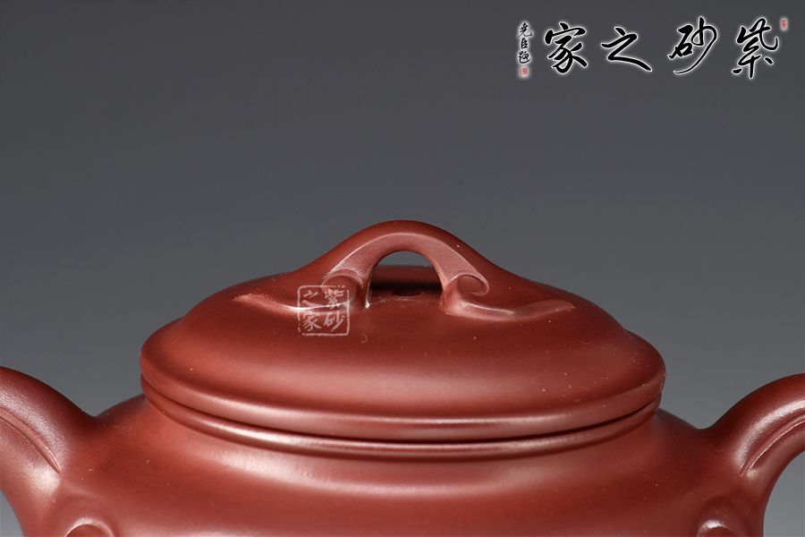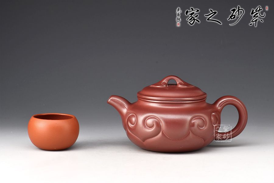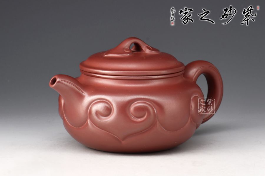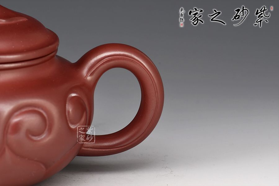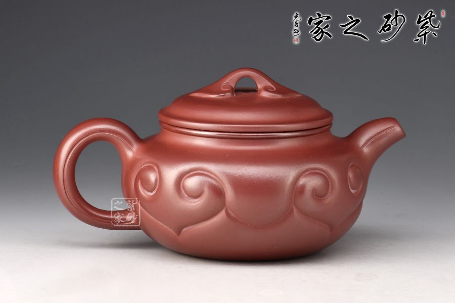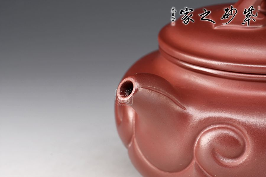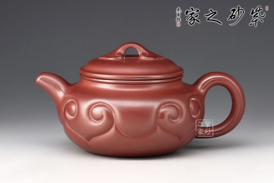 以龍血砂泥作胎精工而制,泥色古樸雅致。壺身扁圓豐滿,鼓腹,短頸,壓蓋微微隆起,線條富有張力。一彎流自然胥出,出水爽利,圓圈把勻勢而起,持握舒適。壺身刻如意紋飾,紋路清晰流暢,線條延伸至流、把,氣韻貫通,橋鈕亦作如意裝飾。整器和諧統(tǒng)一,線條收展有度,造型端莊大氣,彰顯典雅之美,430cc黃金容量,實為品茗實用佳器。